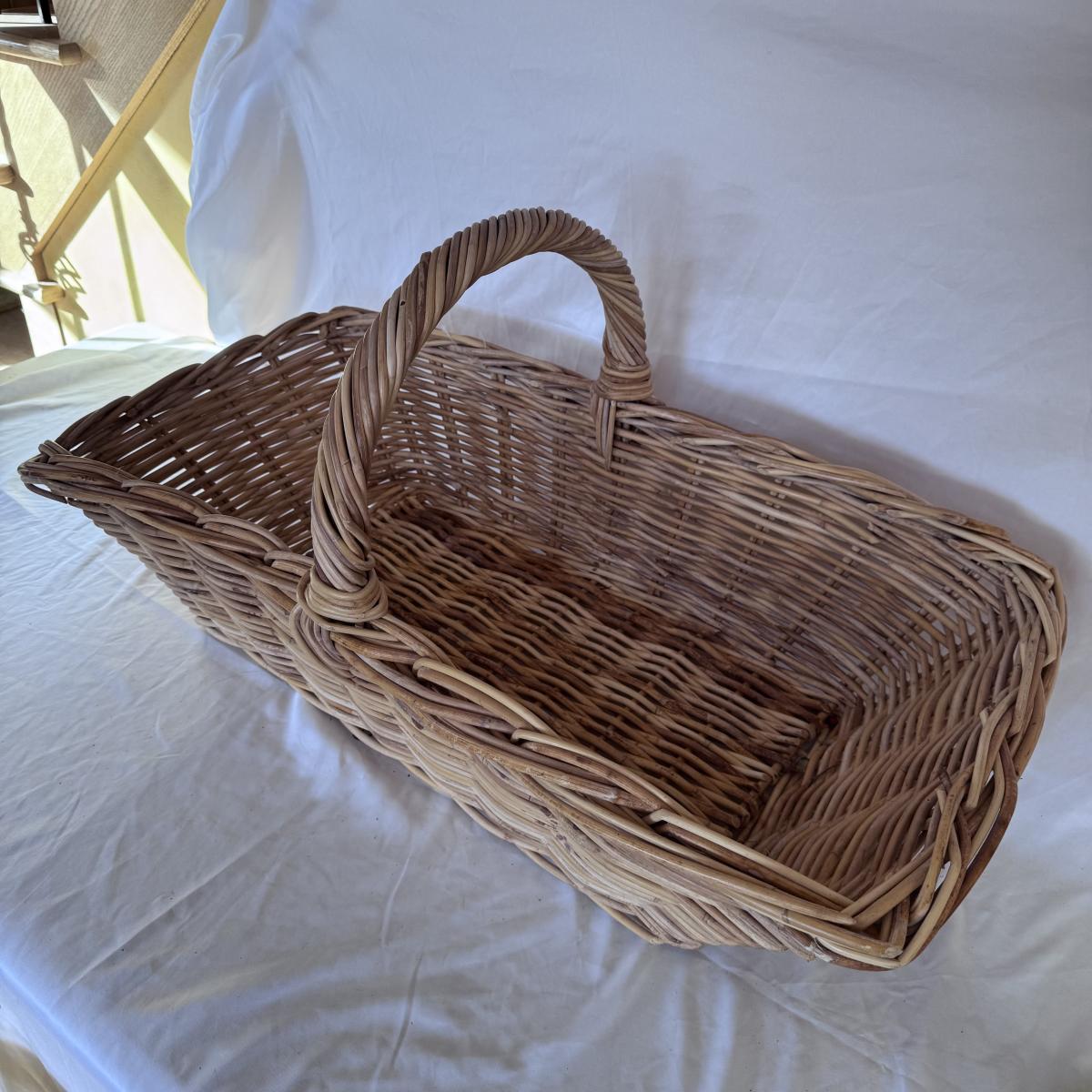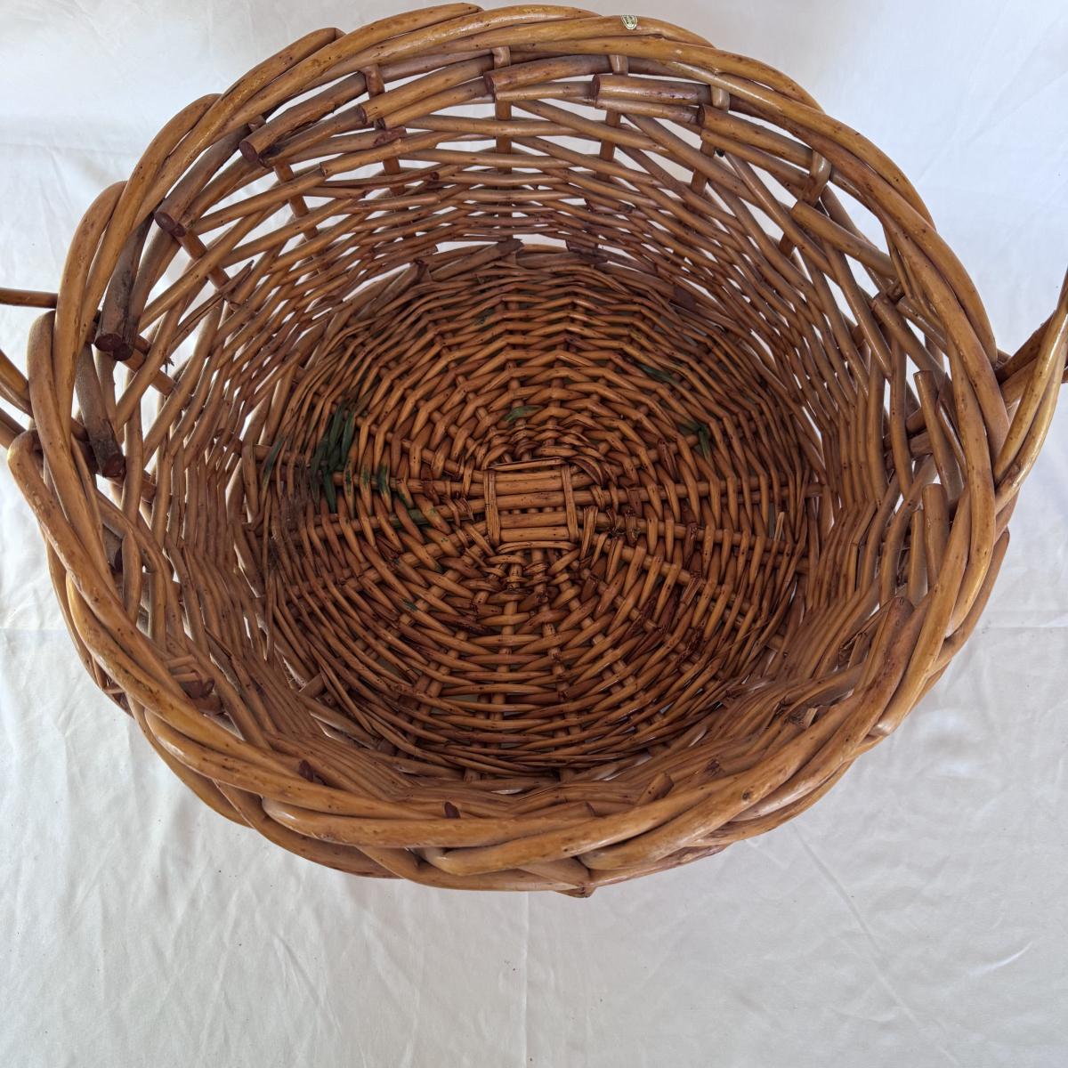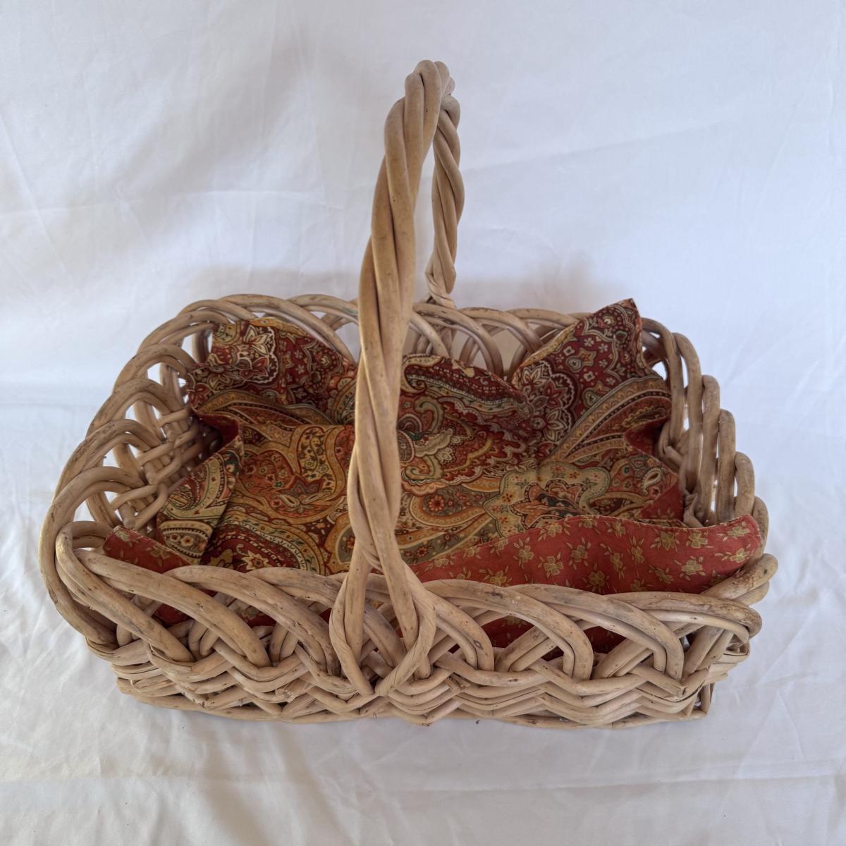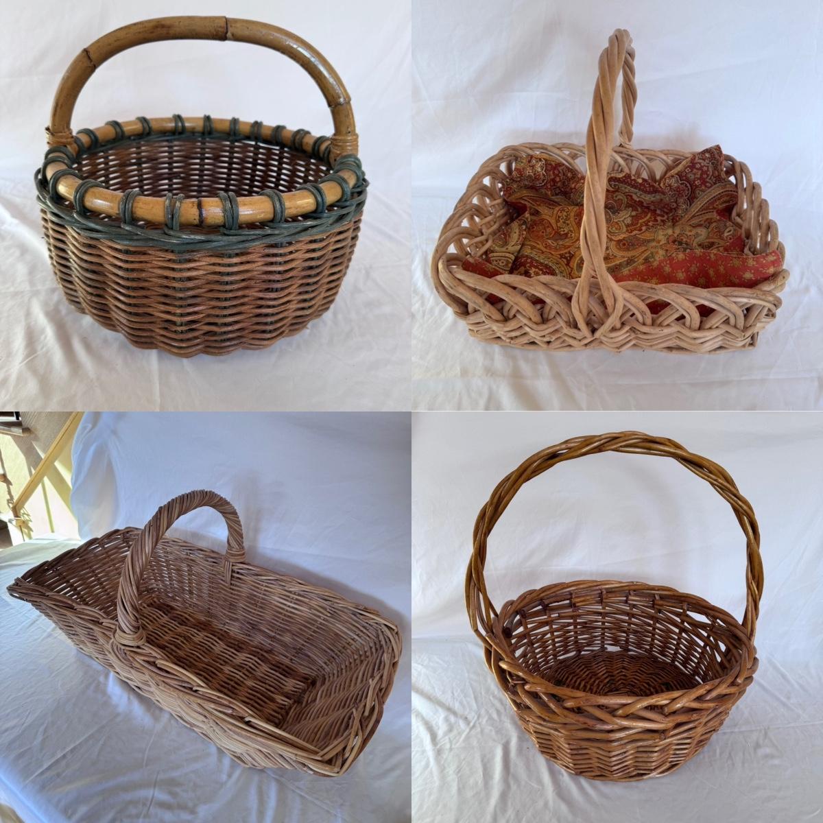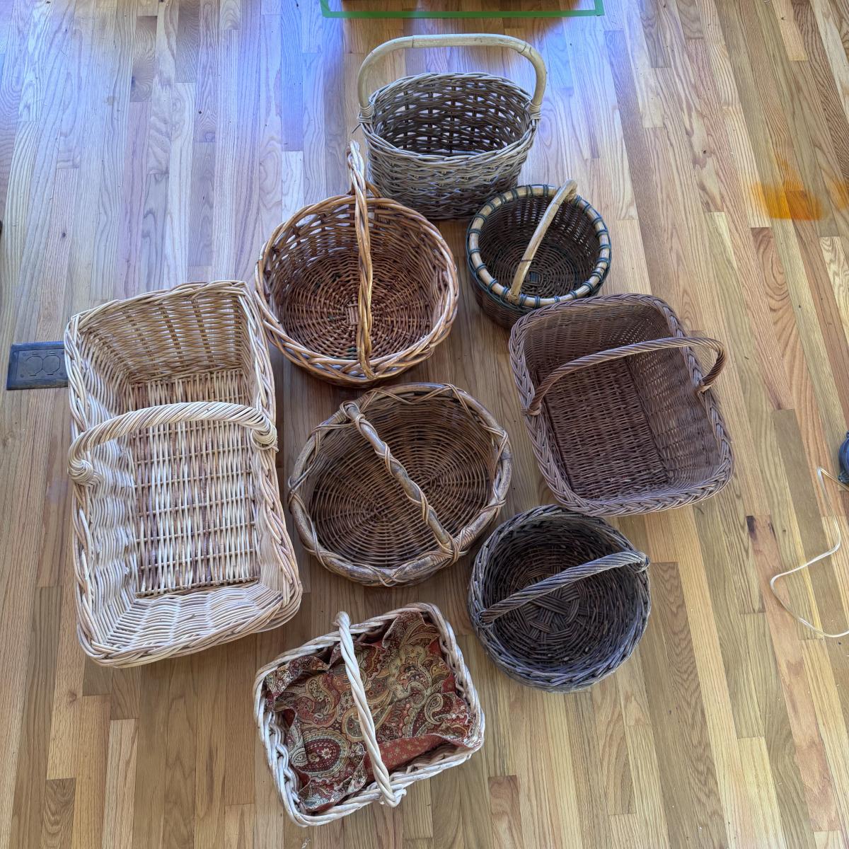 This lot includes eight wicker baskets in different sizes. All baskets have a handle and one even has a small cloth that is removable. The largest basket measures 16” x 29” x 15”H. Local pickup only.