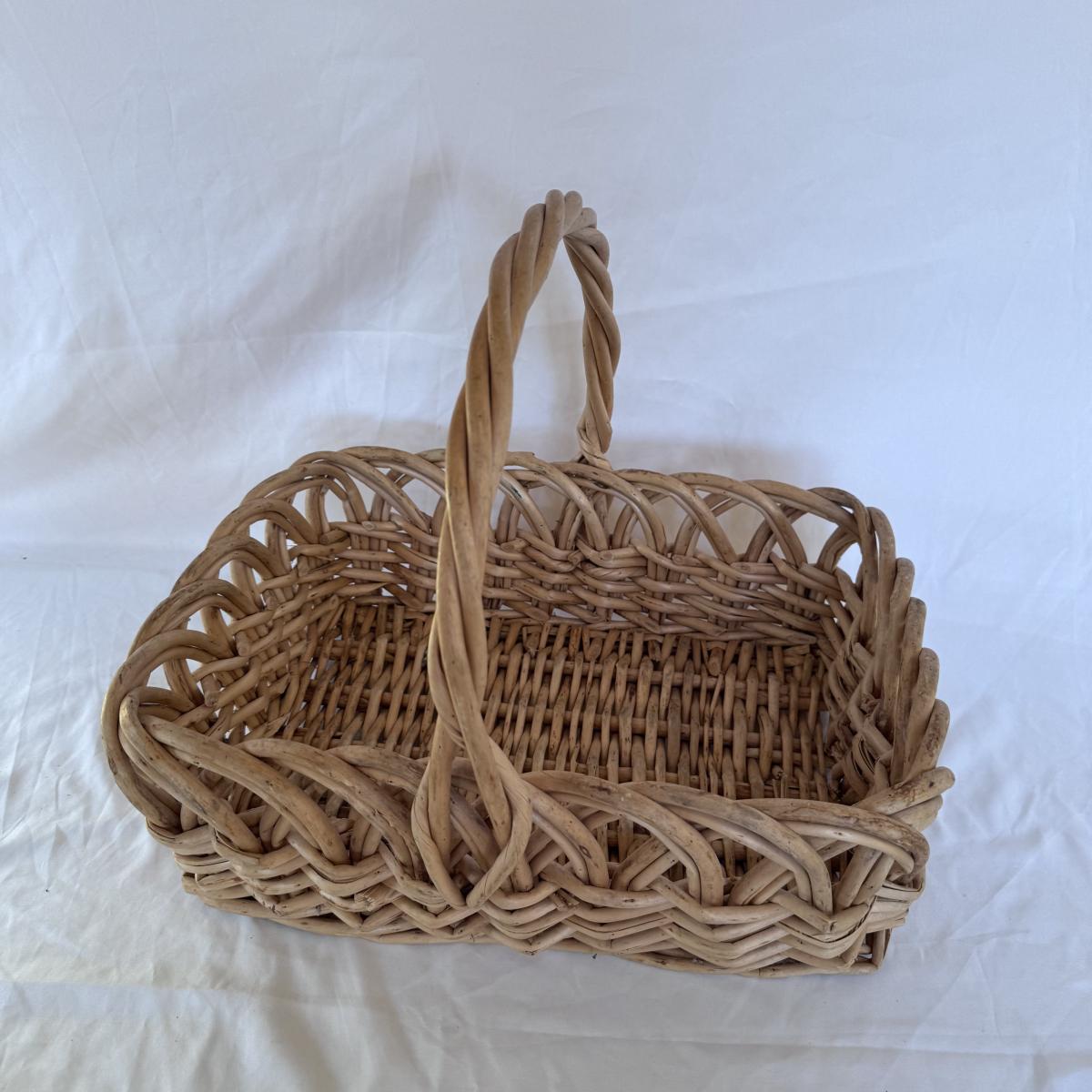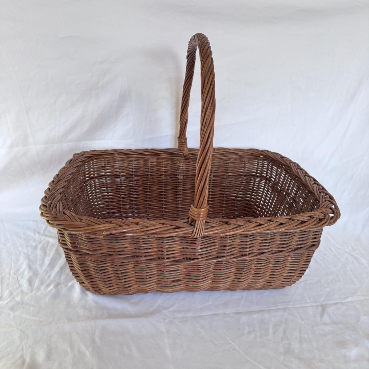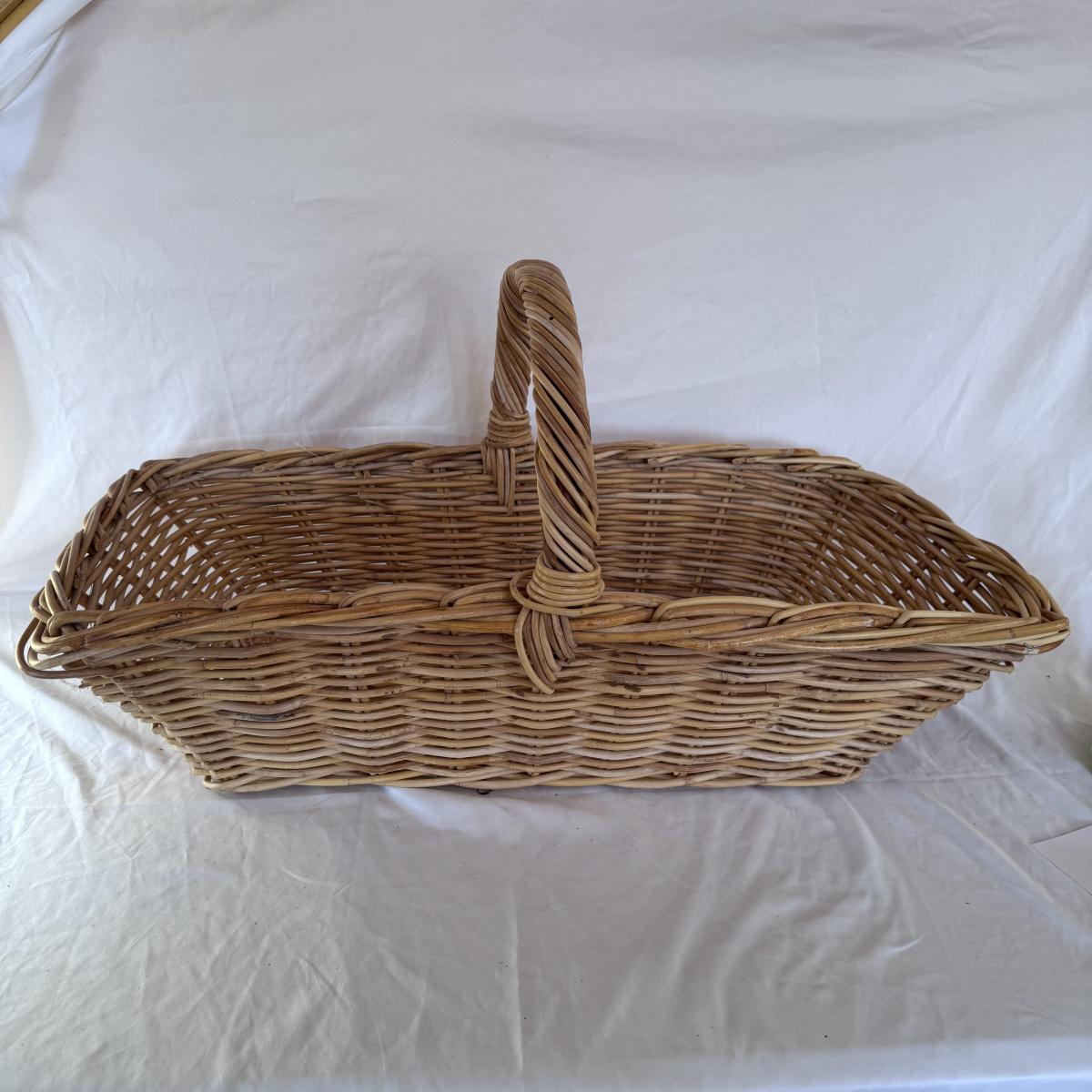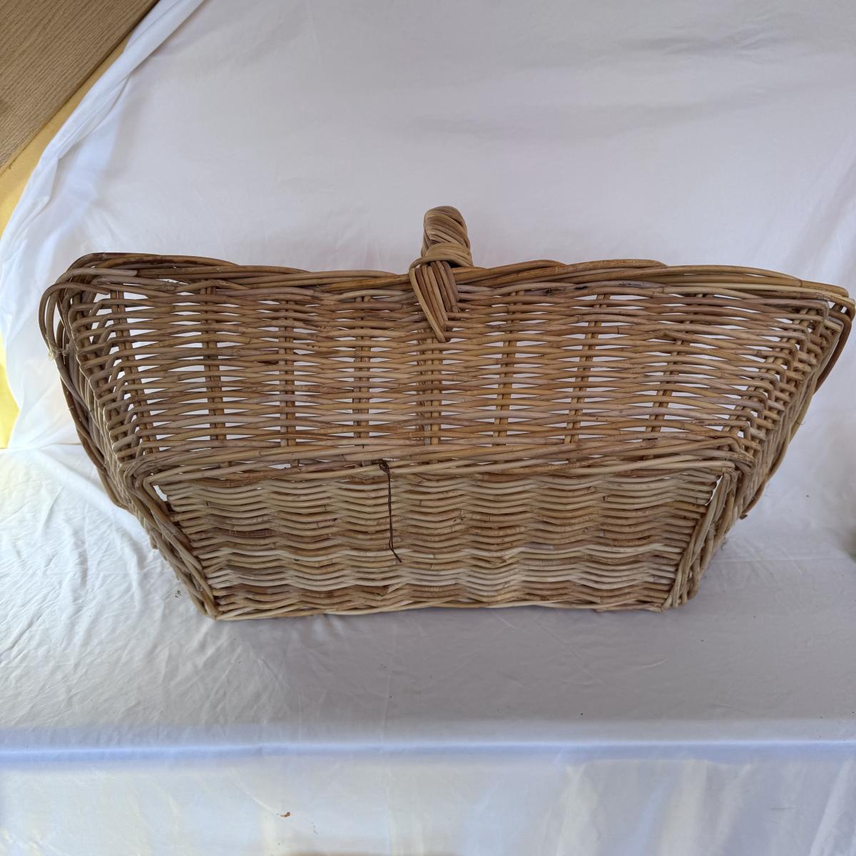 This lot includes eight wicker baskets in different sizes. All baskets have a handle and one even has a small cloth that is removable. The largest basket measures 16” x 29” x 15”H. Local pickup only.