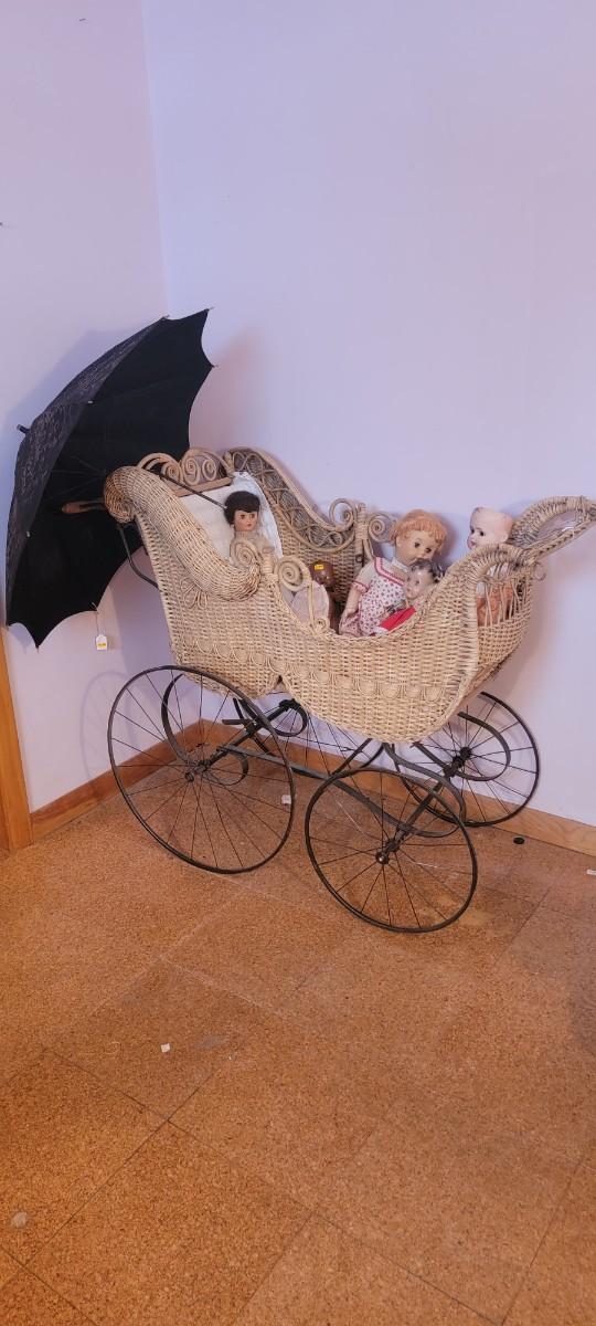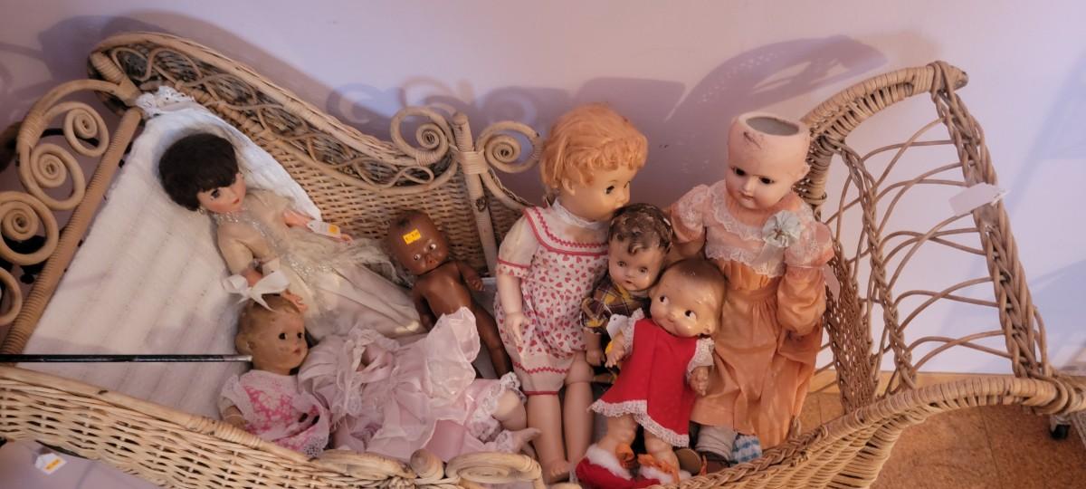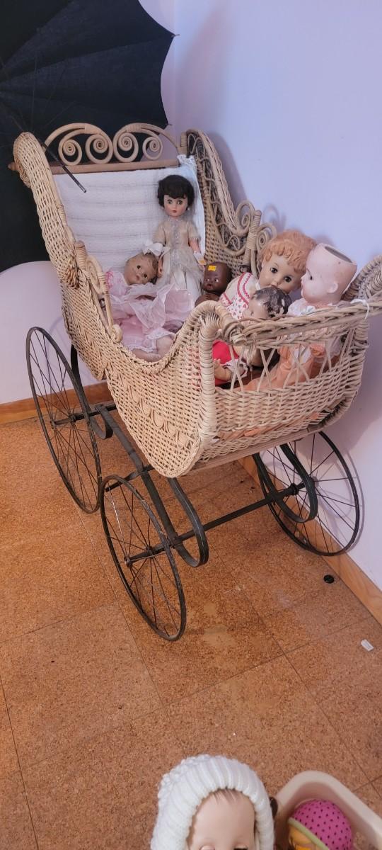 Very cool wicker like carriage with an assortment of vintage dolls.