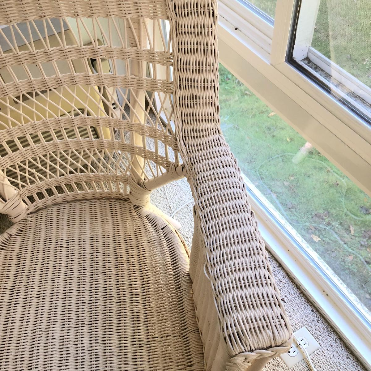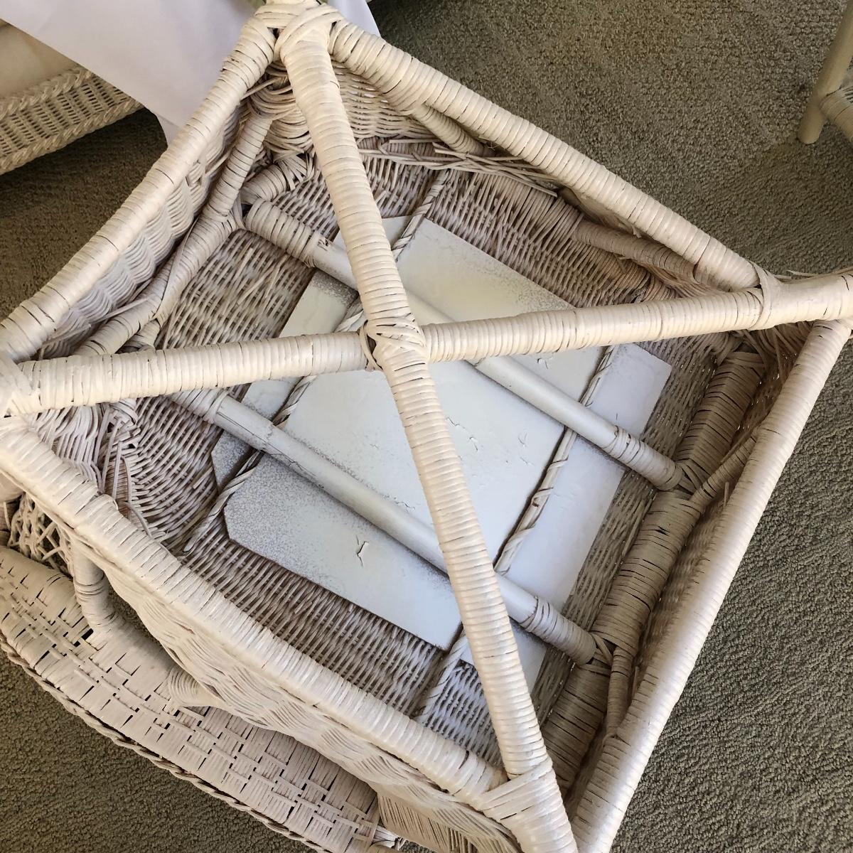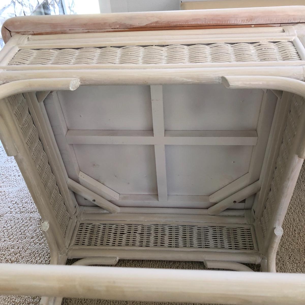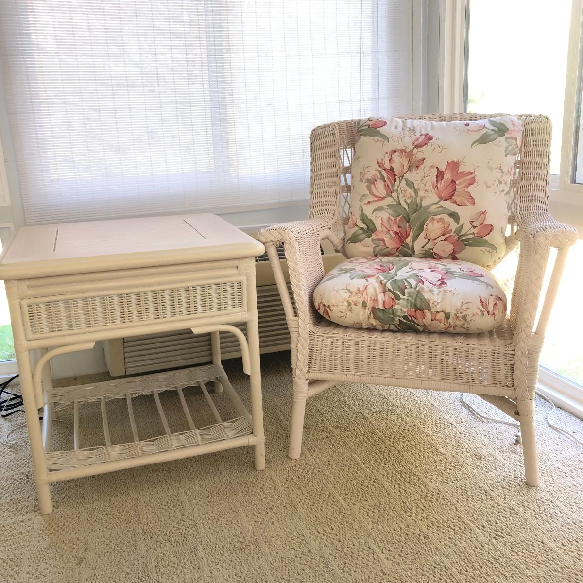 This lot contains a chair with two cushions and a side table. Dimensions of the table are 23.5” x 23.5” x 24”. The table has a solid wood top and wicker sides. The chair is all wicker and measures 30” x 21” 35”. The seat is 14” high without the cushion. With the cushion, it is about 19” high. The wicker on the table looks as if it is all intact. The chair has one broken piece of wicker on the back of the chair (pictured); other than that, it is all intact. Local pick up only.