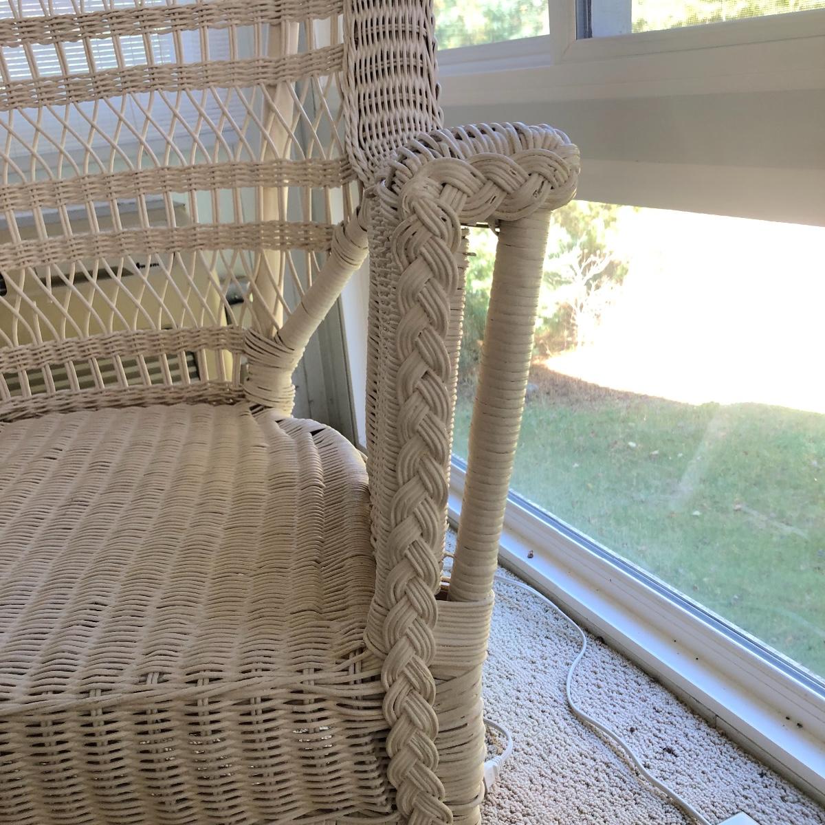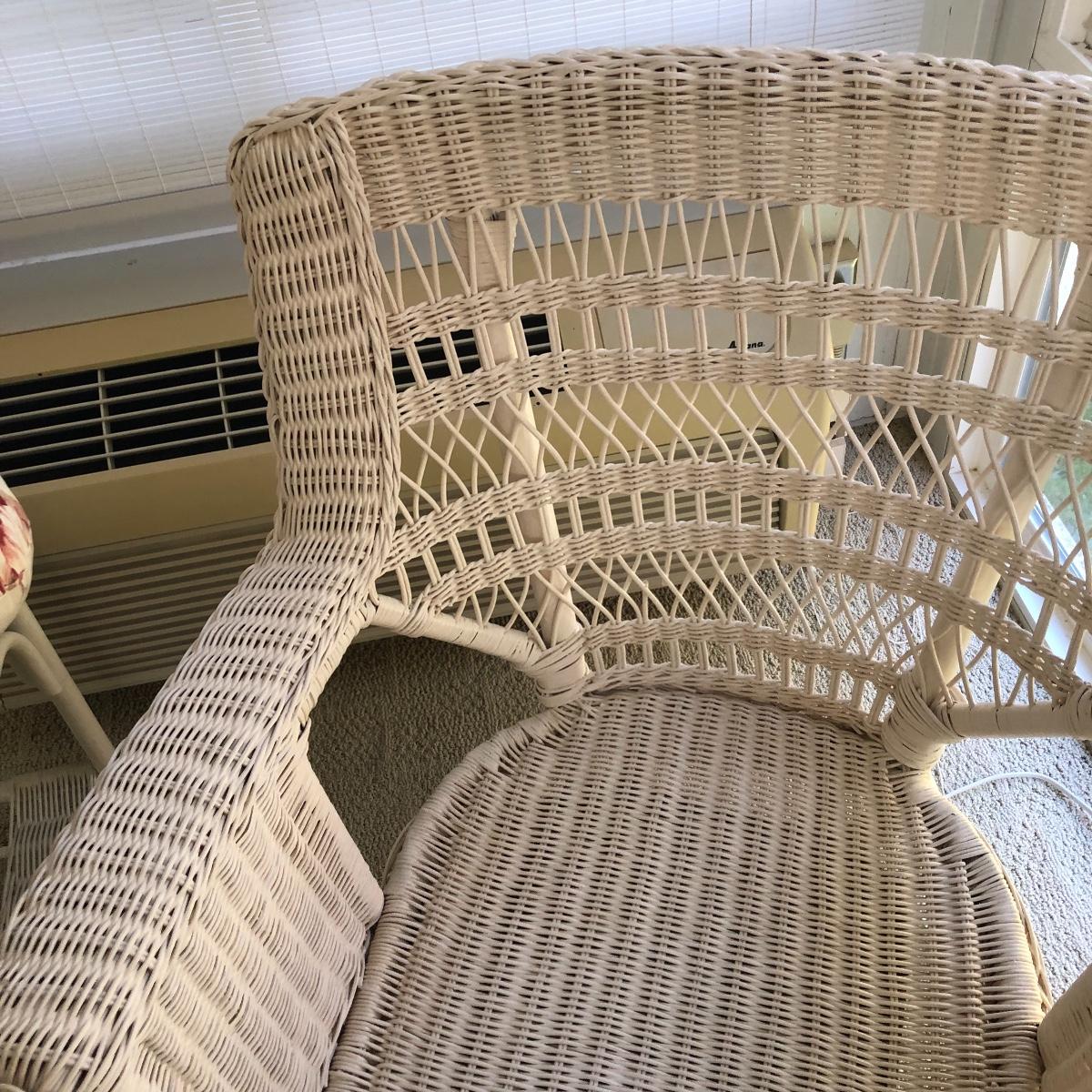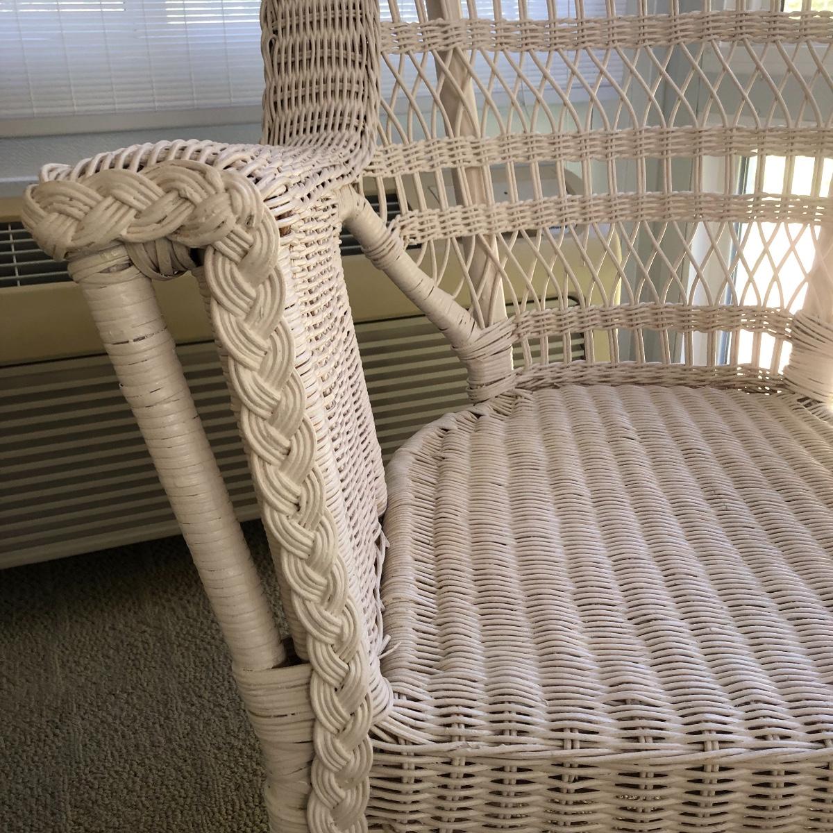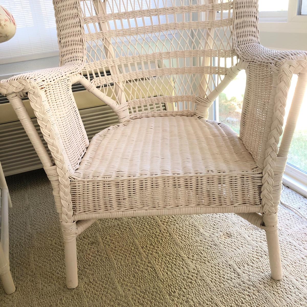 This lot contains a chair with two cushions and a side table. Dimensions of the table are 23.5” x 23.5” x 24”. The table has a solid wood top and wicker sides. The chair is all wicker and measures 30” x 21” 35”. The seat is 14” high without the cushion. With the cushion, it is about 19” high. The wicker on the table looks as if it is all intact. The chair has one broken piece of wicker on the back of the chair (pictured); other than that, it is all intact. Local pick up only.