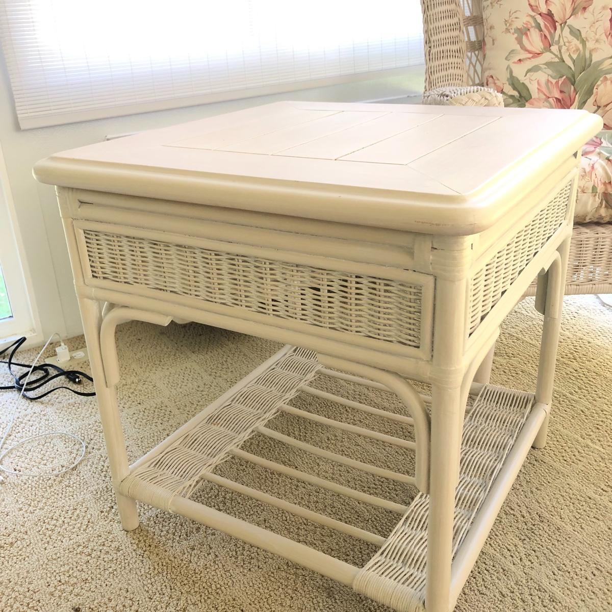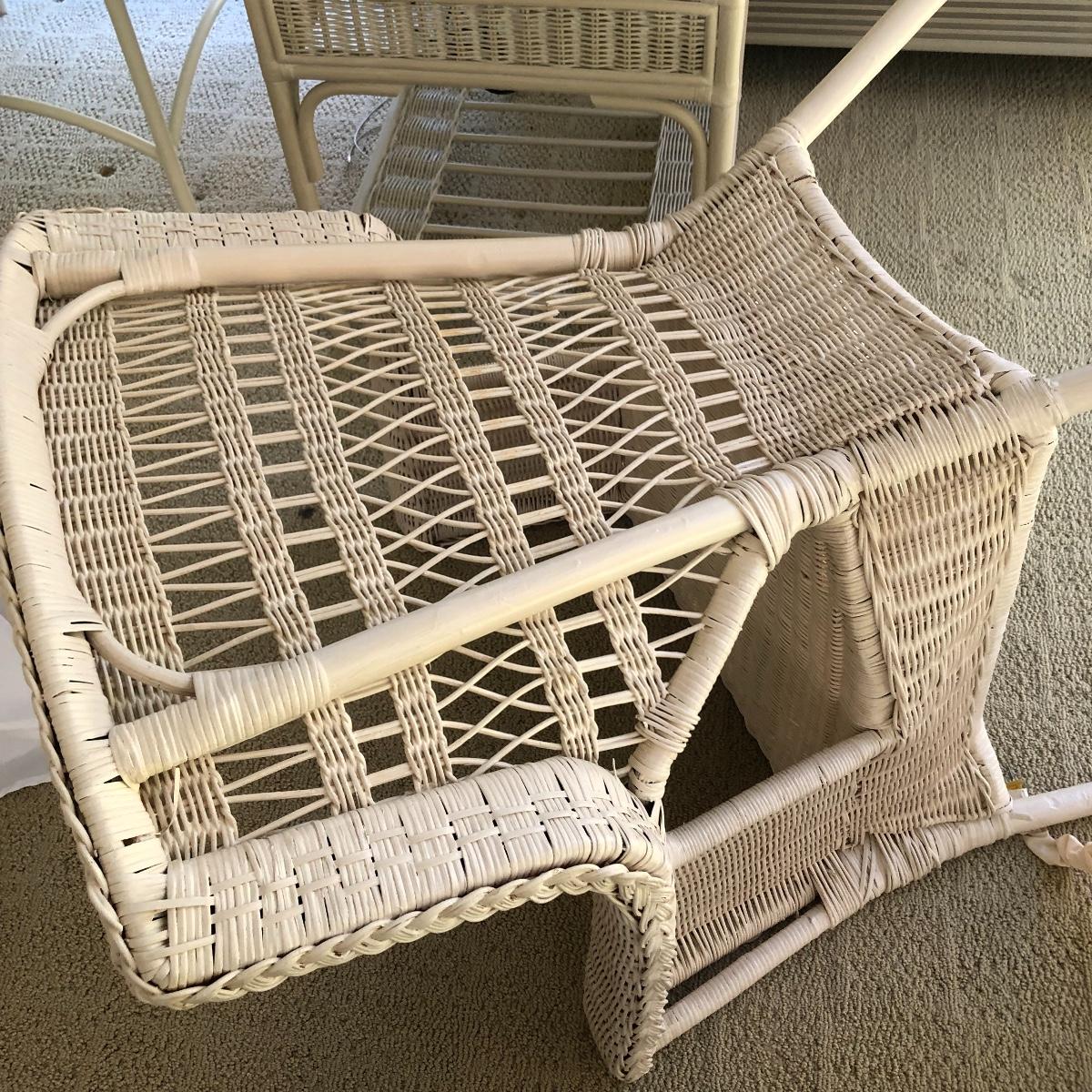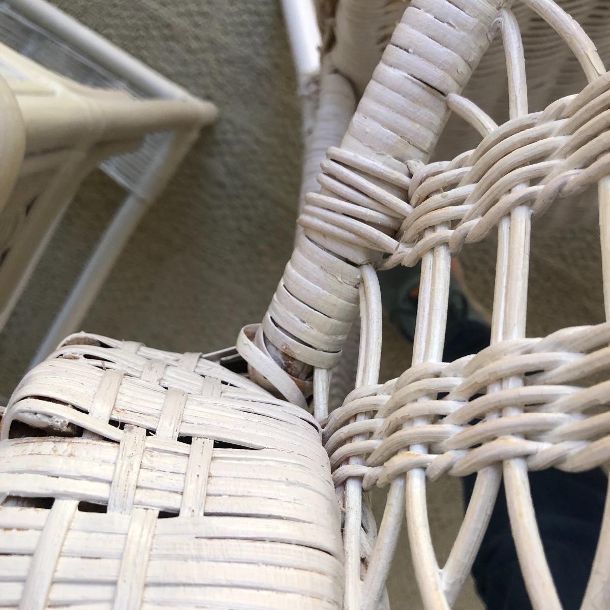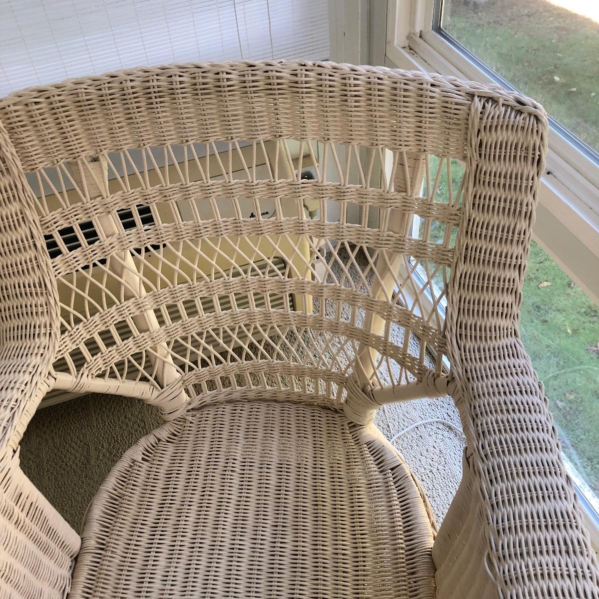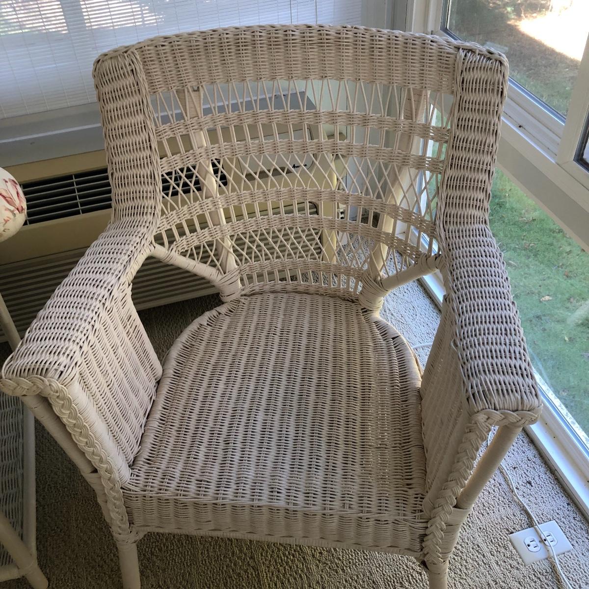 This lot contains a chair with two cushions and a side table. Dimensions of the table are 23.5” x 23.5” x 24”. The table has a solid wood top and wicker sides. The chair is all wicker and measures 30” x 21” 35”. The seat is 14” high without the cushion. With the cushion, it is about 19” high. The wicker on the table looks as if it is all intact. The chair has one broken piece of wicker on the back of the chair (pictured); other than that, it is all intact. Local pick up only.