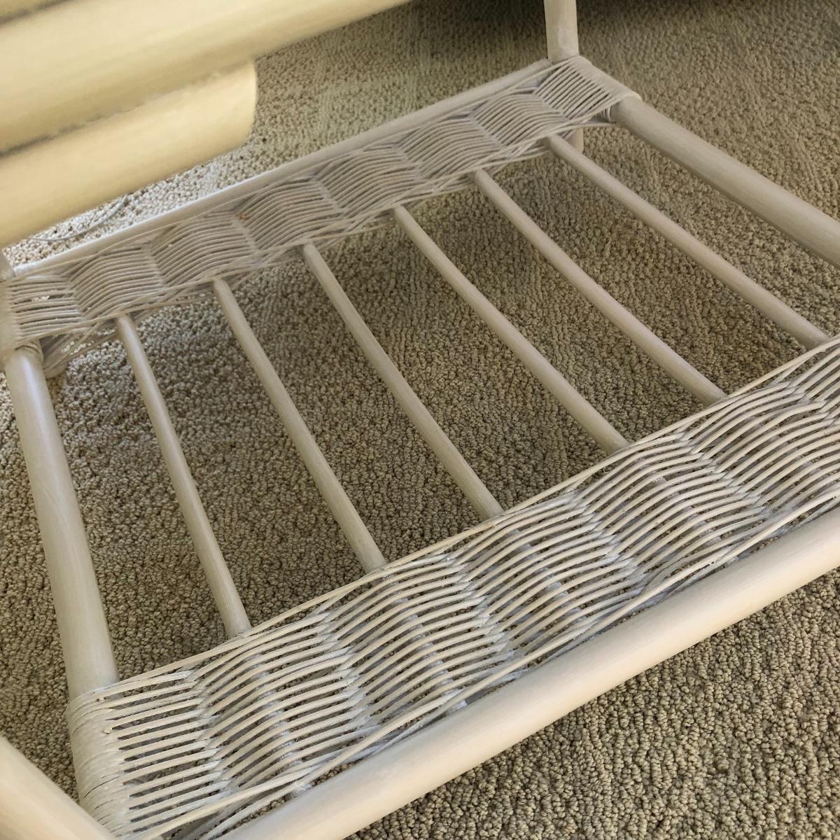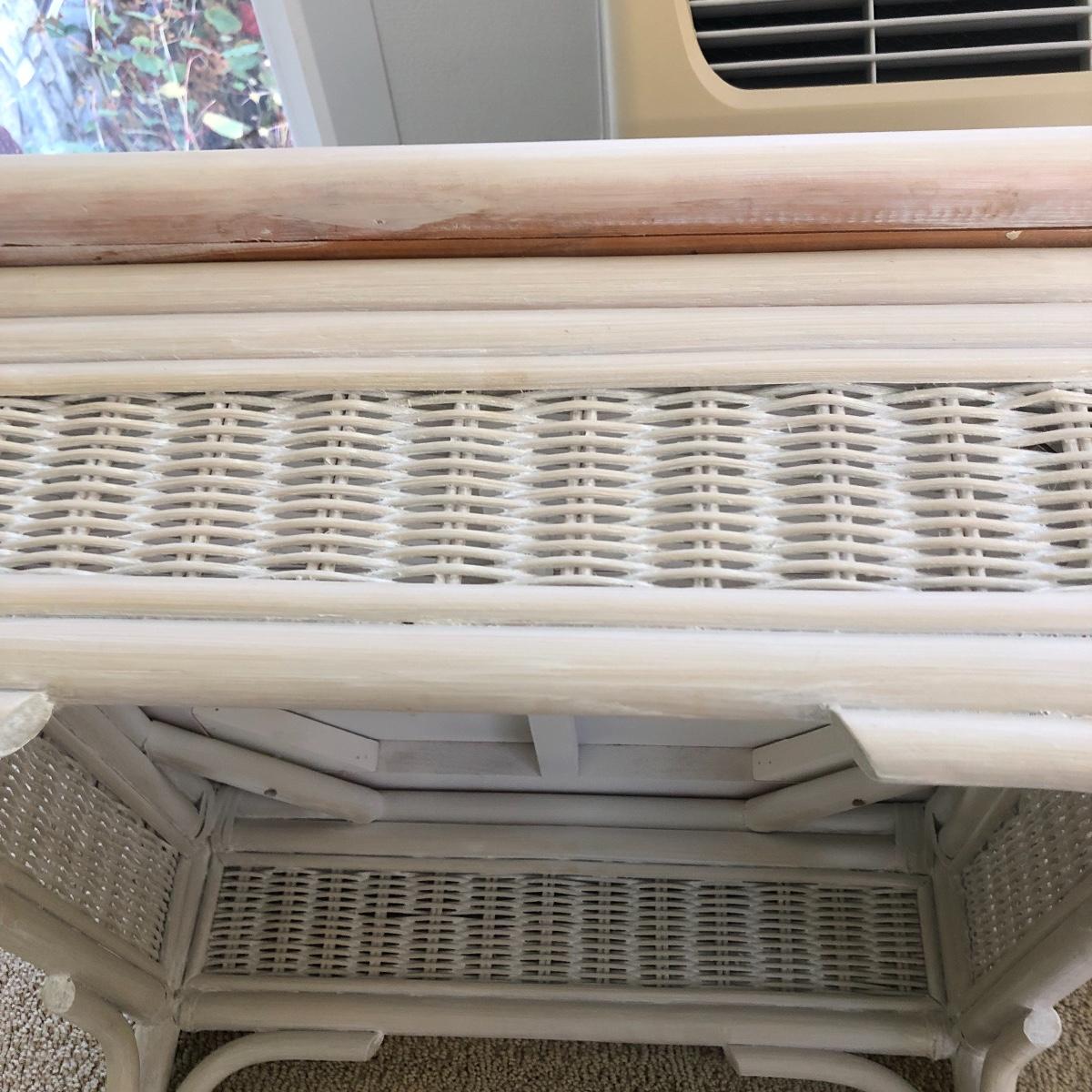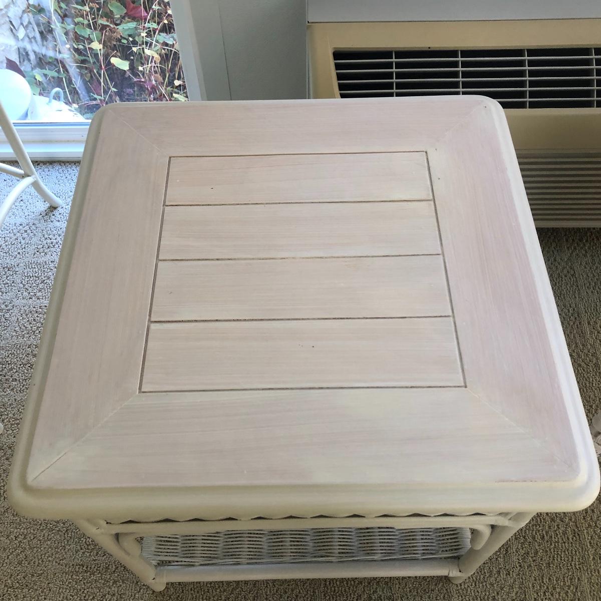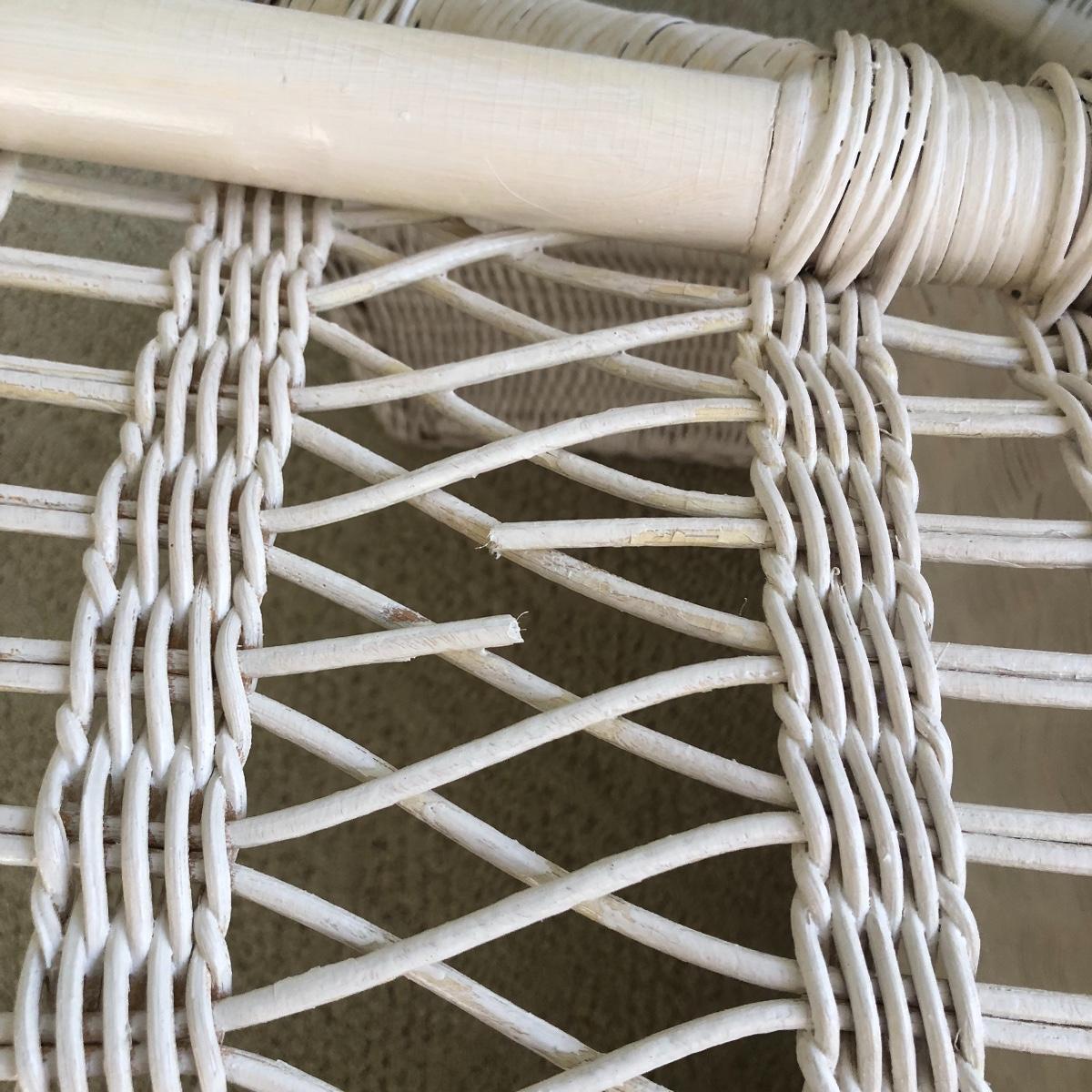 This lot contains a chair with two cushions and a side table. Dimensions of the table are 23.5” x 23.5” x 24”. The table has a solid wood top and wicker sides. The chair is all wicker and measures 30” x 21” 35”. The seat is 14” high without the cushion. With the cushion, it is about 19” high. The wicker on the table looks as if it is all intact. The chair has one broken piece of wicker on the back of the chair (pictured); other than that, it is all intact. Local pick up only.