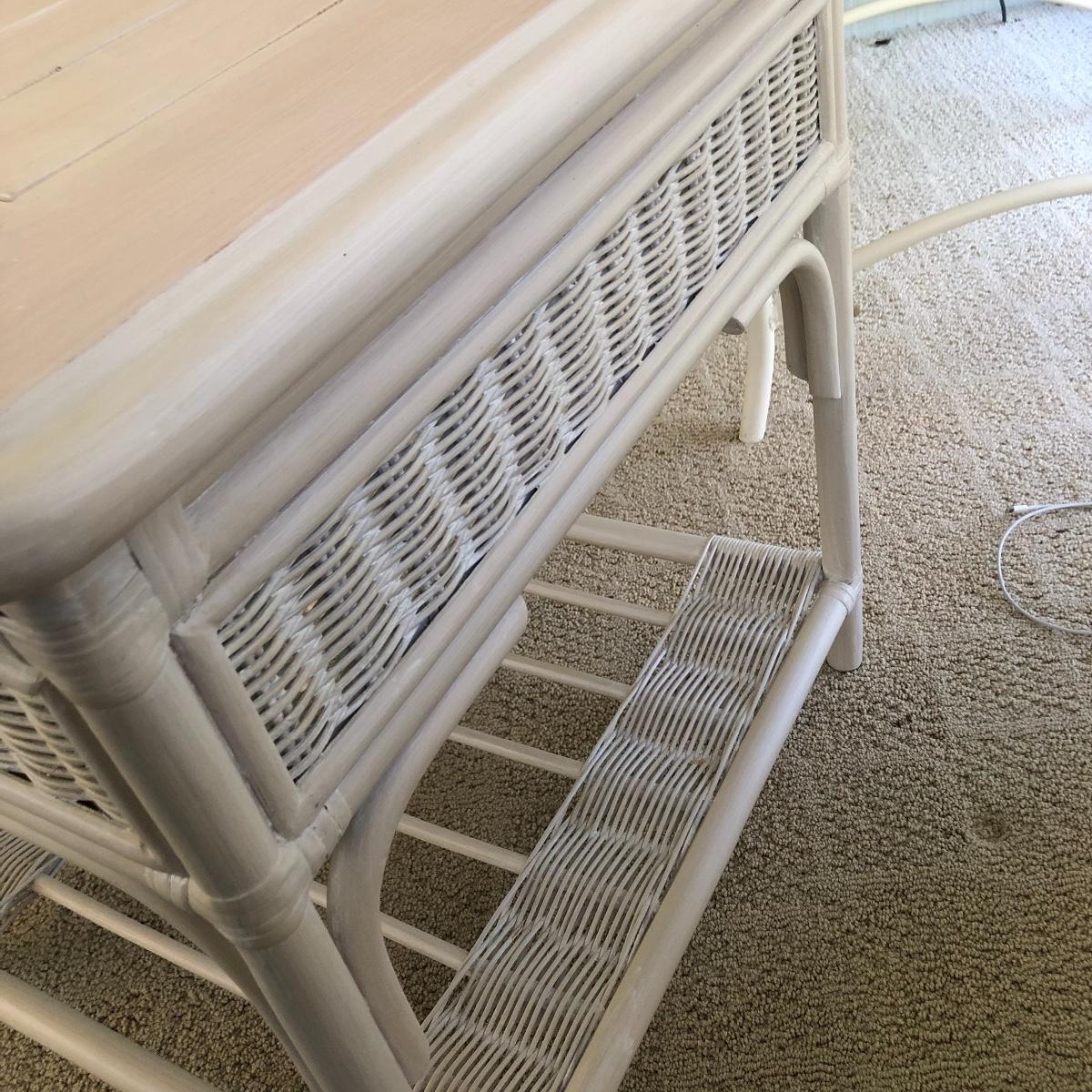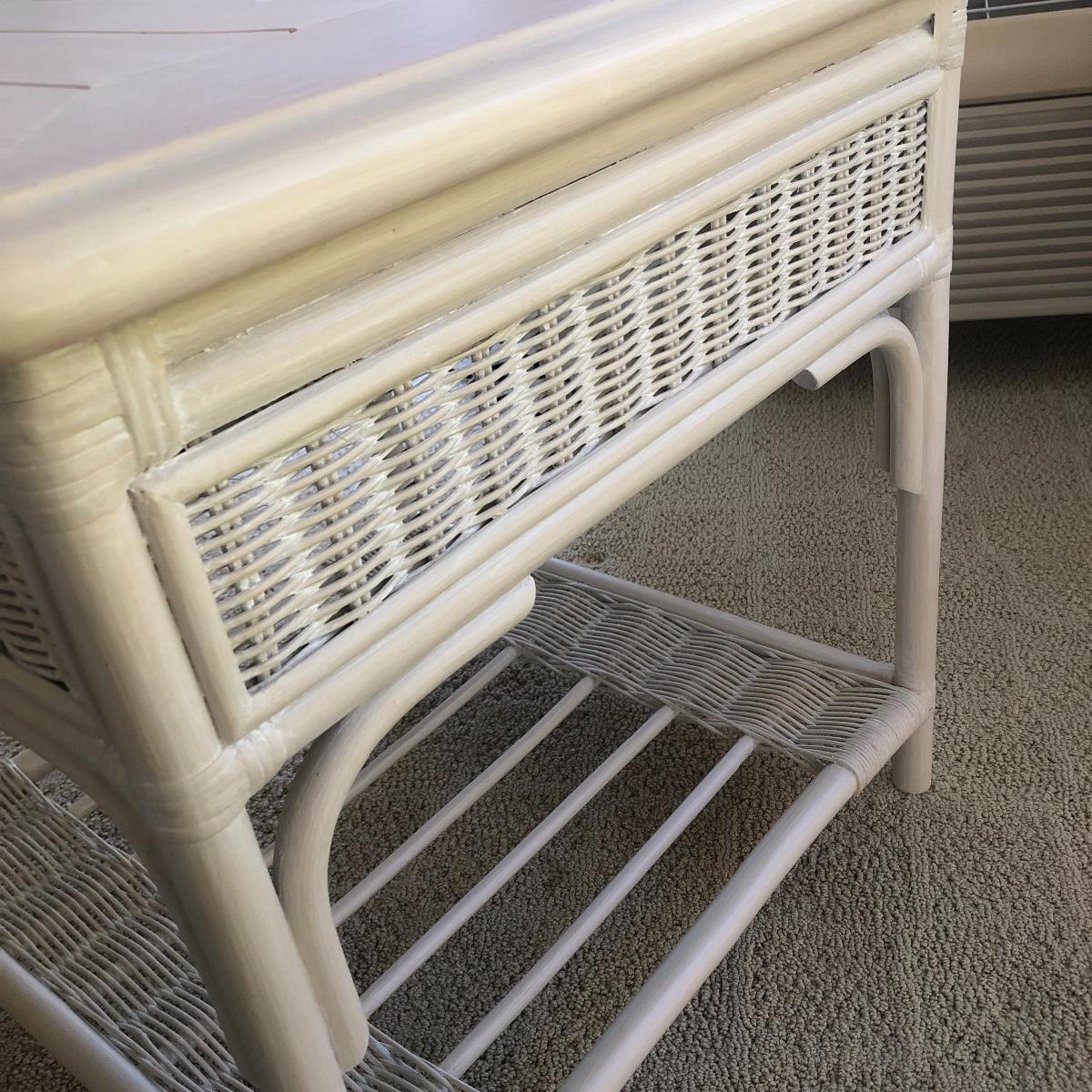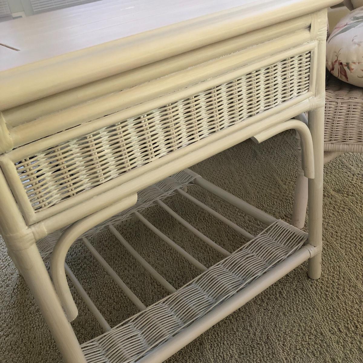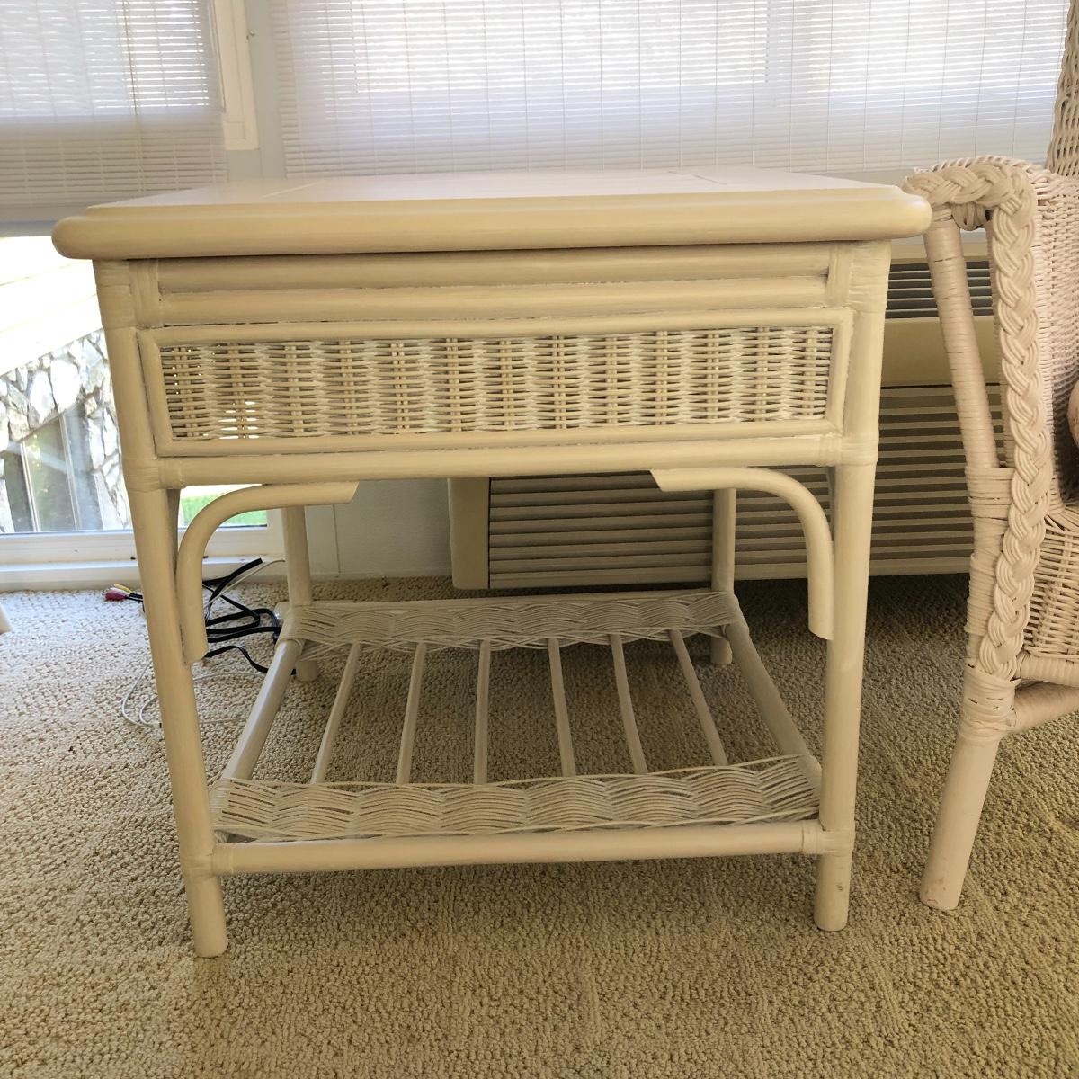 This lot contains a chair with two cushions and a side table. Dimensions of the table are 23.5” x 23.5” x 24”. The table has a solid wood top and wicker sides. The chair is all wicker and measures 30” x 21” 35”. The seat is 14” high without the cushion. With the cushion, it is about 19” high. The wicker on the table looks as if it is all intact. The chair has one broken piece of wicker on the back of the chair (pictured); other than that, it is all intact. Local pick up only.