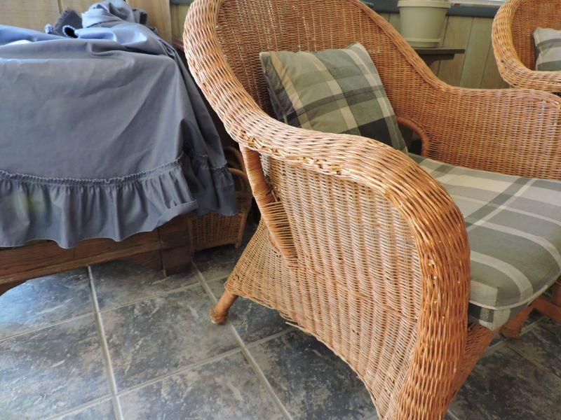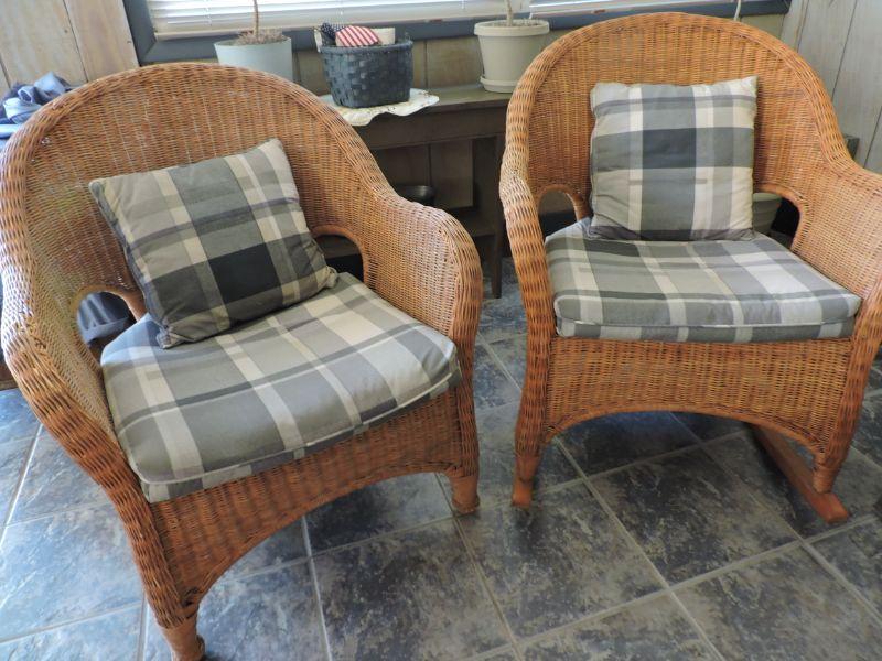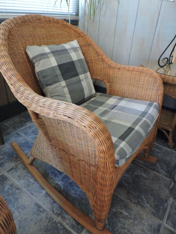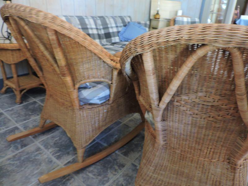 Wicker chairs in wonderful condition. Part of a full set (see last picture). This lot is only for the arm chair and the rocker. Only used indoors. **Please read Terms and Conditions before placing a bid. Pick up is Sunday, September 15, 2019 from 11am to 4pm and Tuesday, September 17 from 4pm-7pm in Sicklerville. All sales are final. All sales are as is, where is. Please review all photos. Any props included in photos are not included in listing. All measurements are approximate.