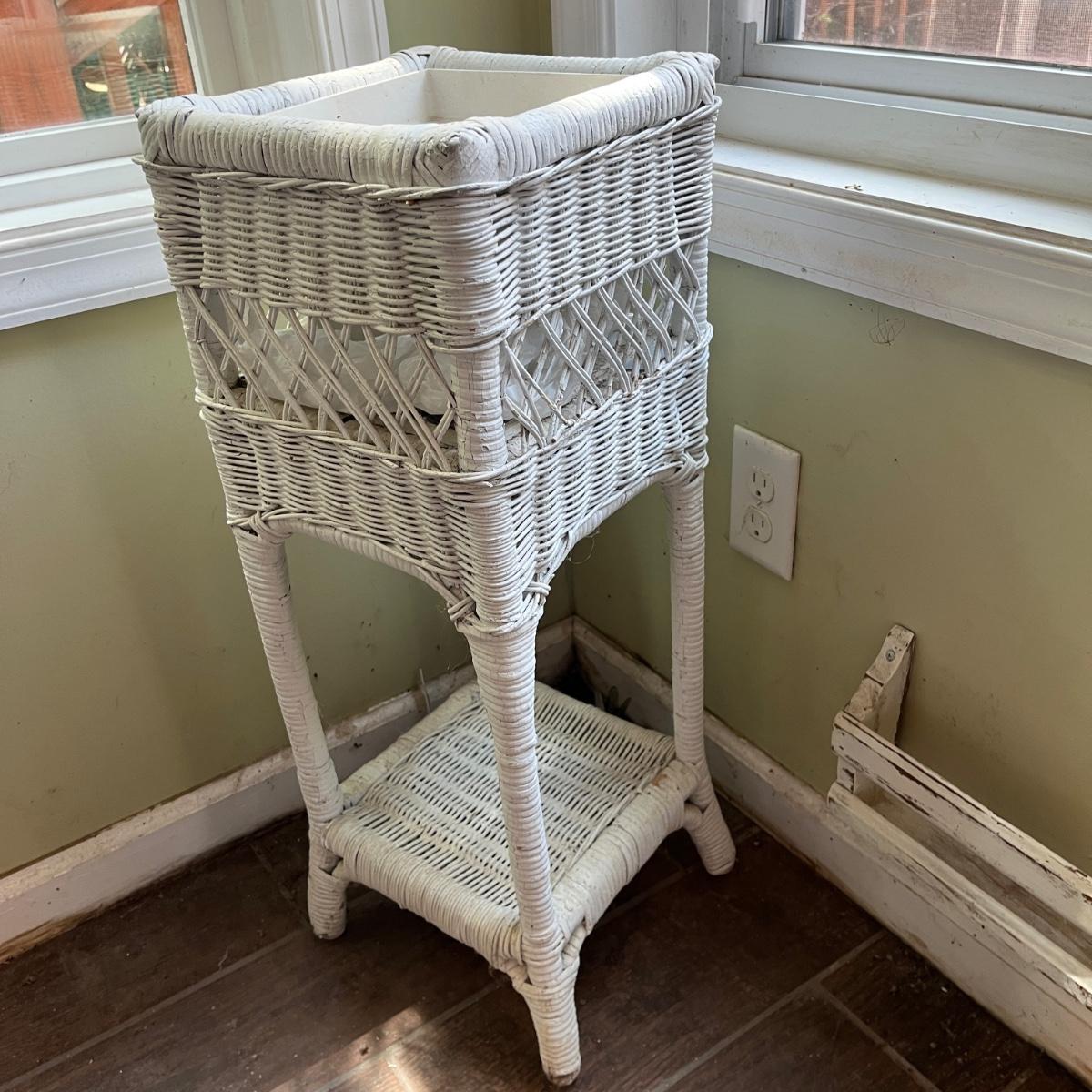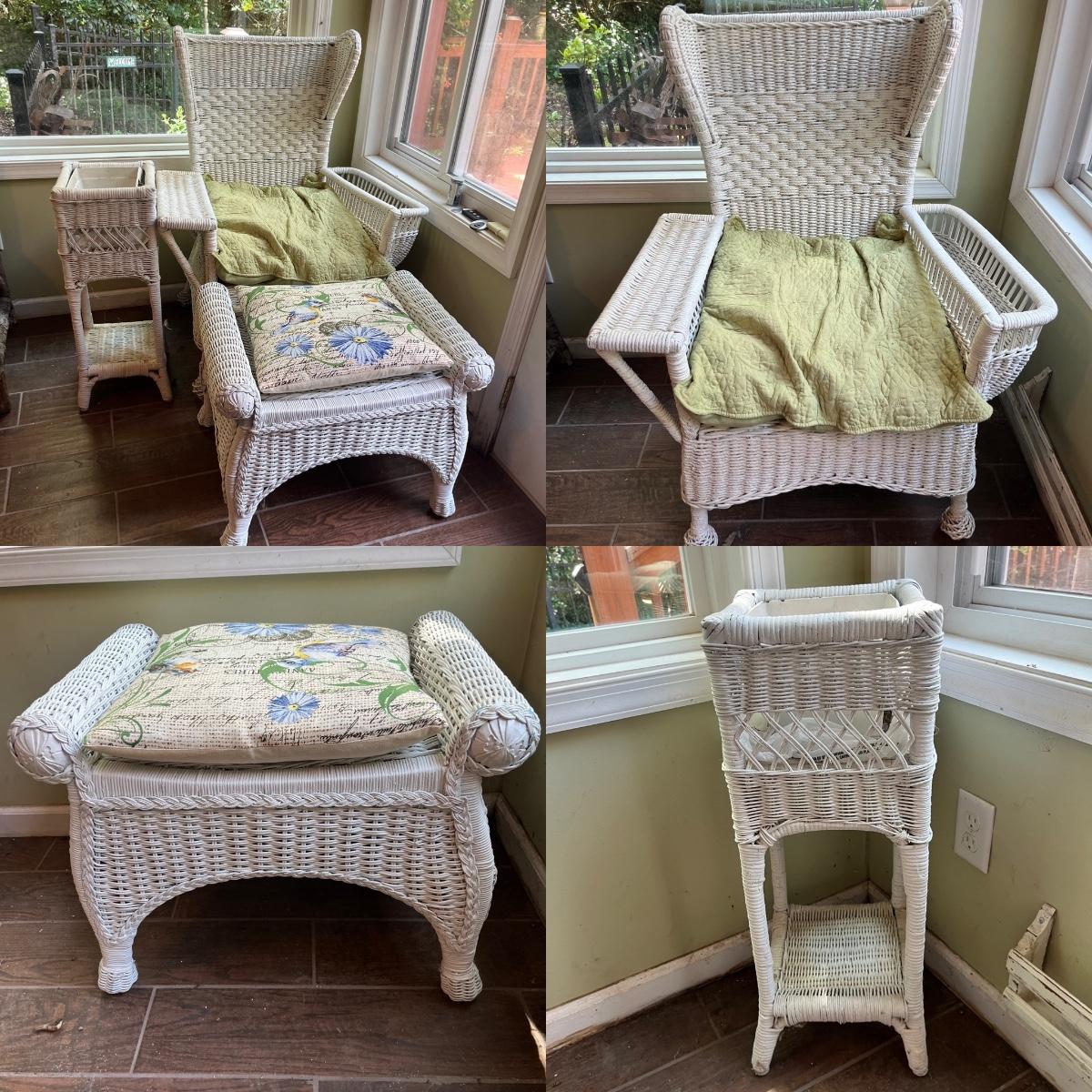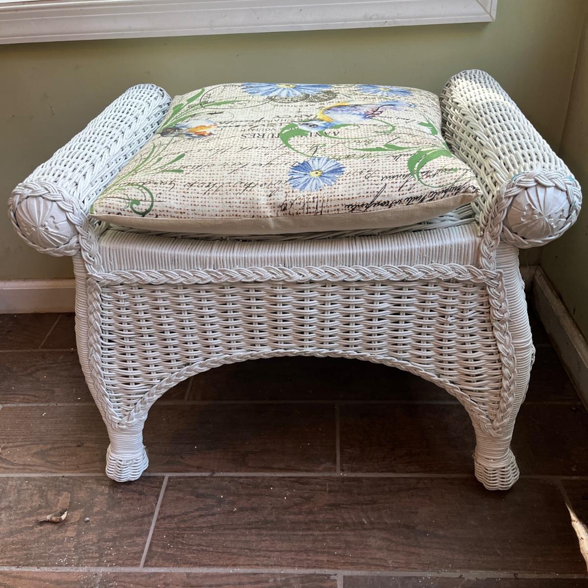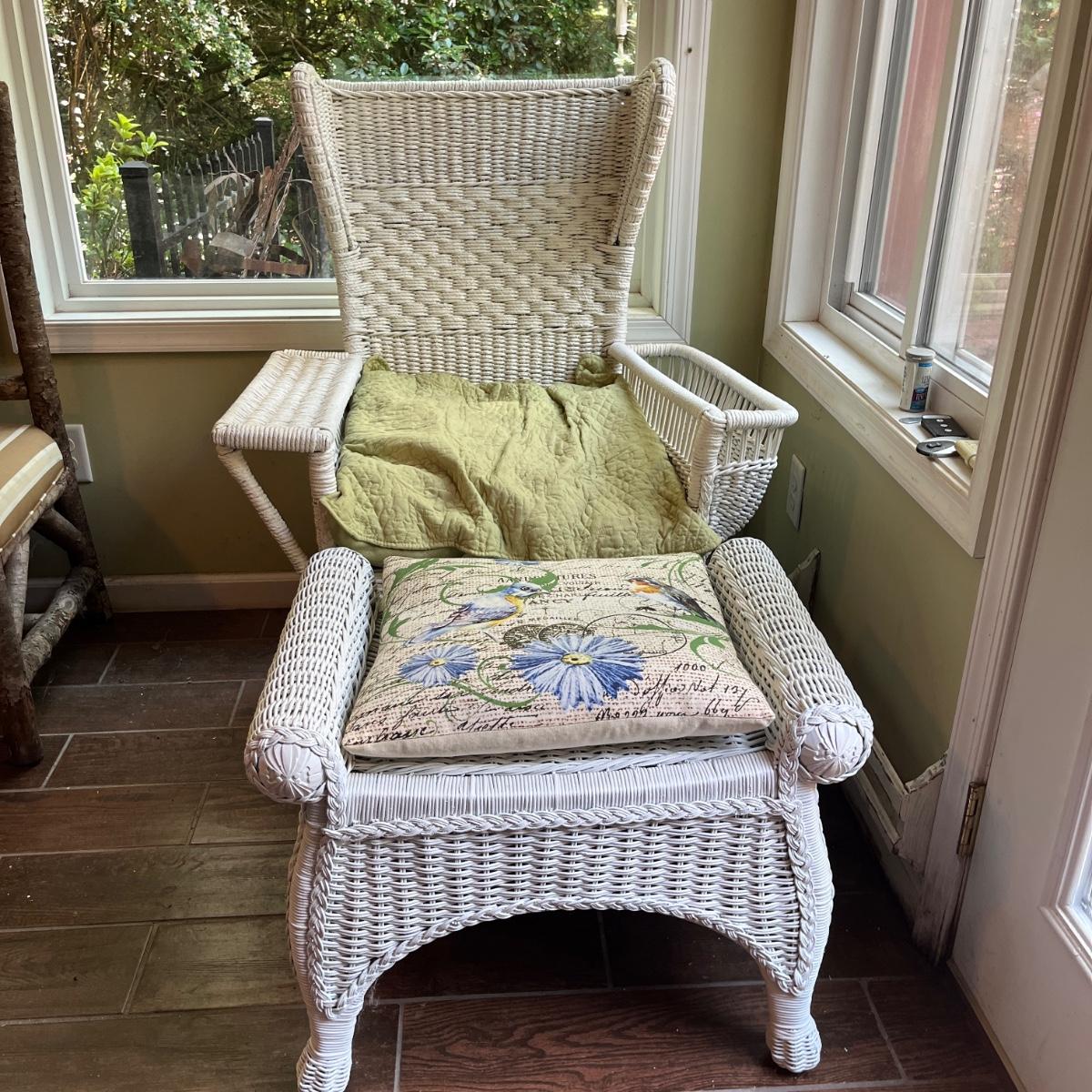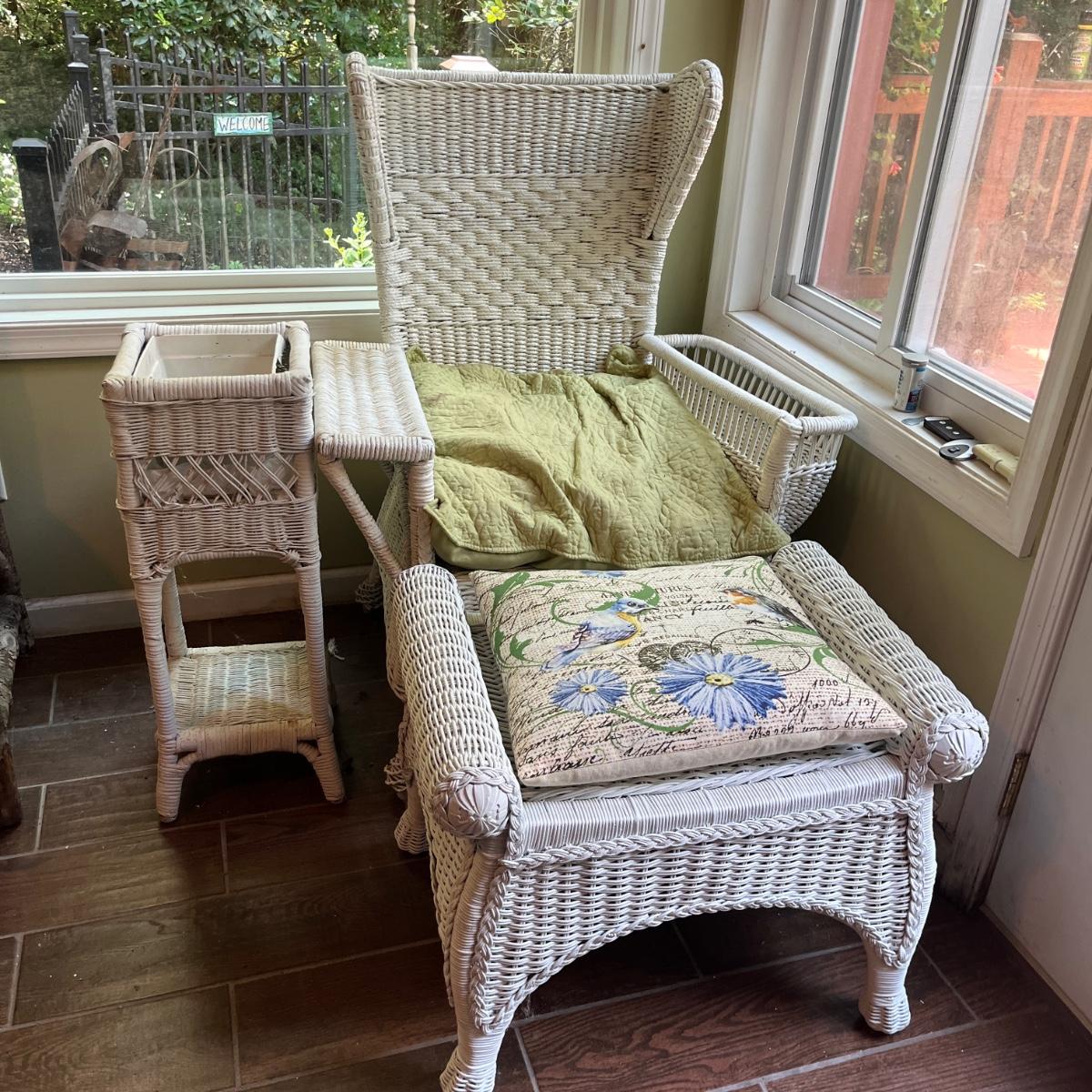 Lot includes a wicker chair with seat cushion, ottoman with cushion and a plant stand. Chairs measures 28” x 33” x 42”H with a 20” seat height with cushion.