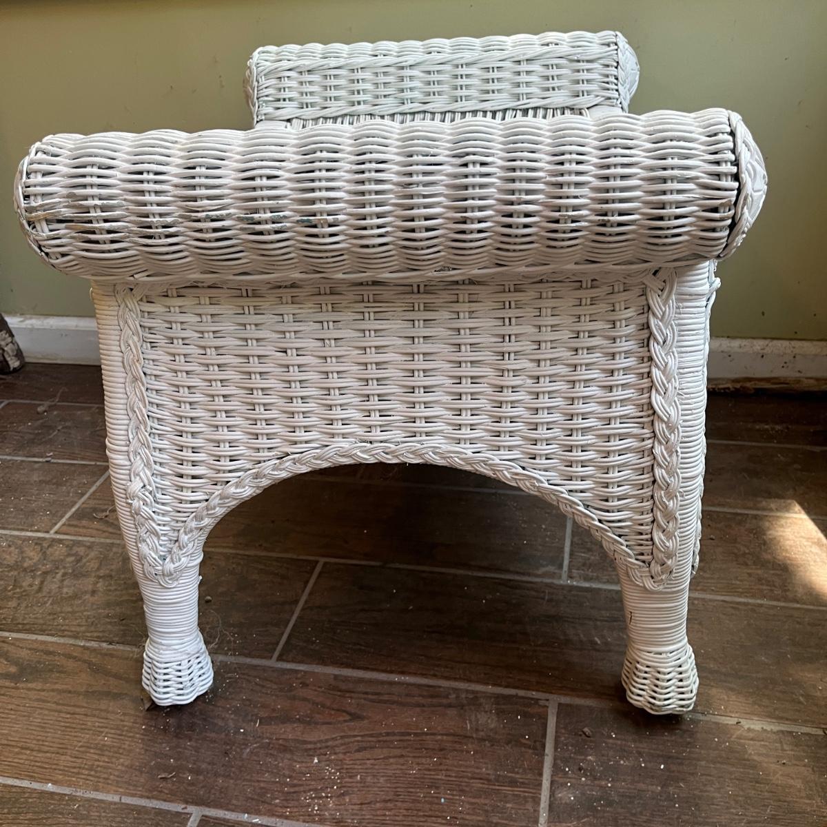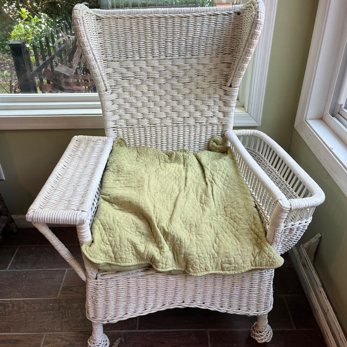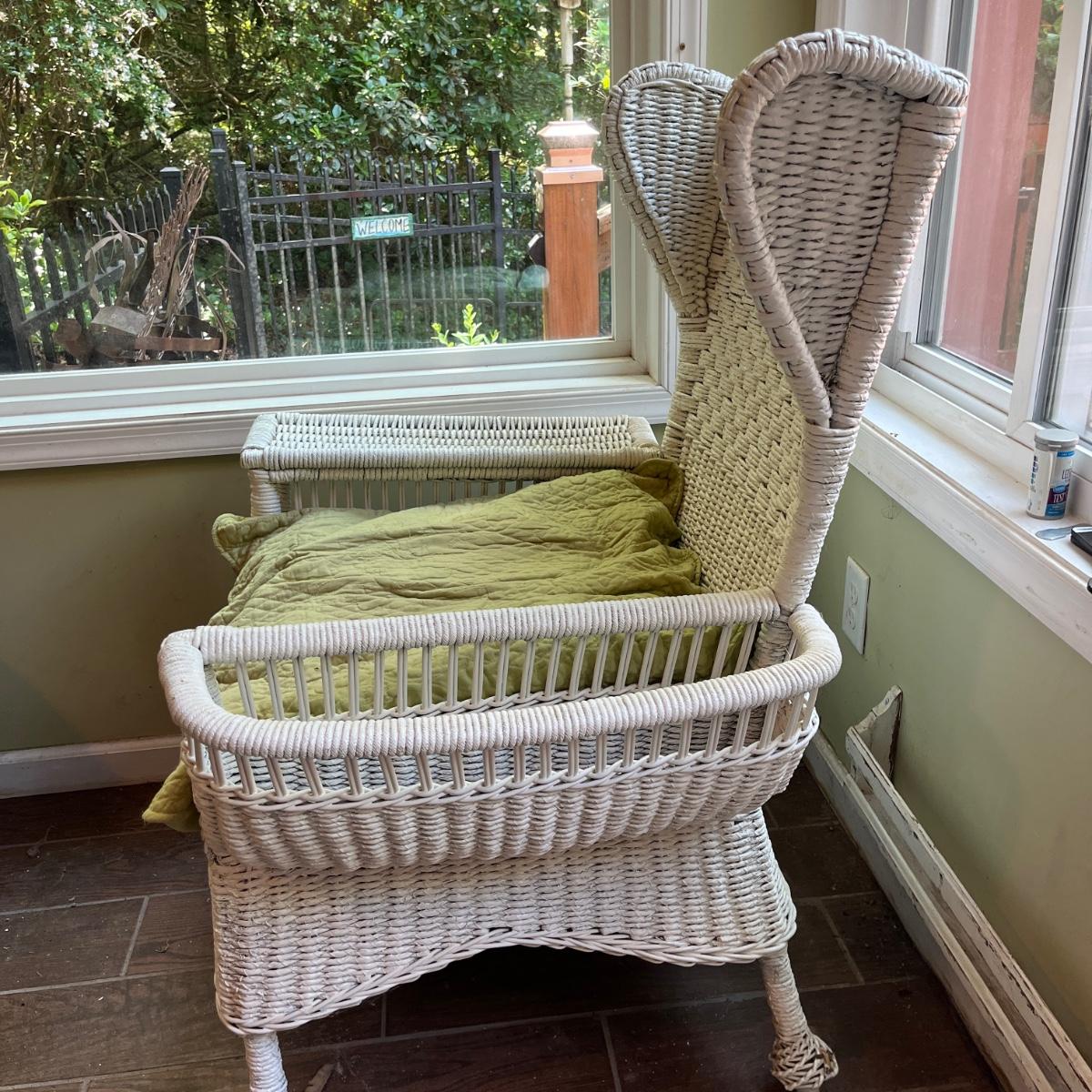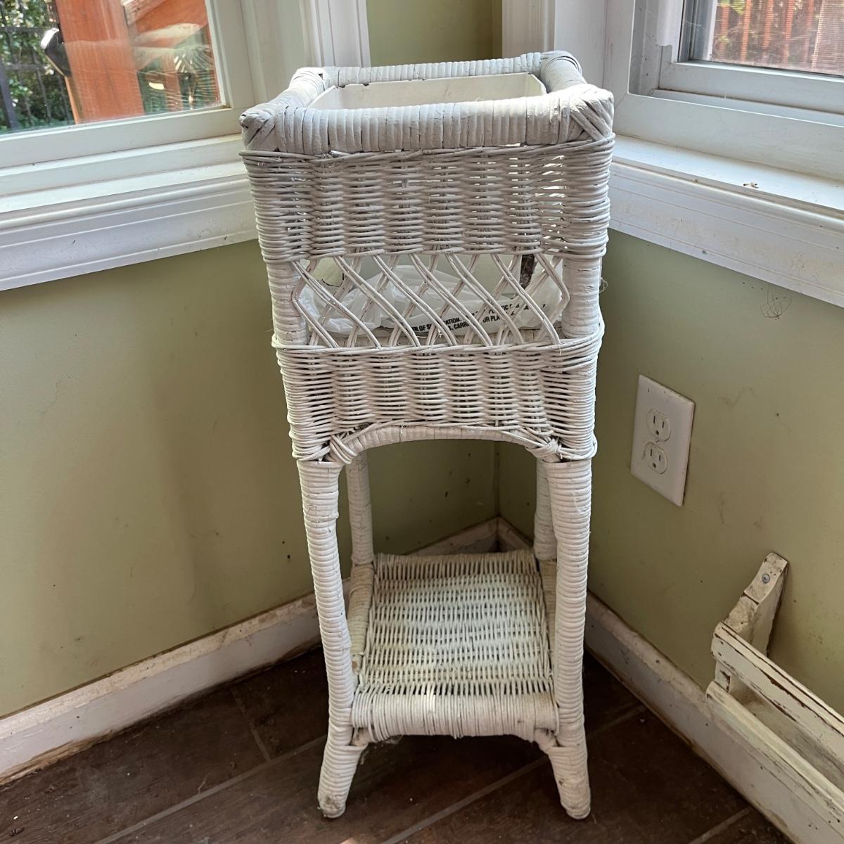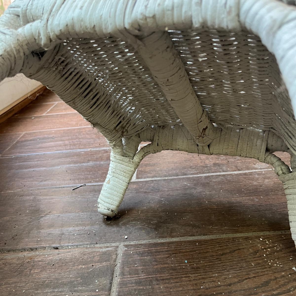 Lot includes a wicker chair with seat cushion, ottoman with cushion and a plant stand. Chairs measures 28” x 33” x 42”H with a 20” seat height with cushion.