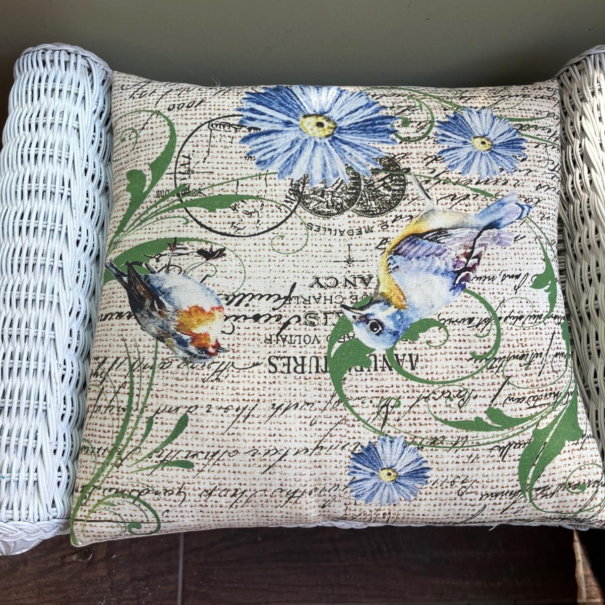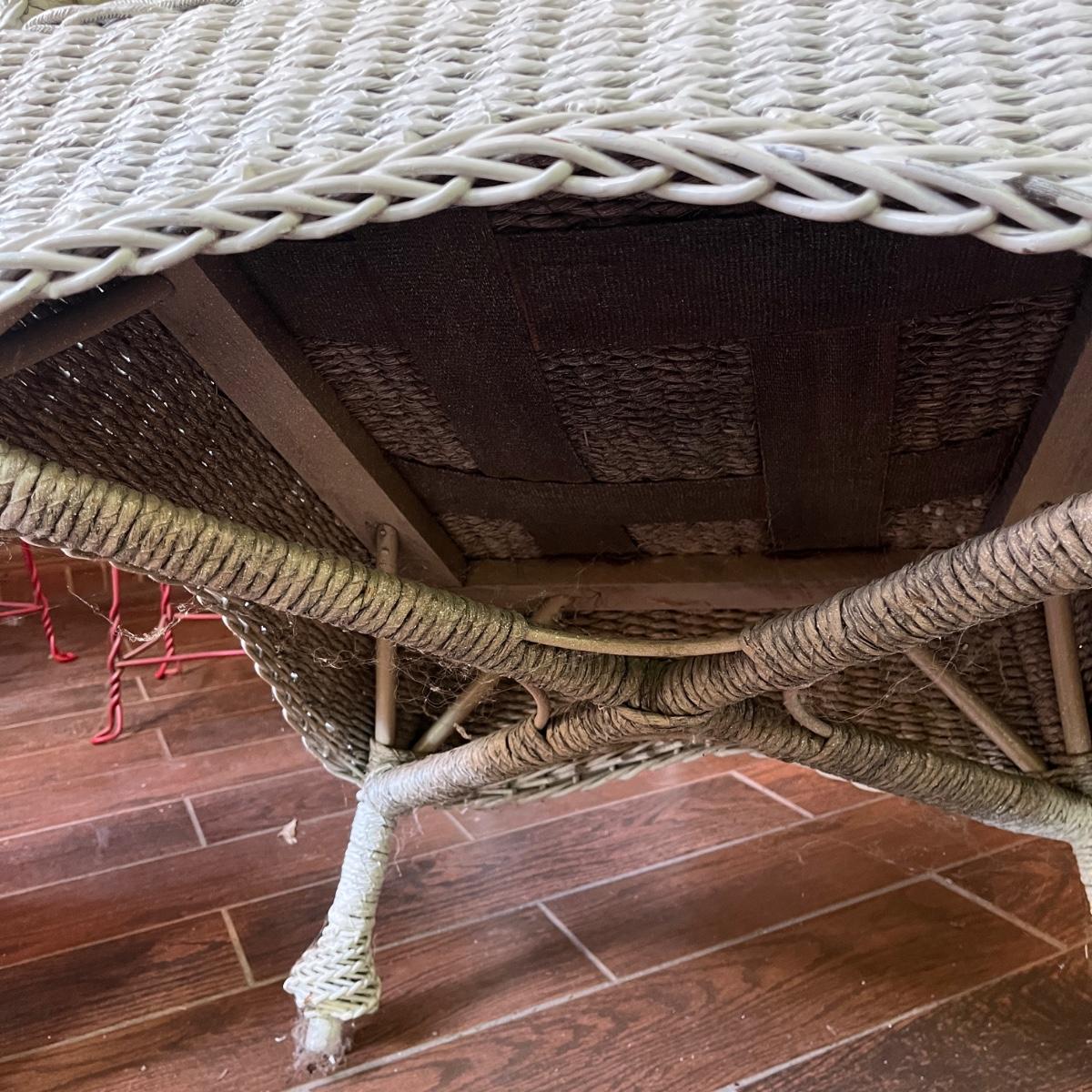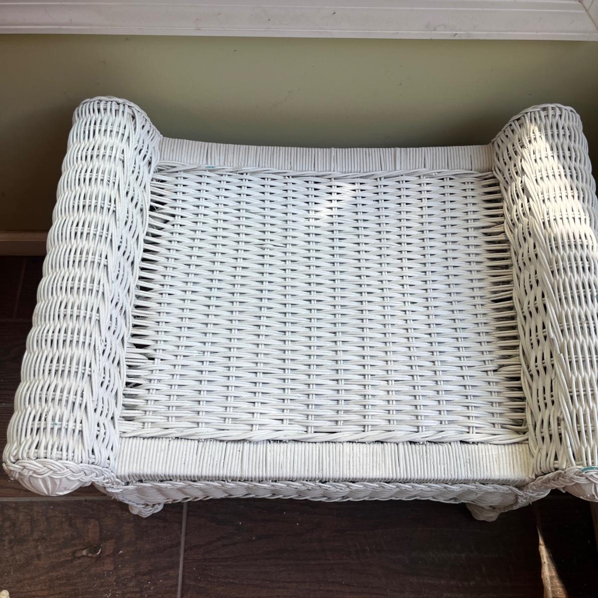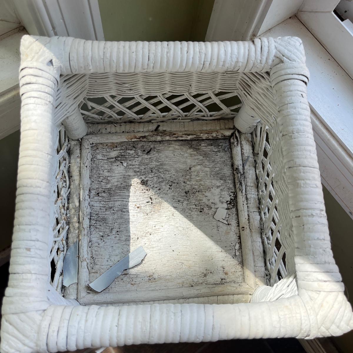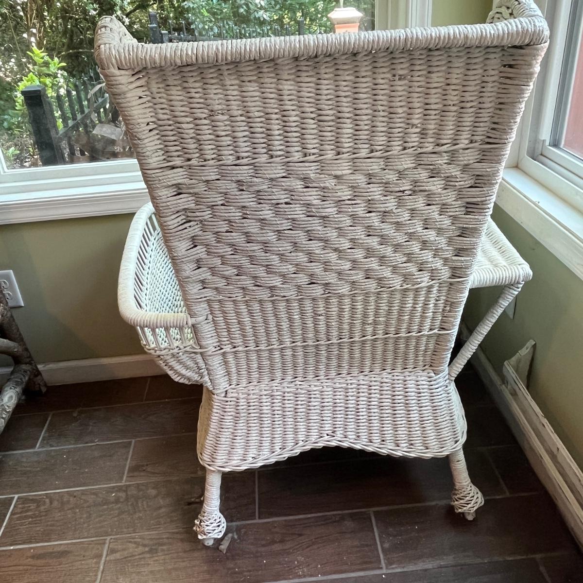 Lot includes a wicker chair with seat cushion, ottoman with cushion and a plant stand. Chairs measures 28” x 33” x 42”H with a 20” seat height with cushion.