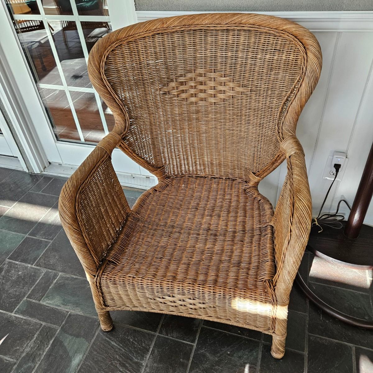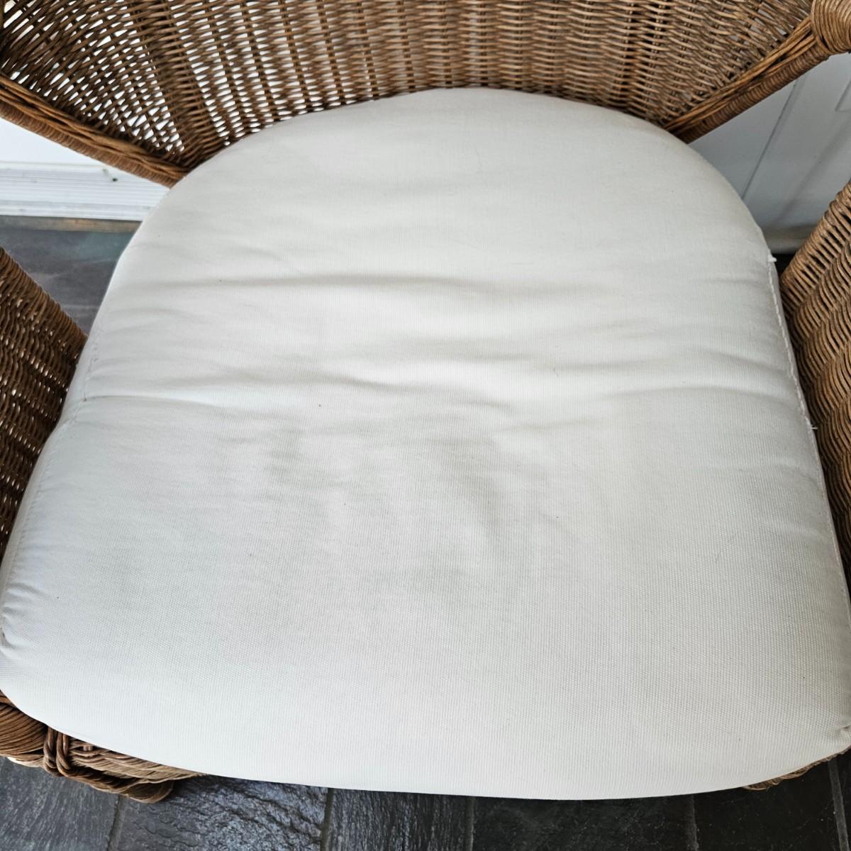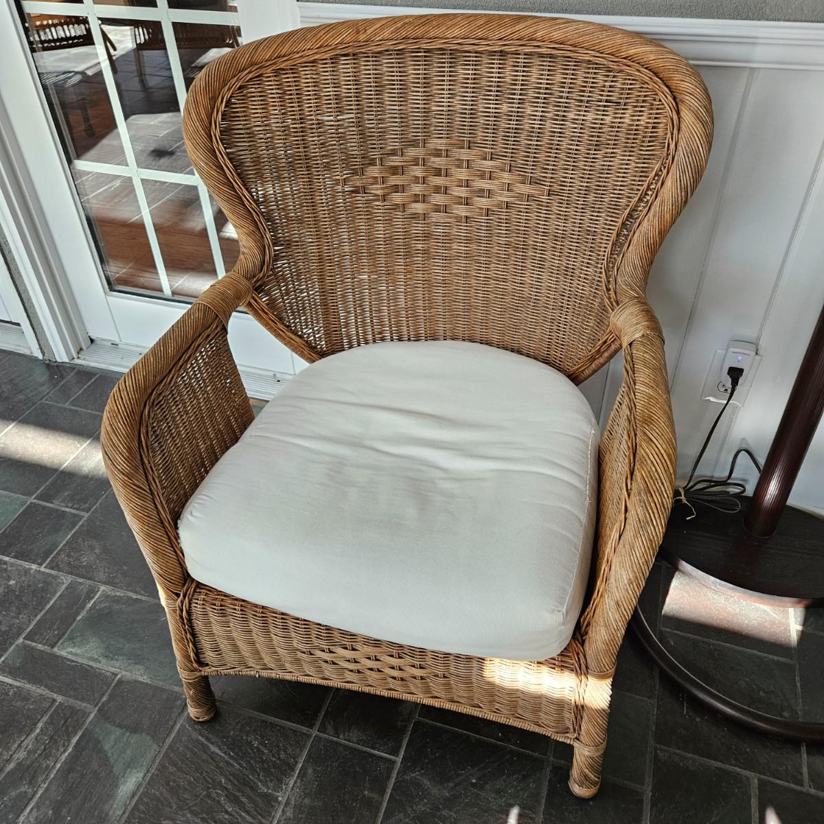 A wicker chair with a white fabric cushion. It measures approximately 31" x 28" x 36.5"H with a height of 17". Local pickup only