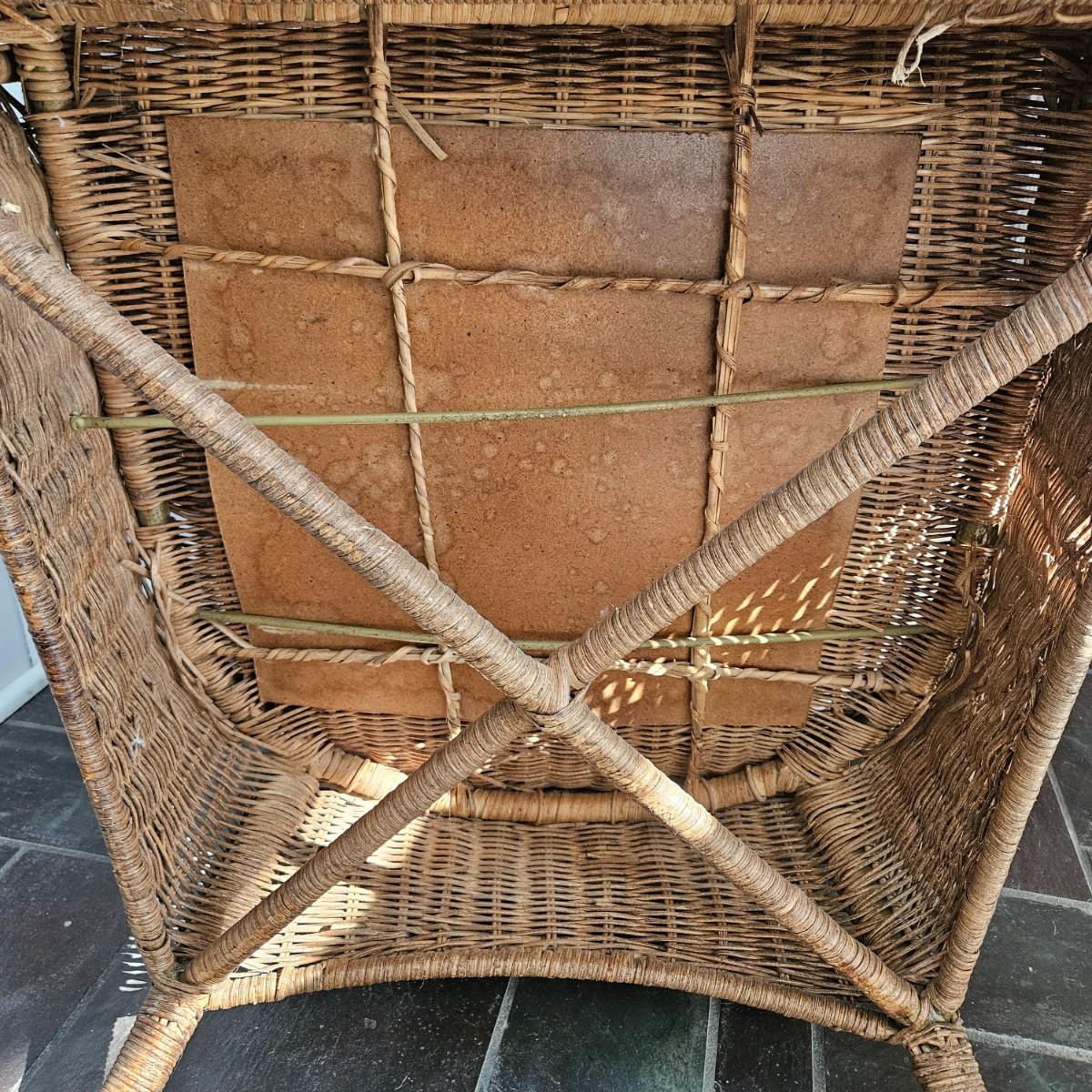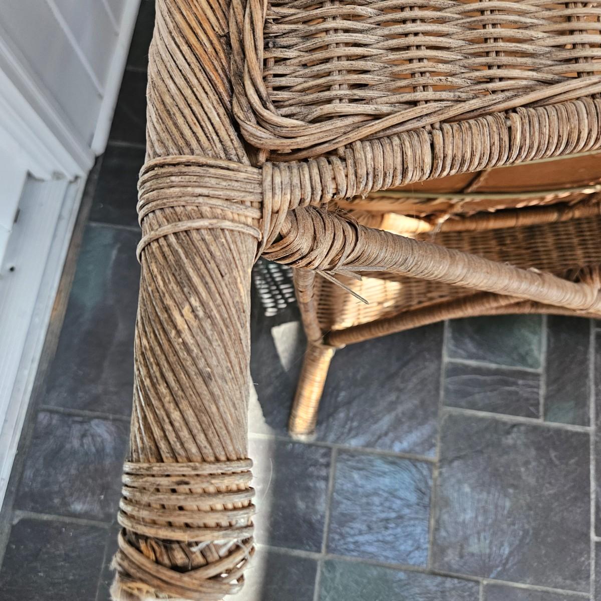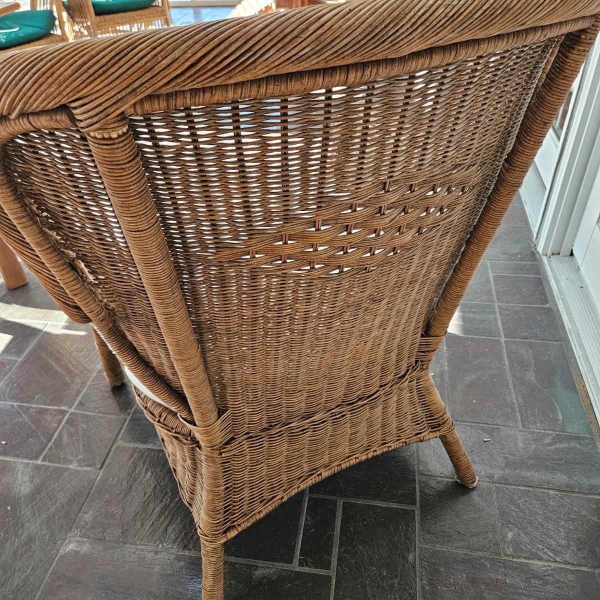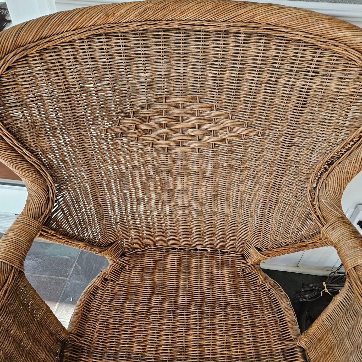 A wicker chair with a white fabric cushion. It measures approximately 31" x 28" x 36.5"H with a height of 17". Local pickup only