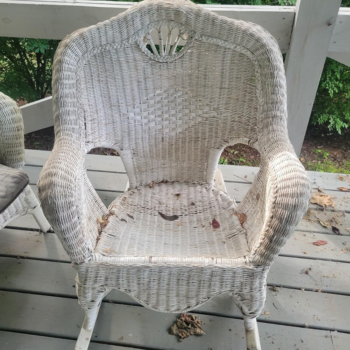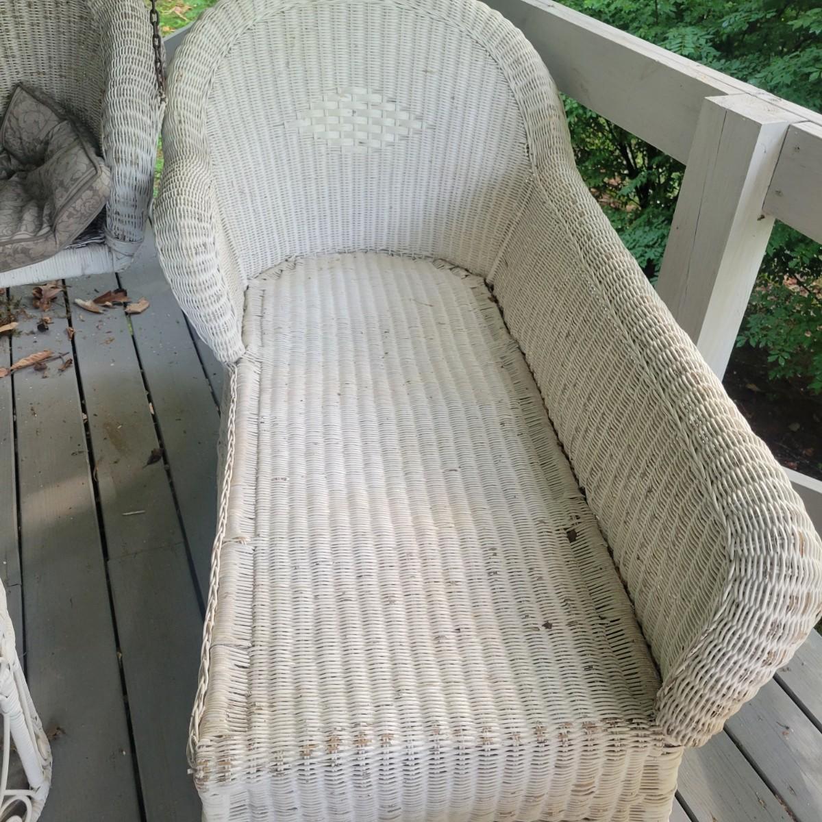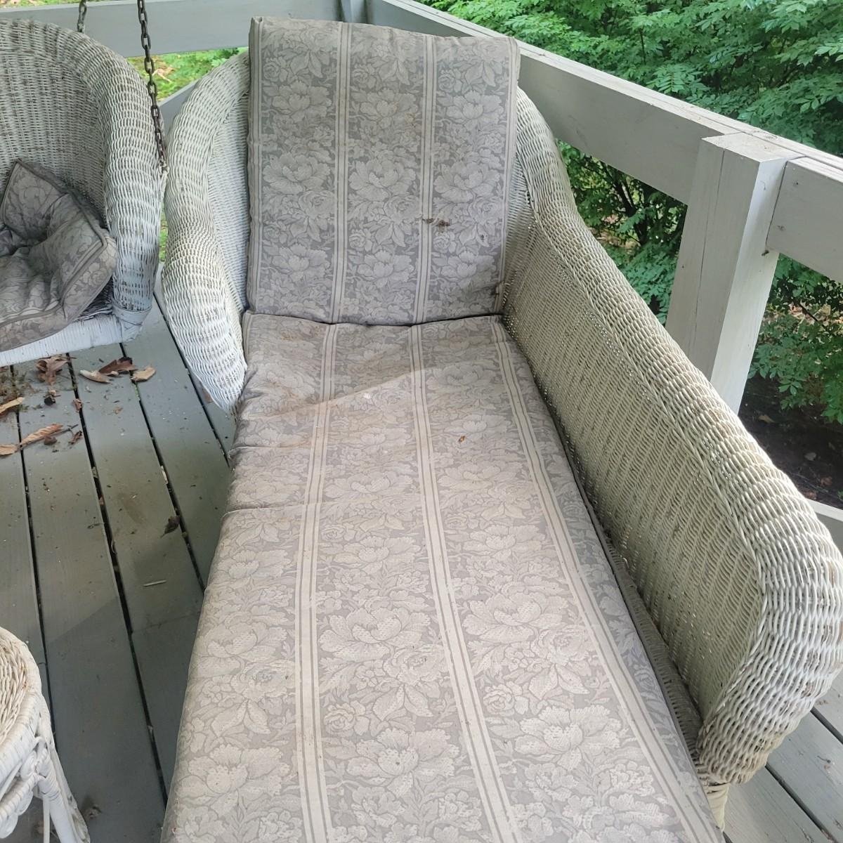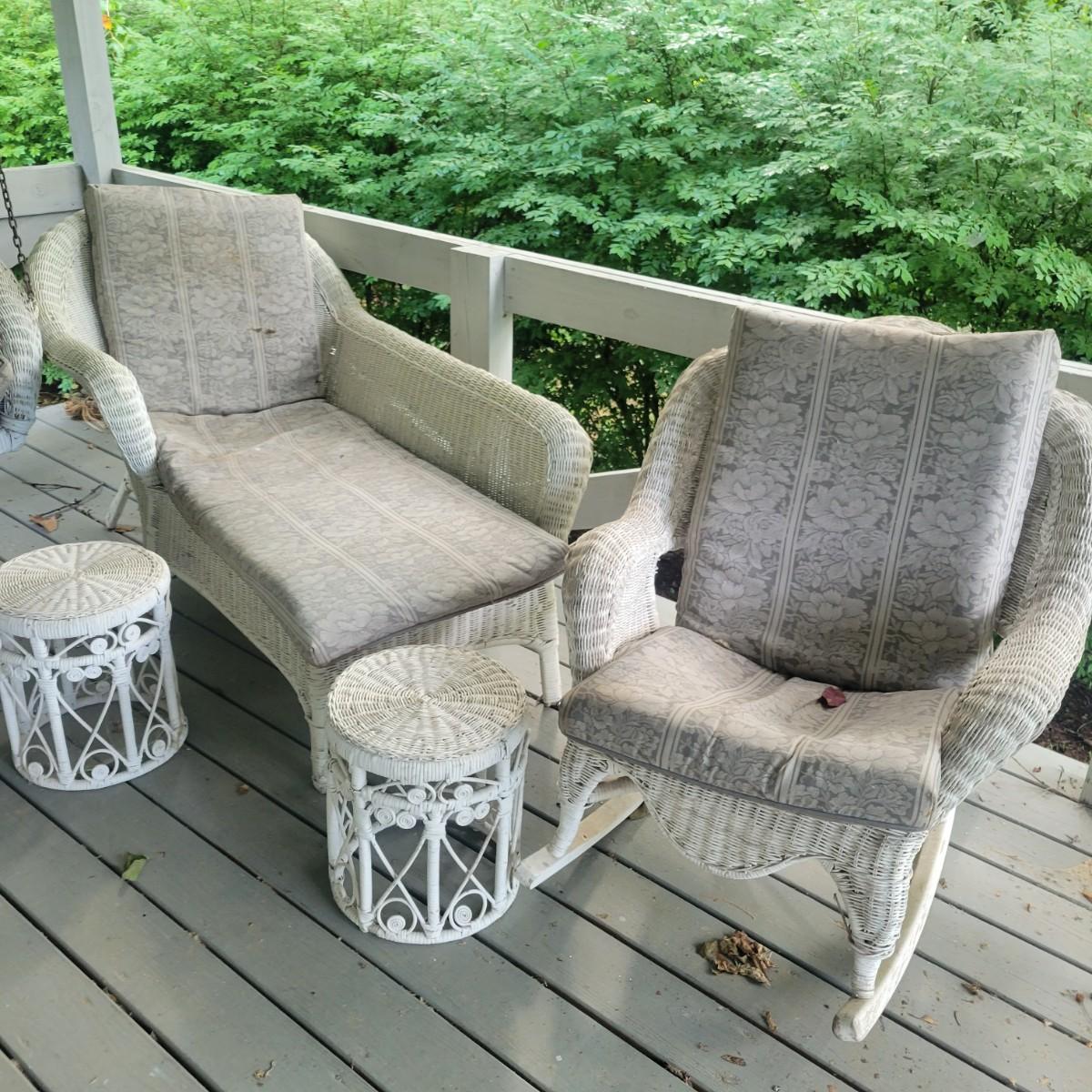 An assortment of four pieces of wicker furniture that includes cushions that are in good condition. Wicker is peeling some paint and there is some wicker unraveling, but they remain structurally sound. See attached pictures for more detail. The lot includes 2 small tables, a rocking chair and a chaise lounge. The lounge measures approximately 32" x 60" x 34". Seat height is approximately 16". Local pickup only