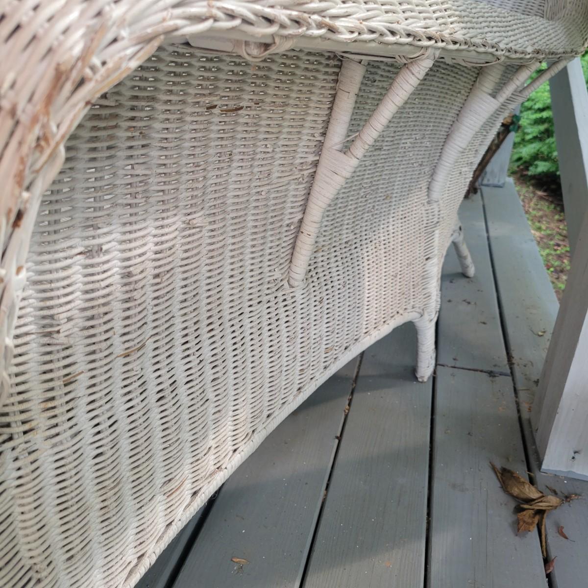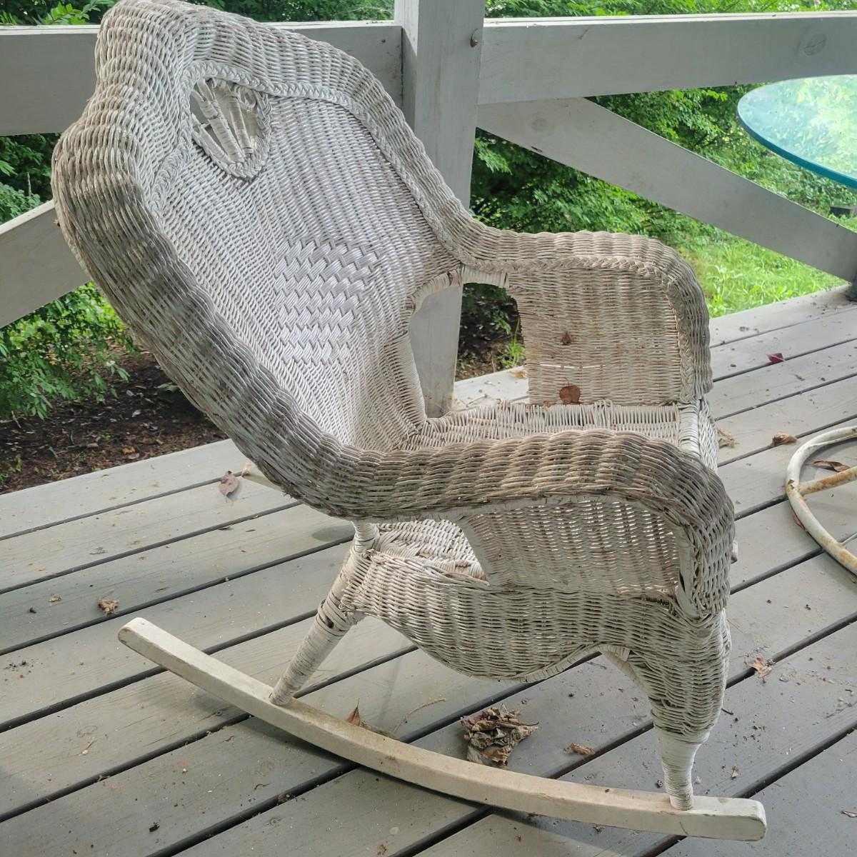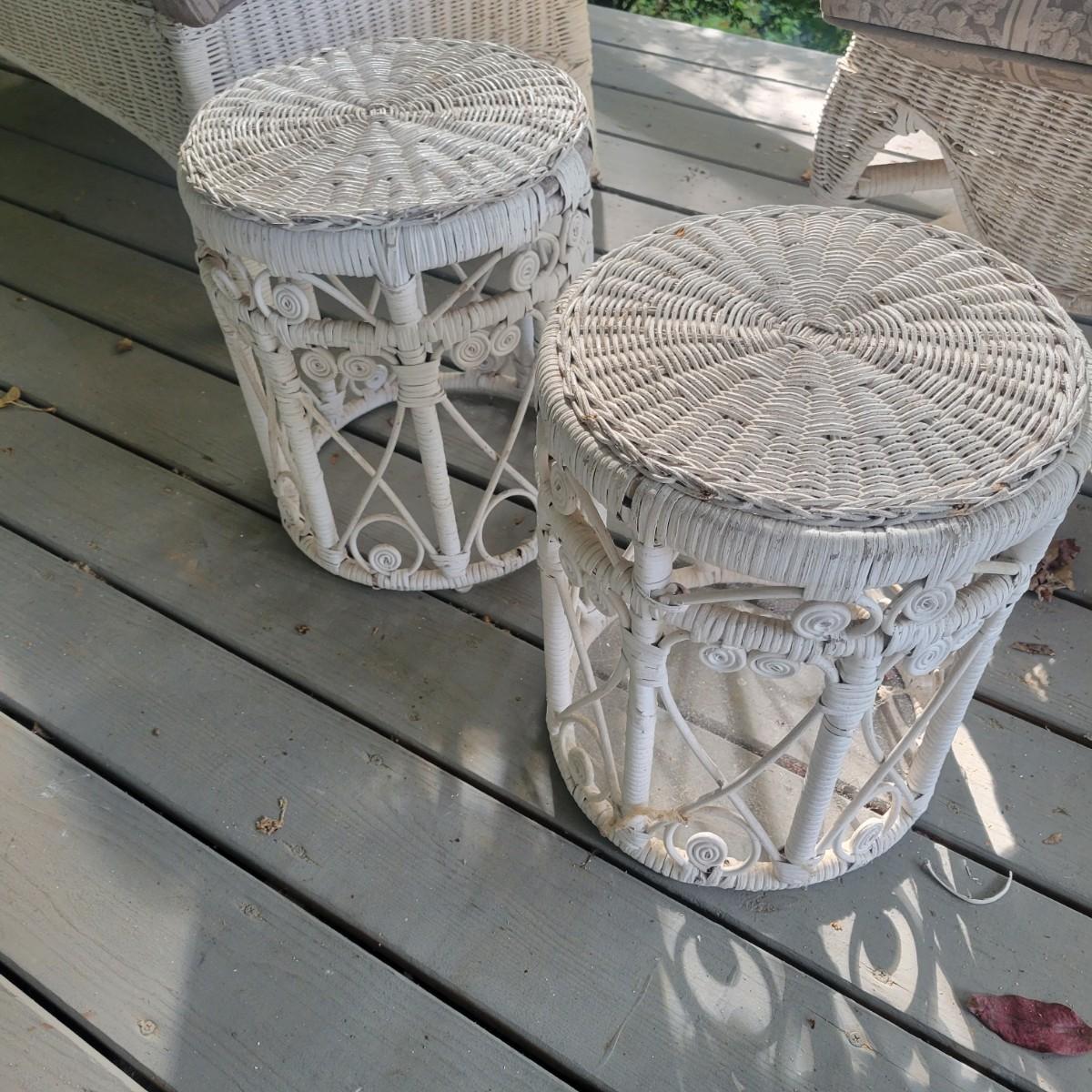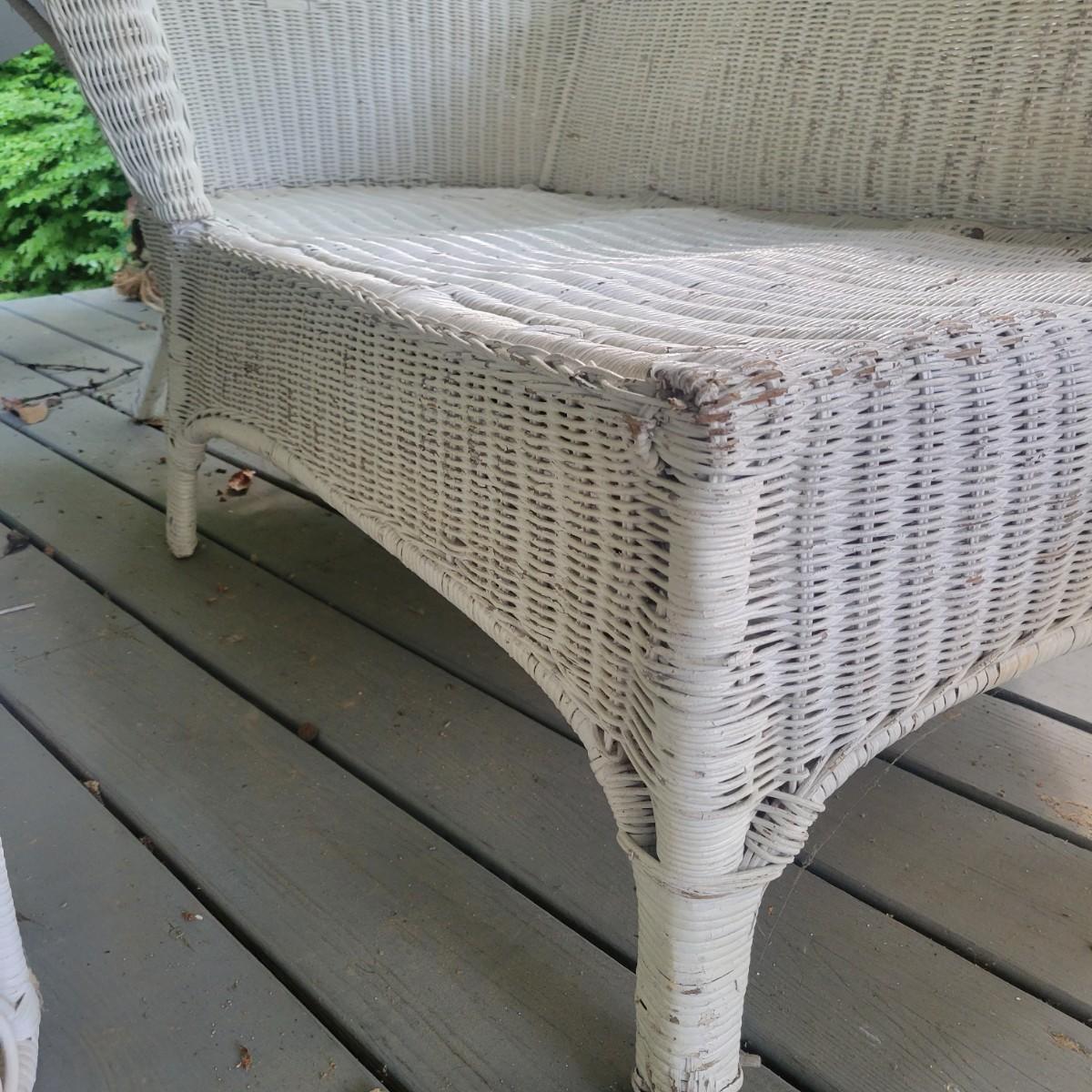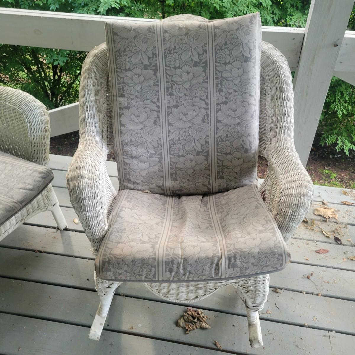 An assortment of four pieces of wicker furniture that includes cushions that are in good condition. Wicker is peeling some paint and there is some wicker unraveling, but they remain structurally sound. See attached pictures for more detail. The lot includes 2 small tables, a rocking chair and a chaise lounge. The lounge measures approximately 32" x 60" x 34". Seat height is approximately 16". Local pickup only