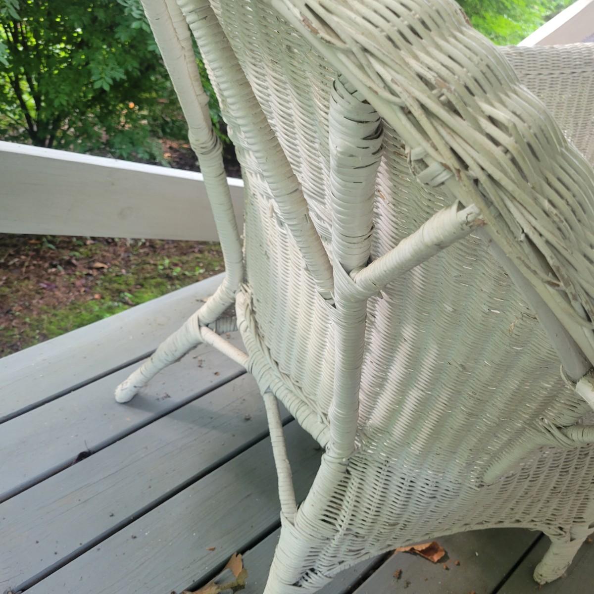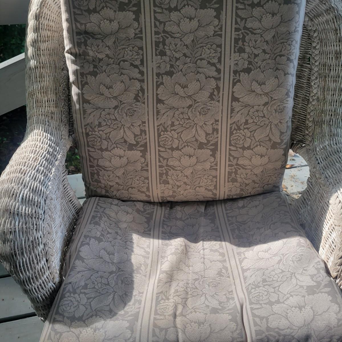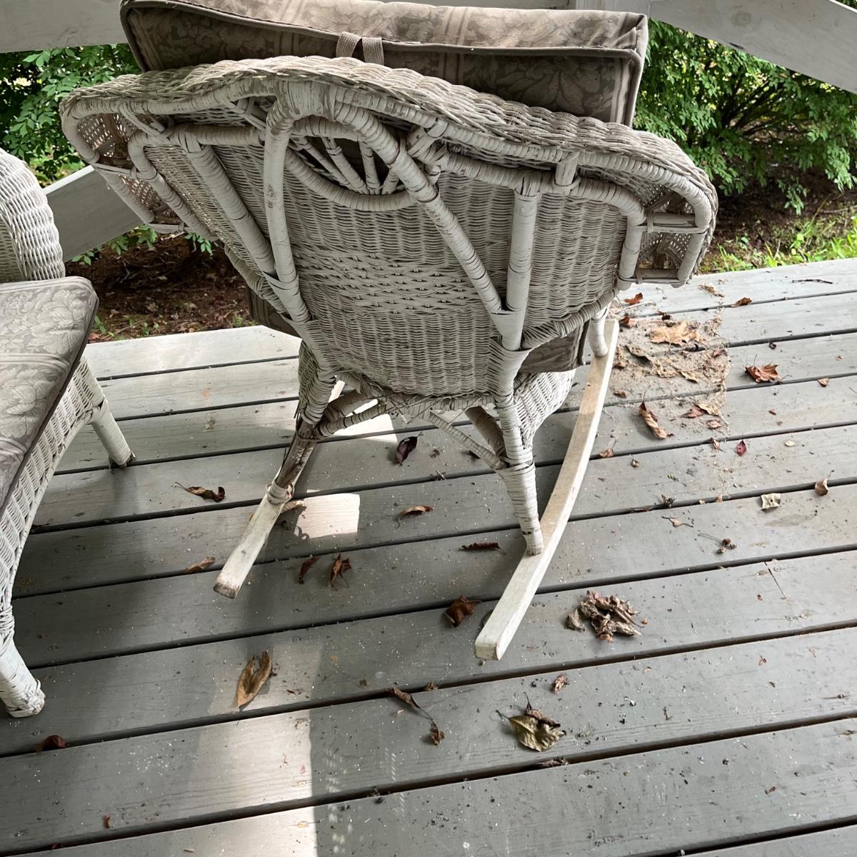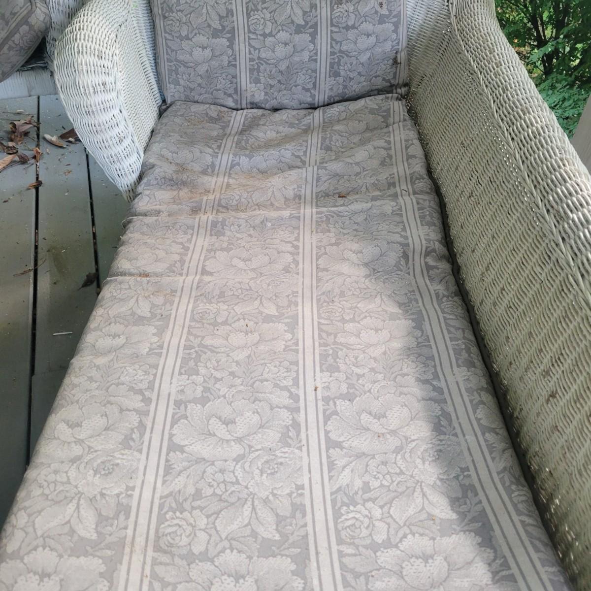 An assortment of four pieces of wicker furniture that includes cushions that are in good condition. Wicker is peeling some paint and there is some wicker unraveling, but they remain structurally sound. See attached pictures for more detail. The lot includes 2 small tables, a rocking chair and a chaise lounge. The lounge measures approximately 32" x 60" x 34". Seat height is approximately 16". Local pickup only