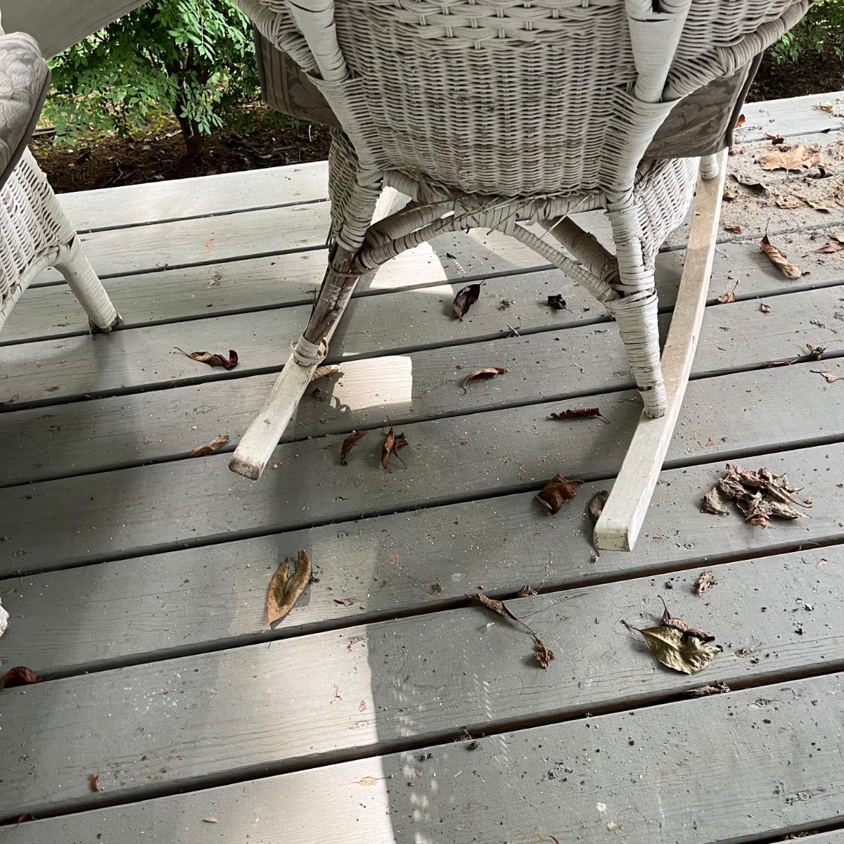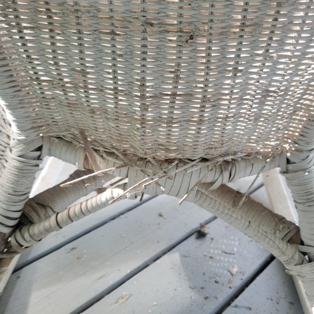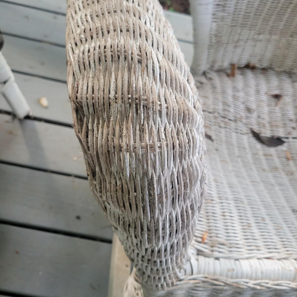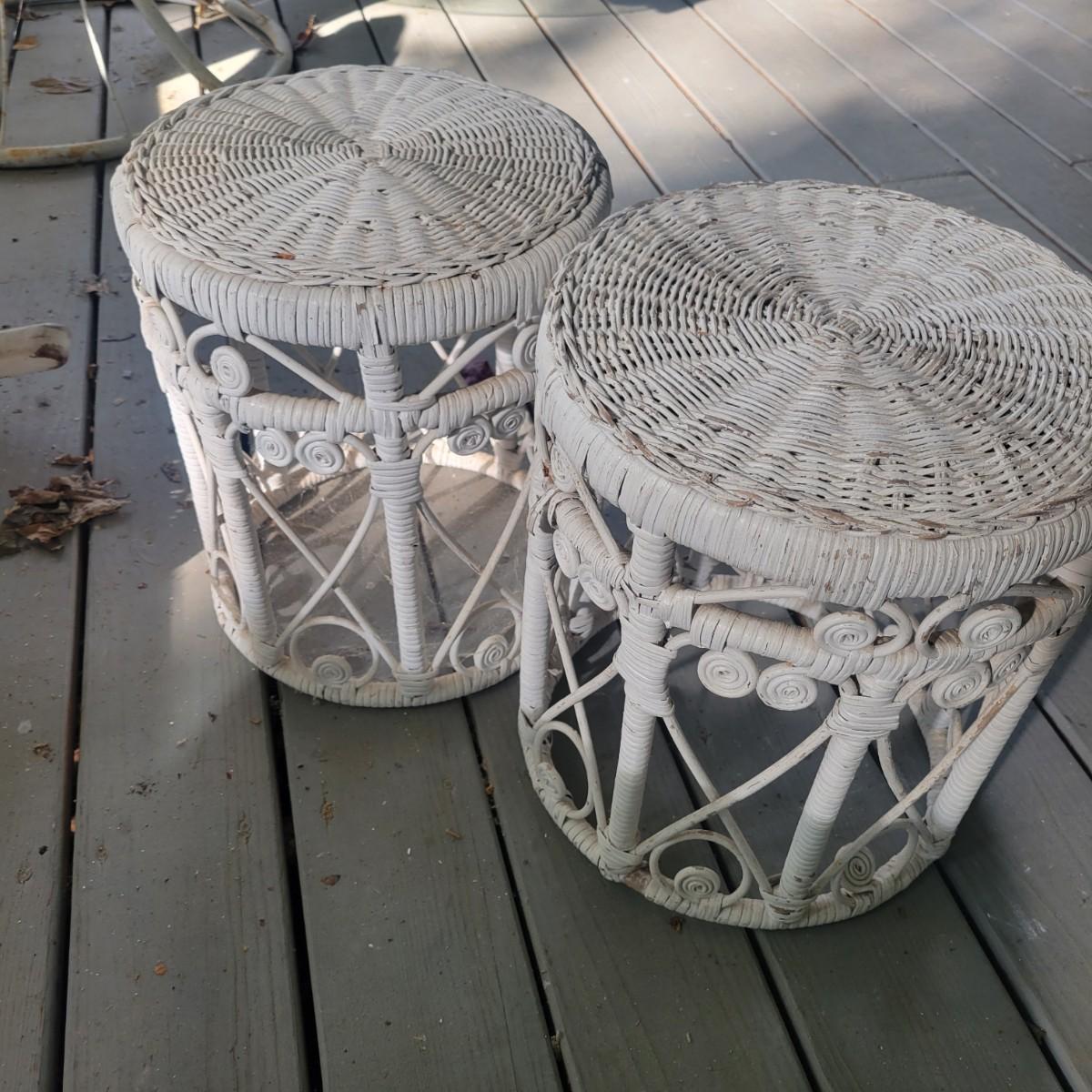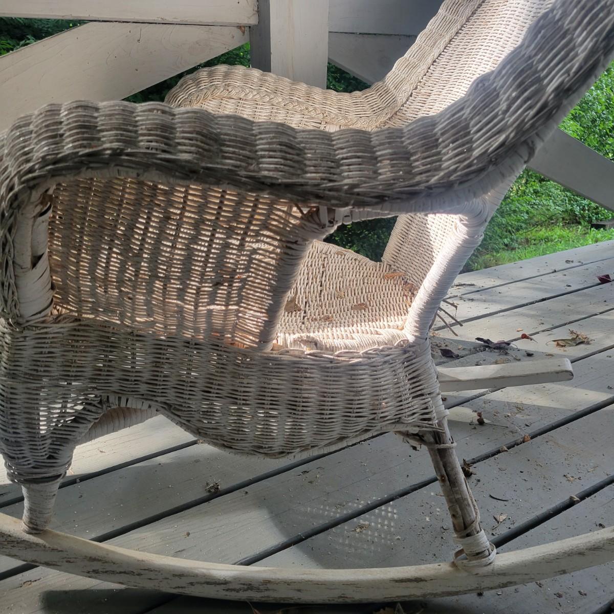 An assortment of four pieces of wicker furniture that includes cushions that are in good condition. Wicker is peeling some paint and there is some wicker unraveling, but they remain structurally sound. See attached pictures for more detail. The lot includes 2 small tables, a rocking chair and a chaise lounge. The lounge measures approximately 32" x 60" x 34". Seat height is approximately 16". Local pickup only