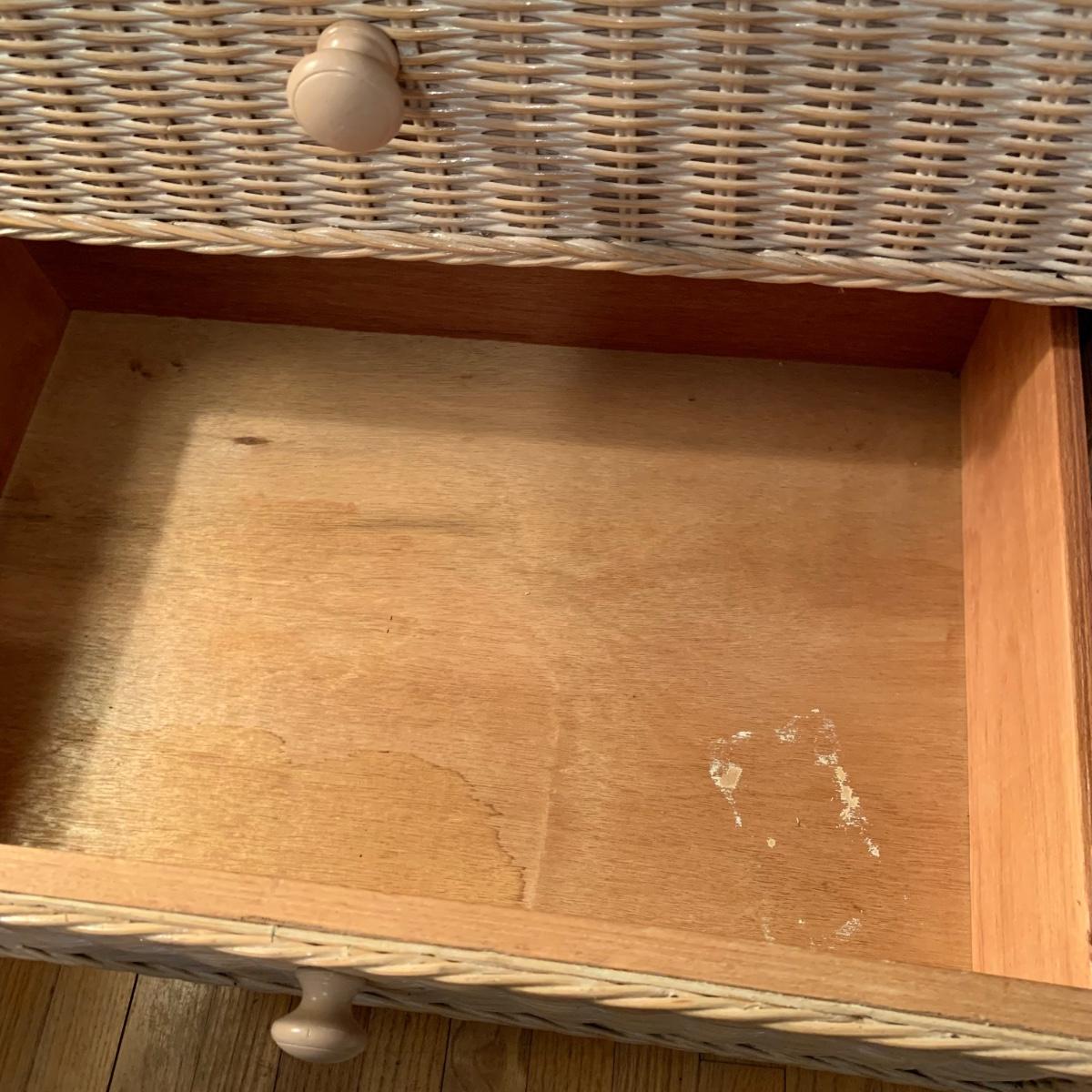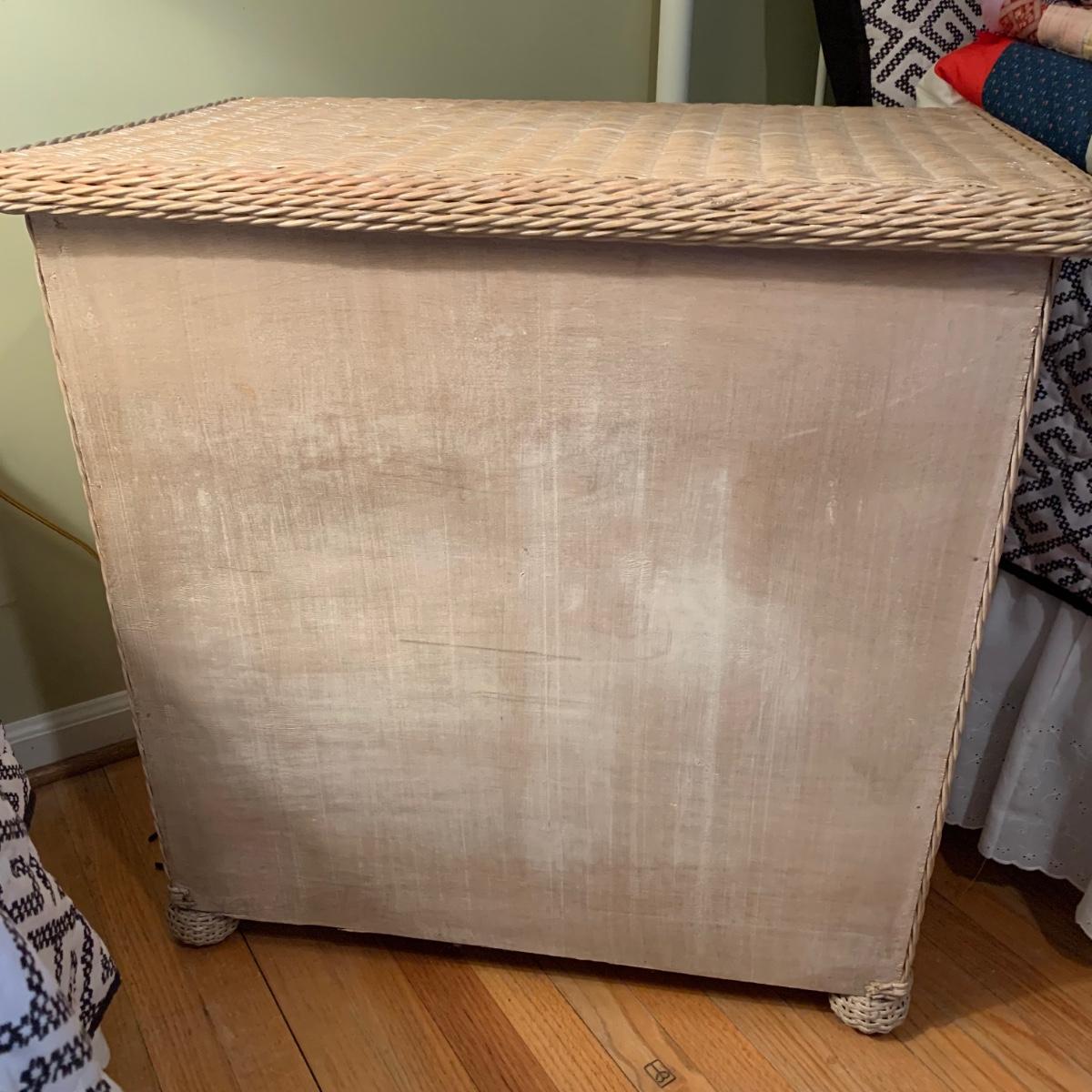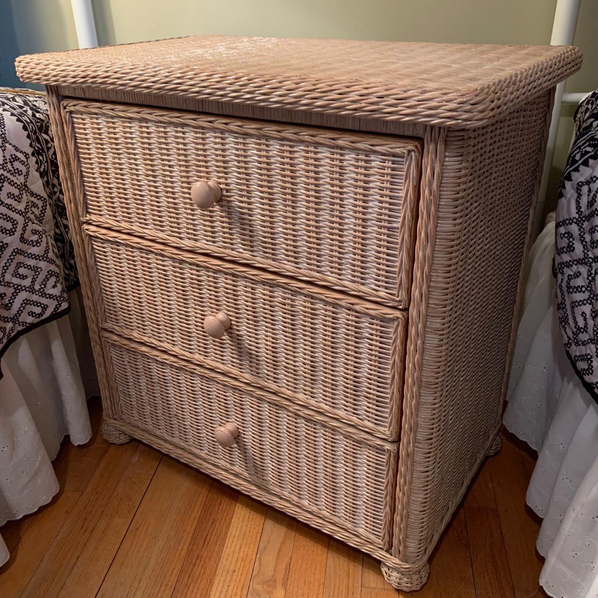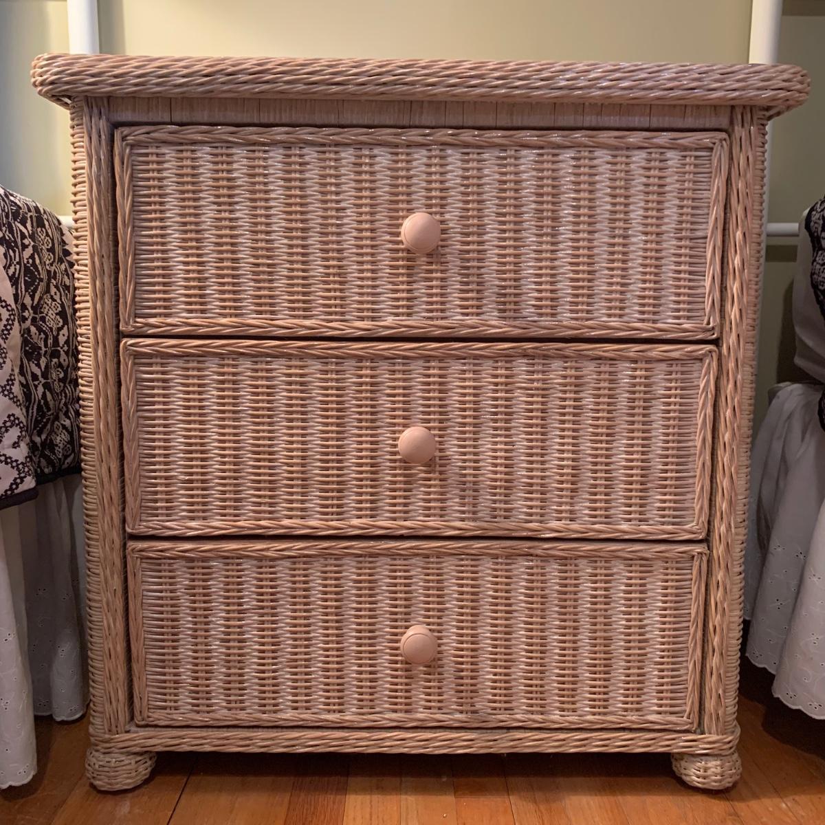 Chest of drawers with a manufactured wood base and wicker exterior. It is a beige-tan color. There are three drawers with wooden pulls. Chest measures 29” x 18” x 29.25”H. There is some staining inside one drawer.