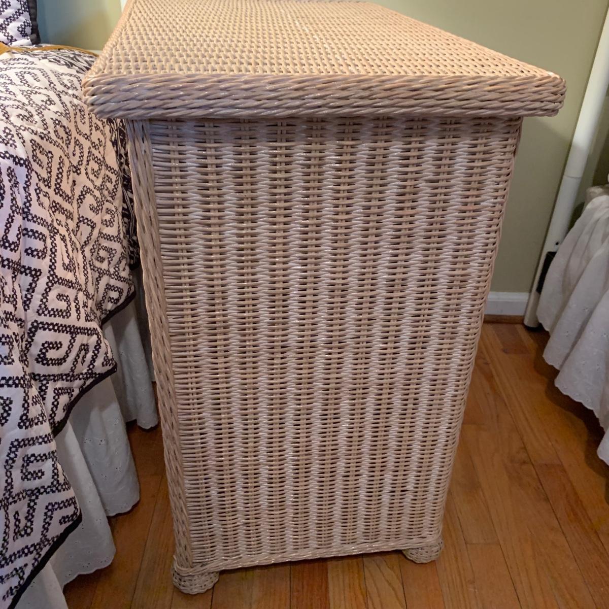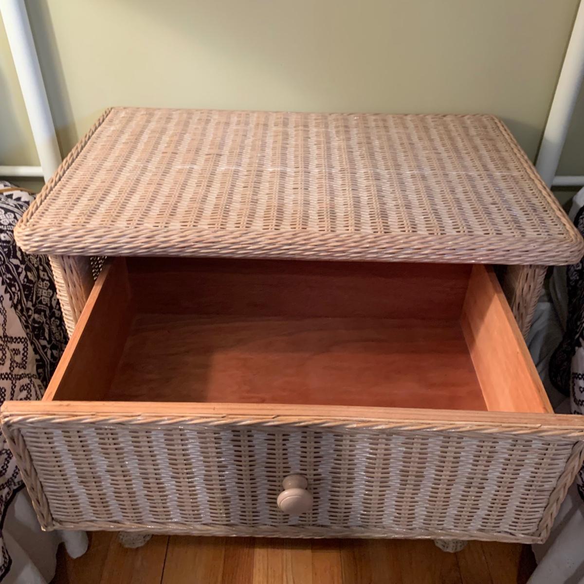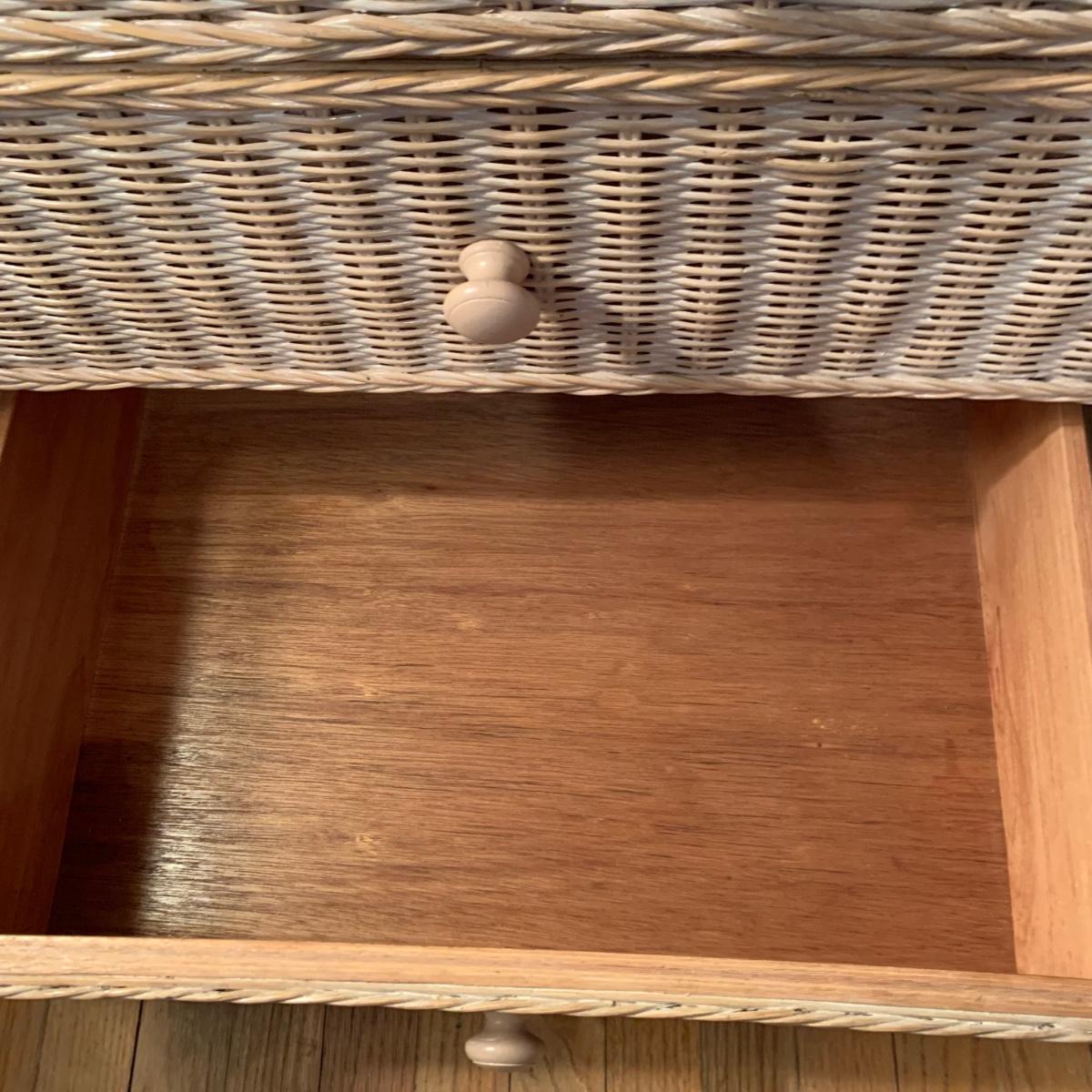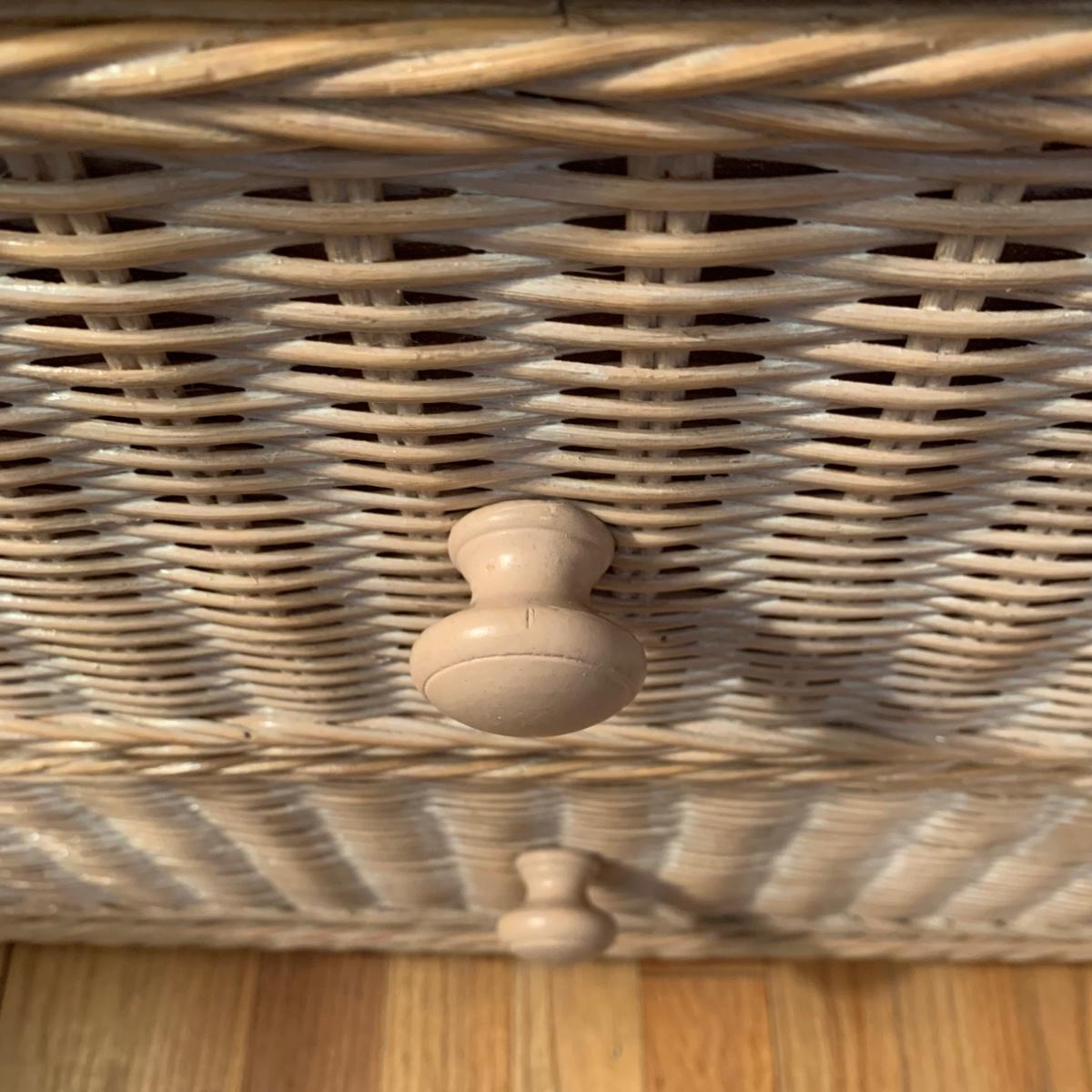 Chest of drawers with a manufactured wood base and wicker exterior. It is a beige-tan color. There are three drawers with wooden pulls. Chest measures 29” x 18” x 29.25”H. There is some staining inside one drawer.