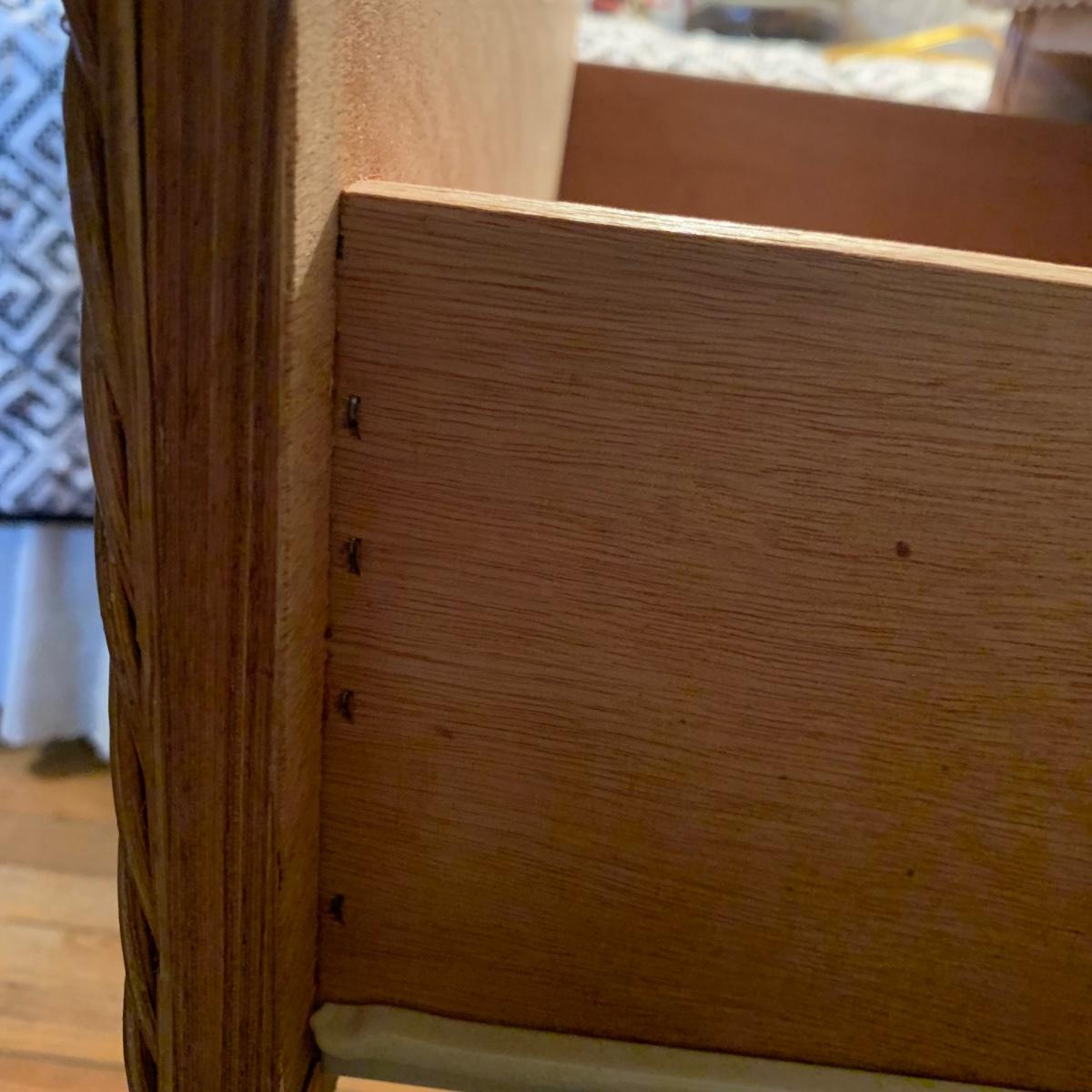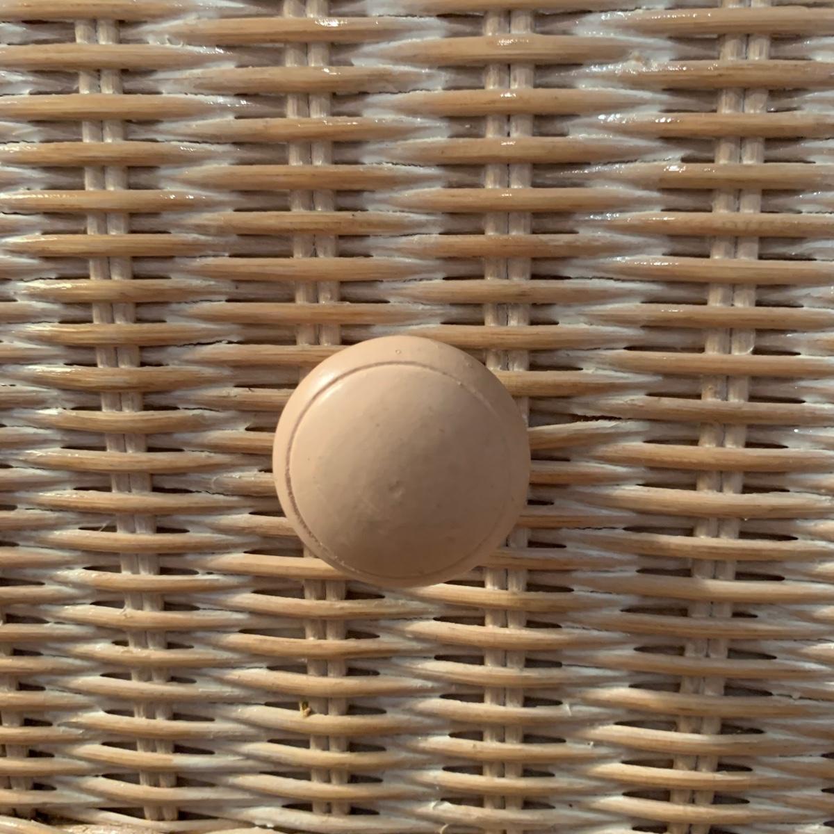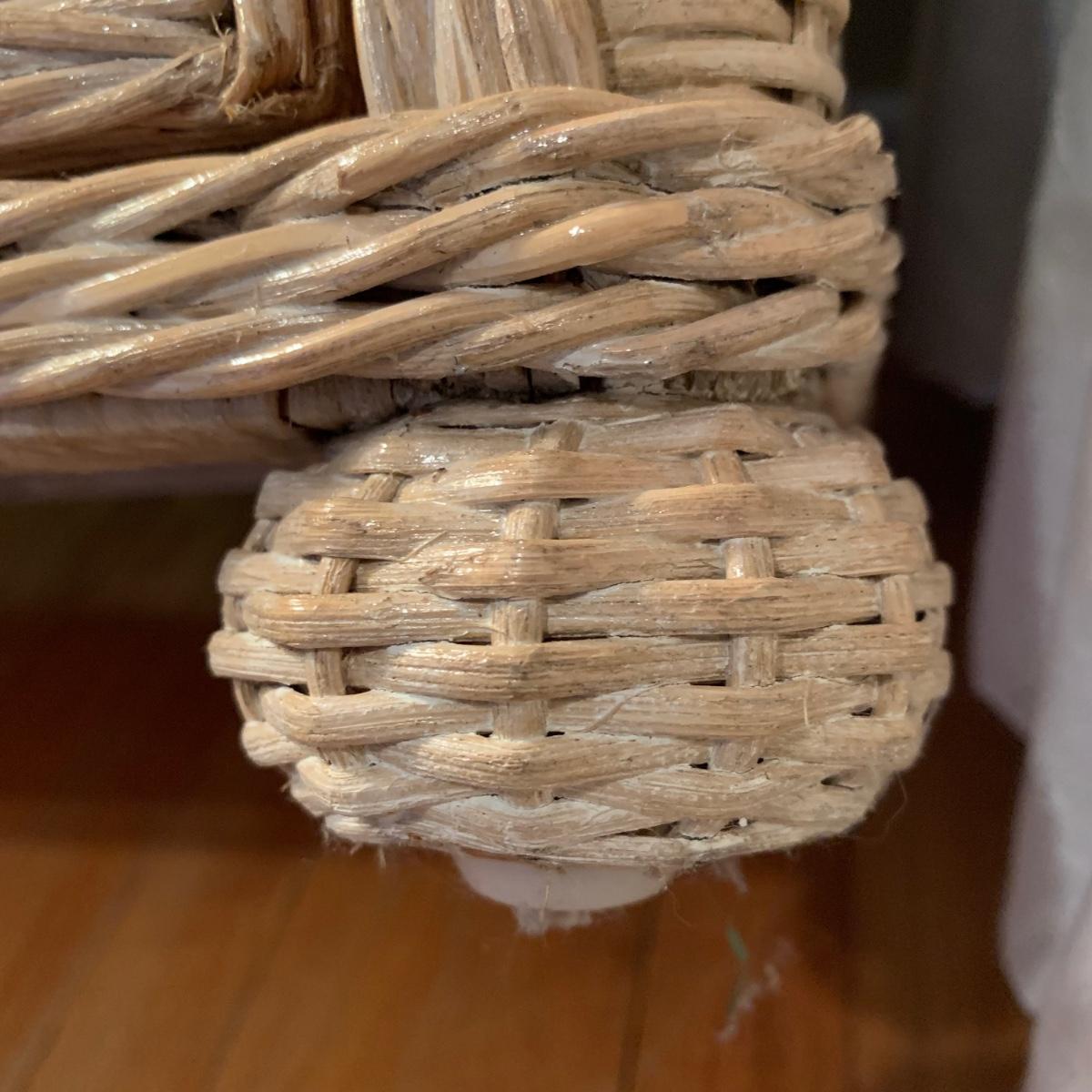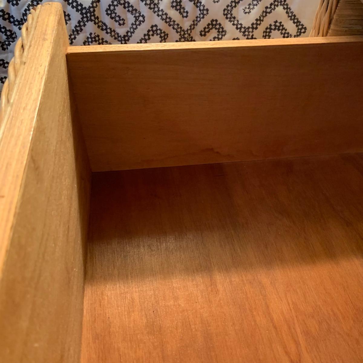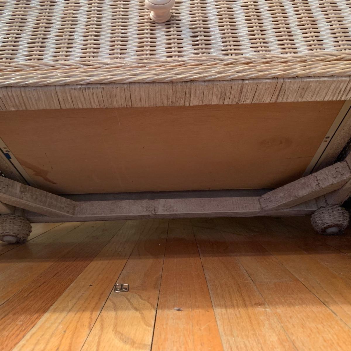 Chest of drawers with a manufactured wood base and wicker exterior. It is a beige-tan color. There are three drawers with wooden pulls. Chest measures 29” x 18” x 29.25”H. There is some staining inside one drawer.