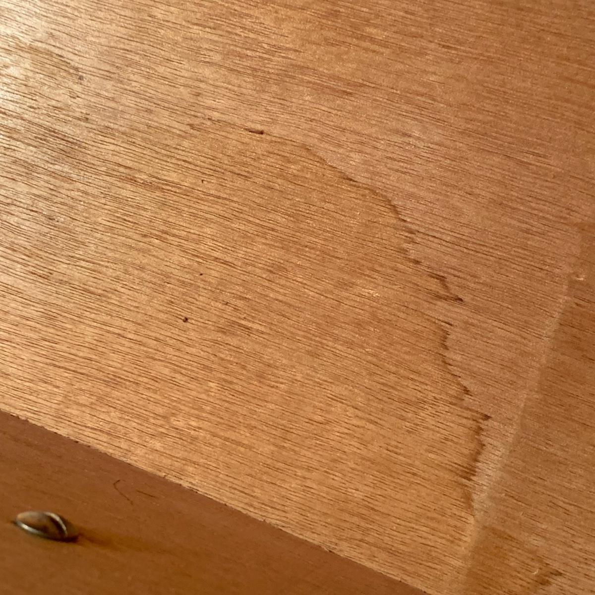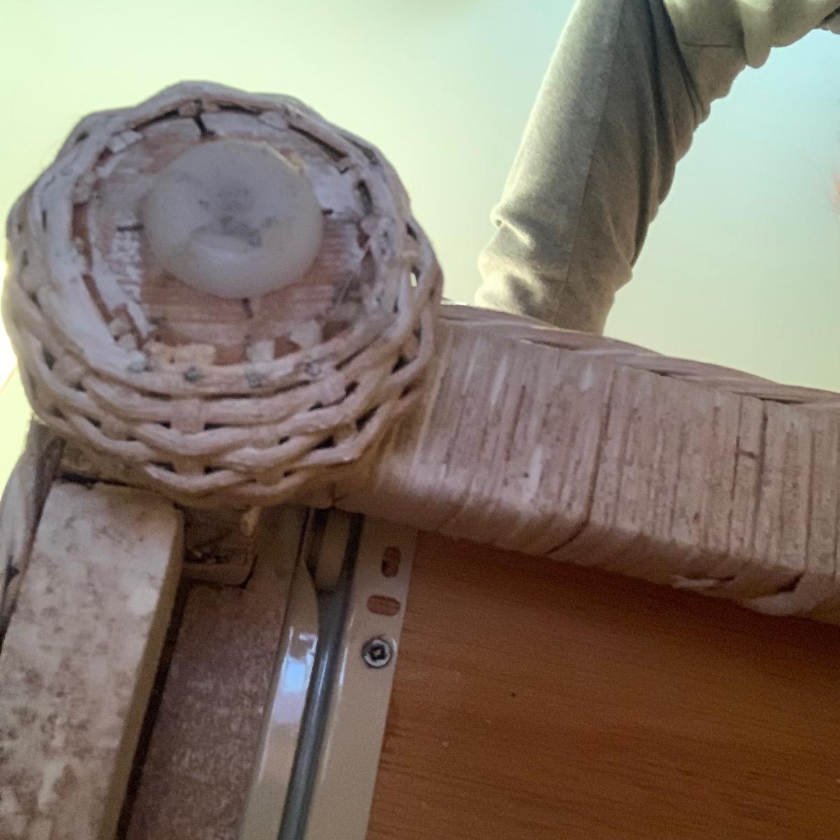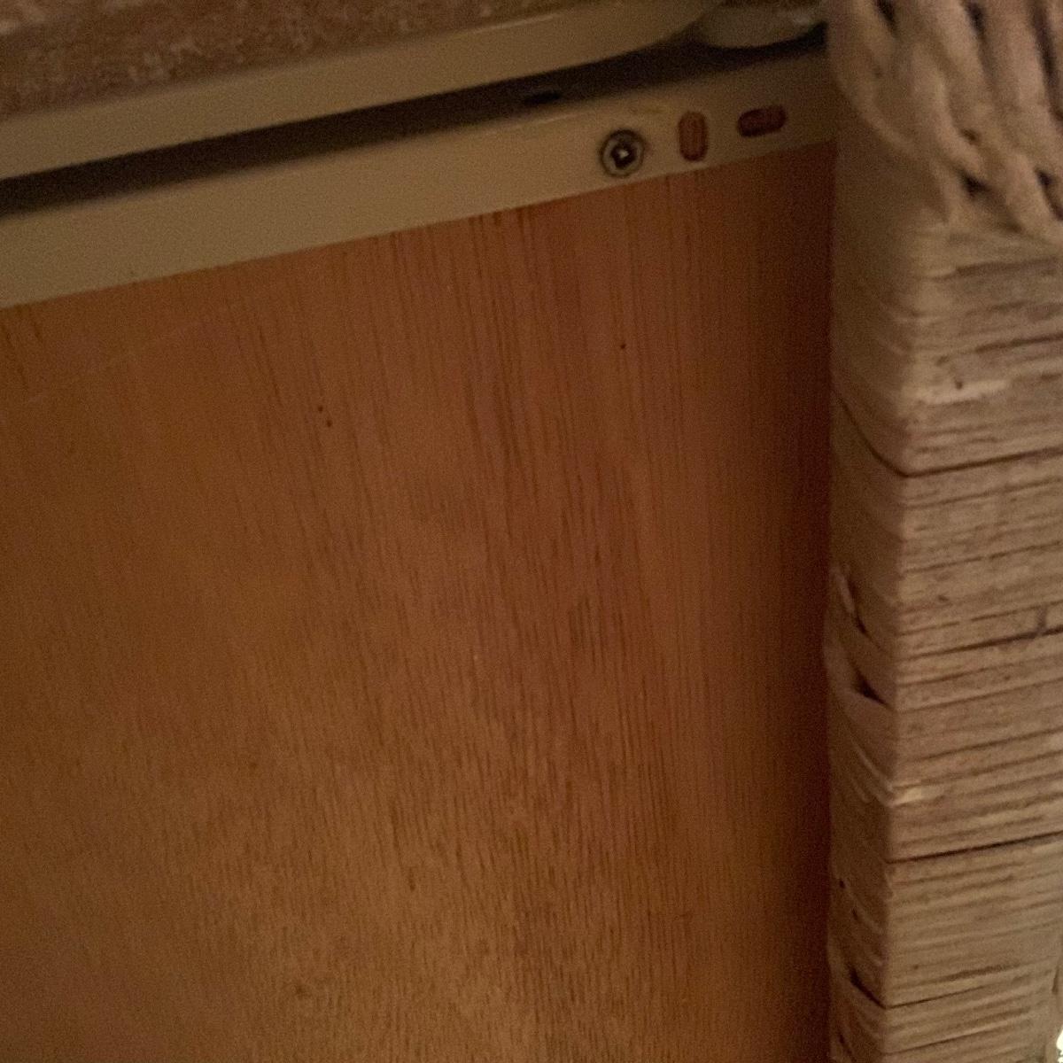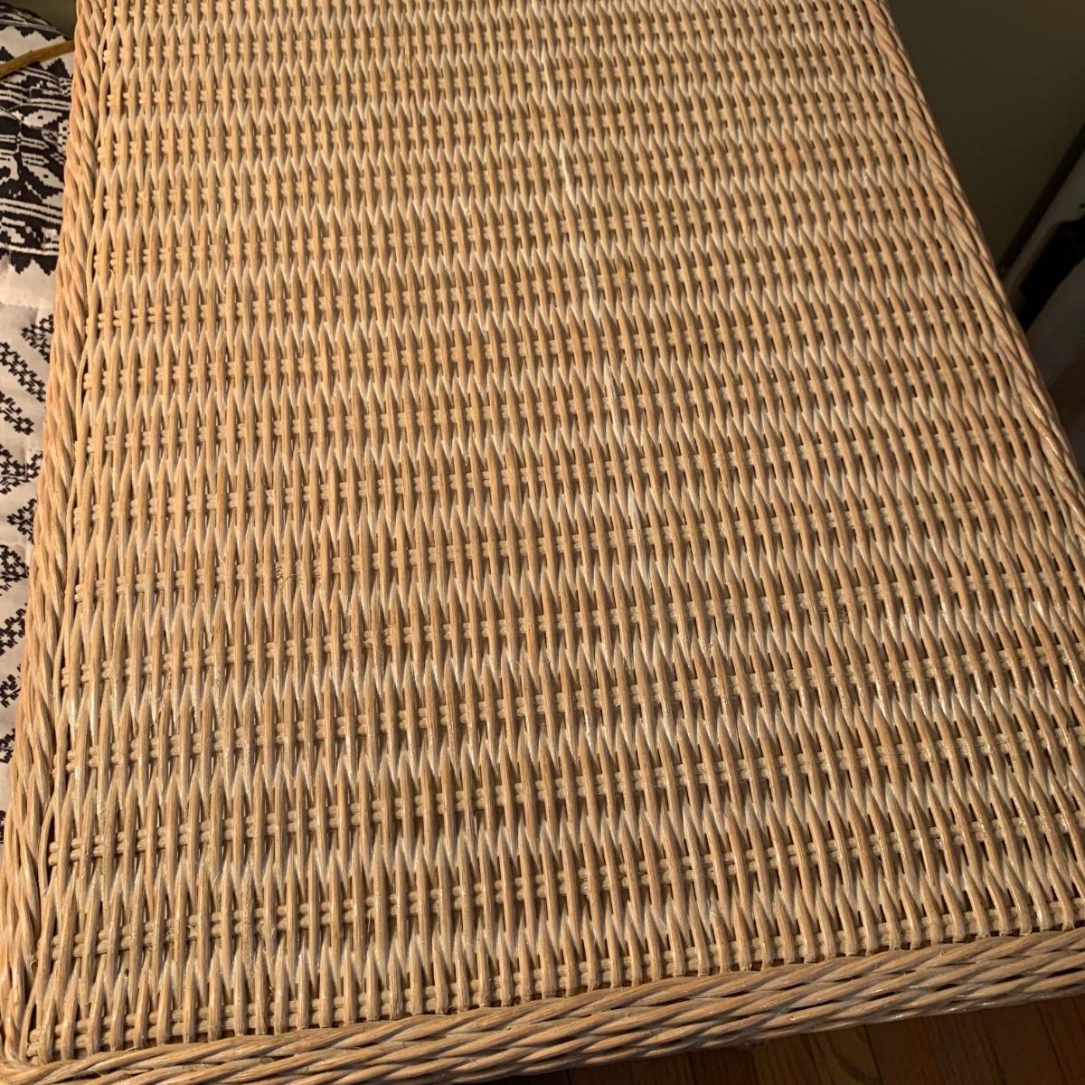 Chest of drawers with a manufactured wood base and wicker exterior. It is a beige-tan color. There are three drawers with wooden pulls. Chest measures 29” x 18” x 29.25”H. There is some staining inside one drawer.