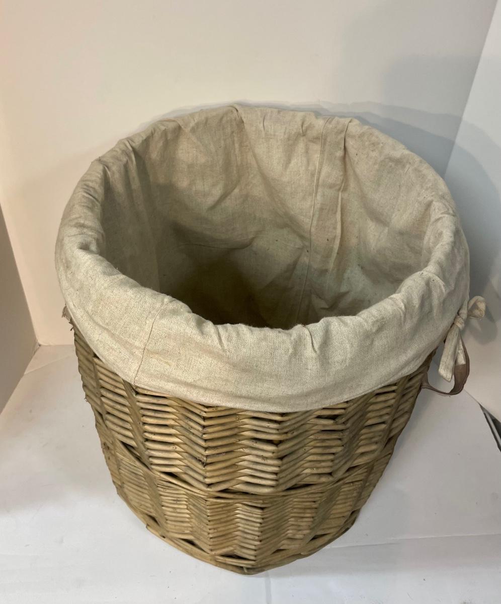 Round Small Wicker Laundry Basket Hamper with Removeable Liner Bag. In previously used condition. Wicker is in good shape, liner needs a wash.