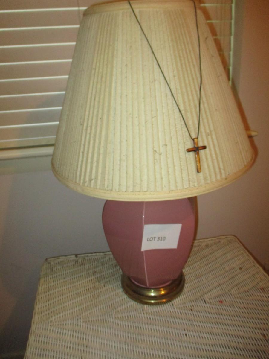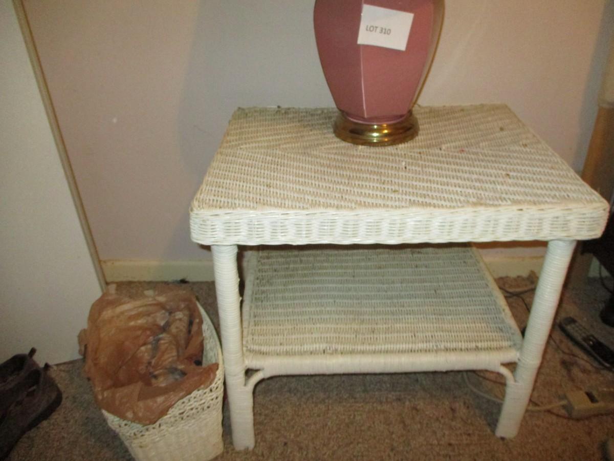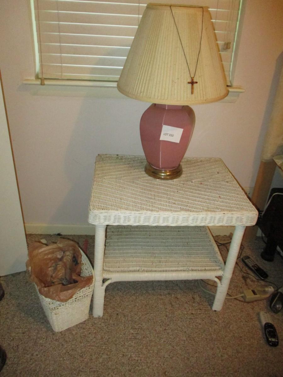 Wicker wastebasket, end table, and ceramic lamp. Good condition