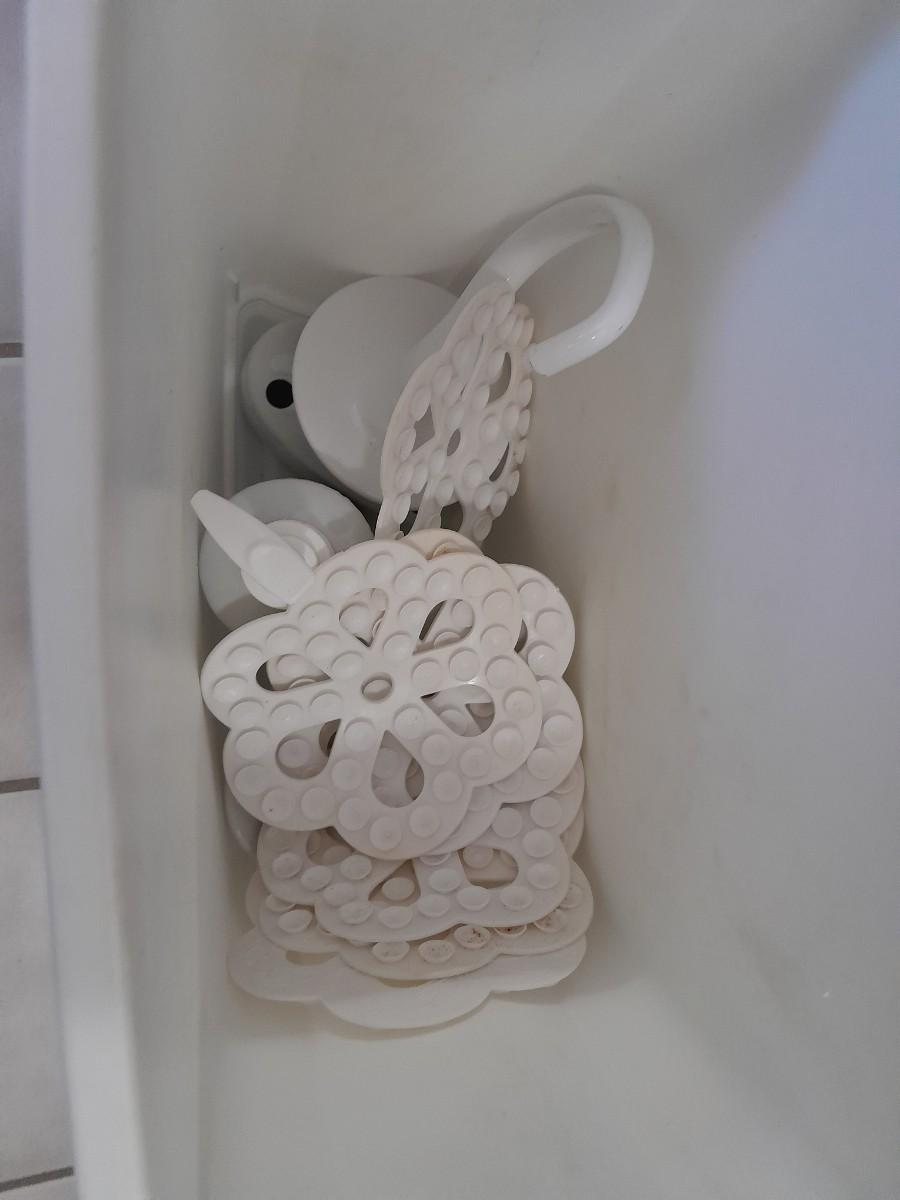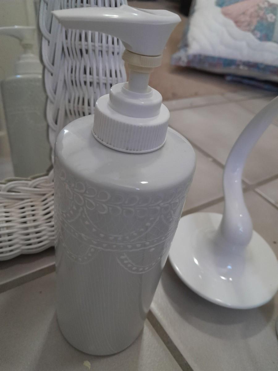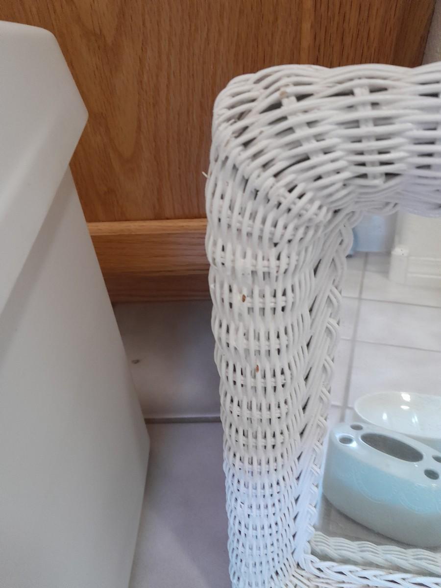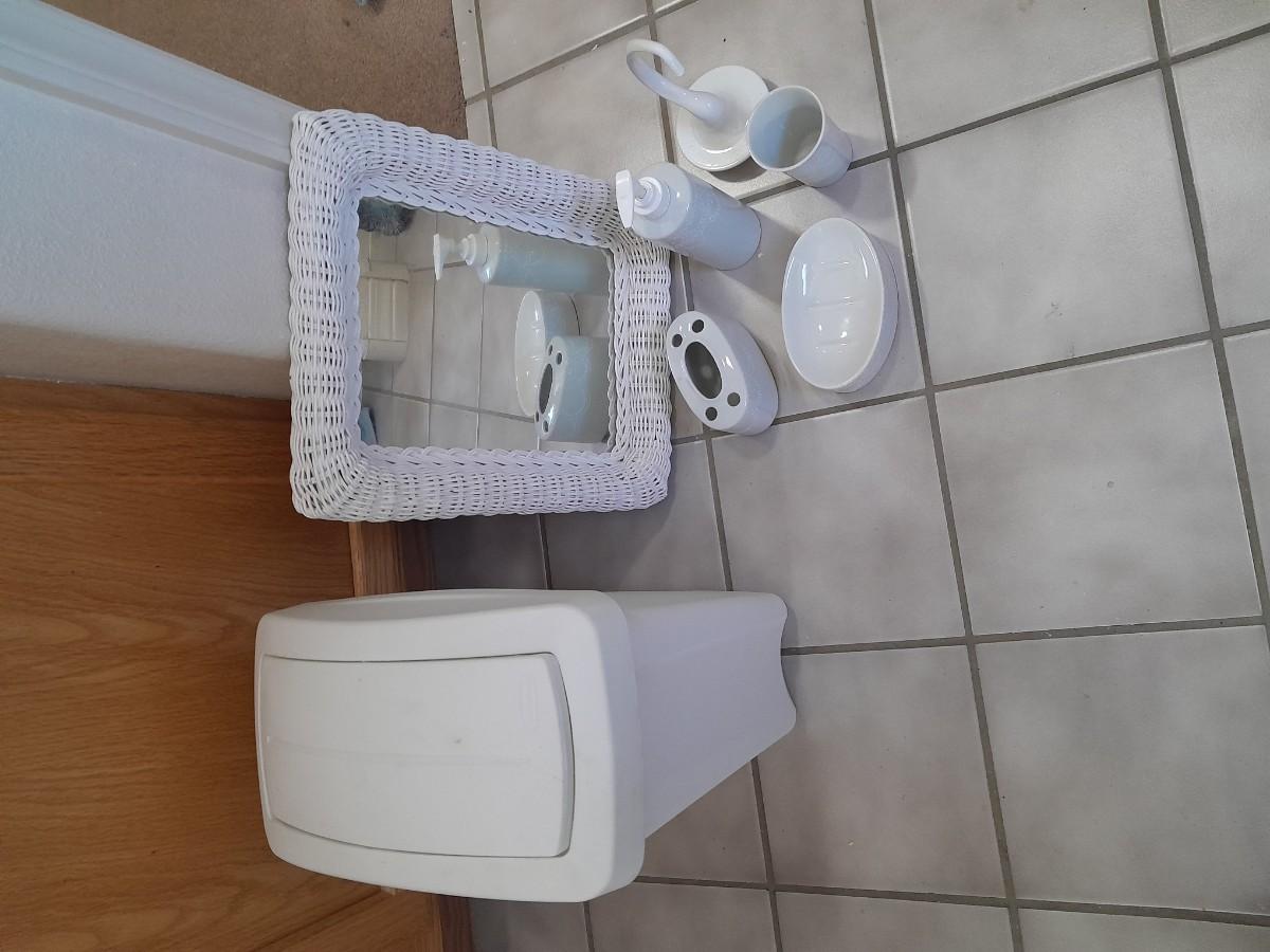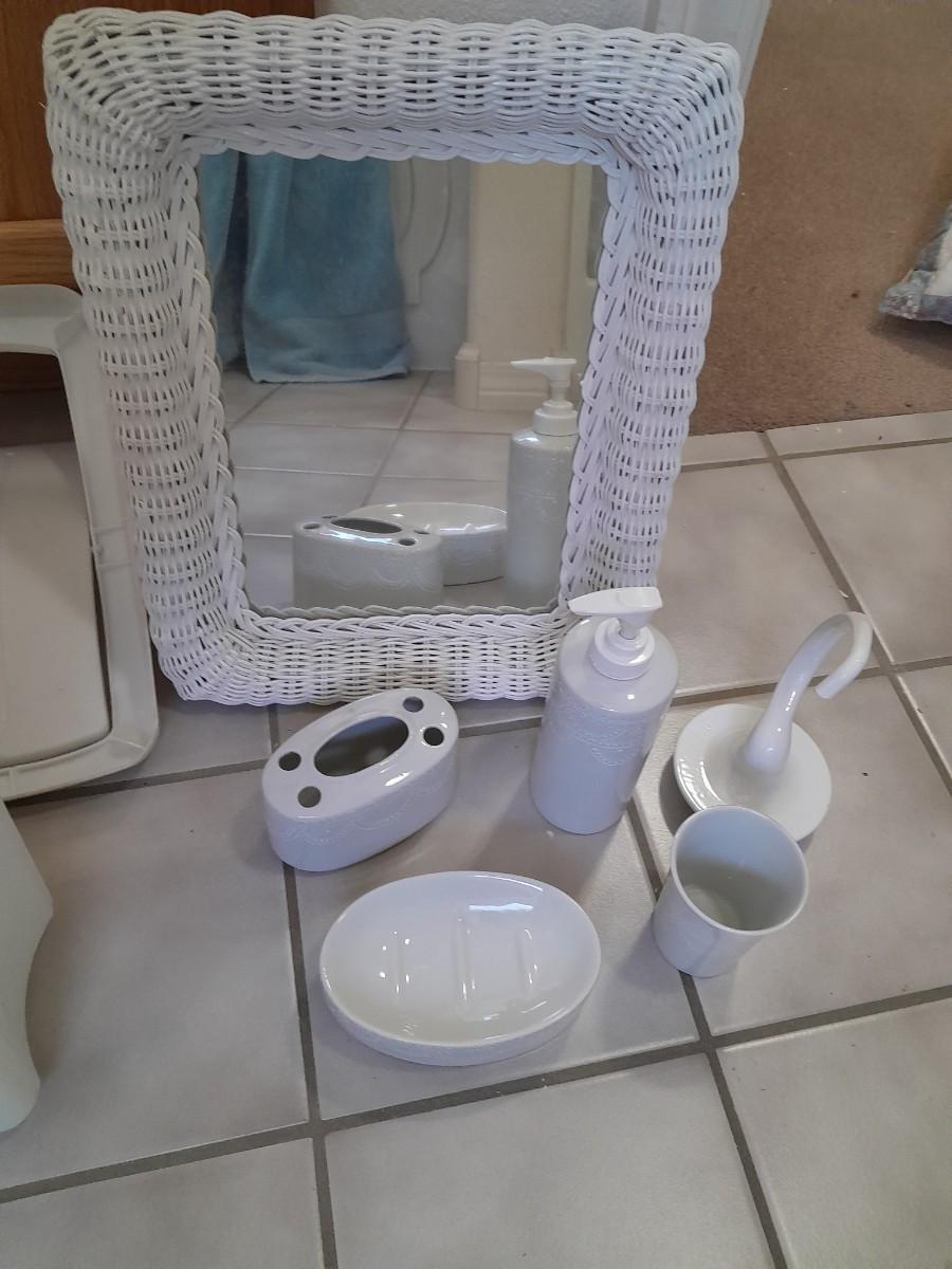 WICKER FRAMED MIRROR, WASTE CAN AND A BATHROOM ENSEMBLE
