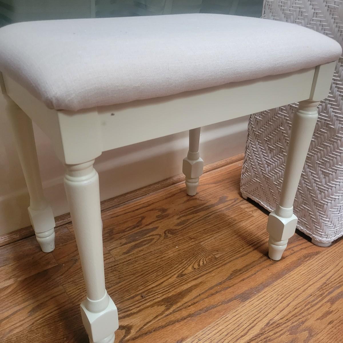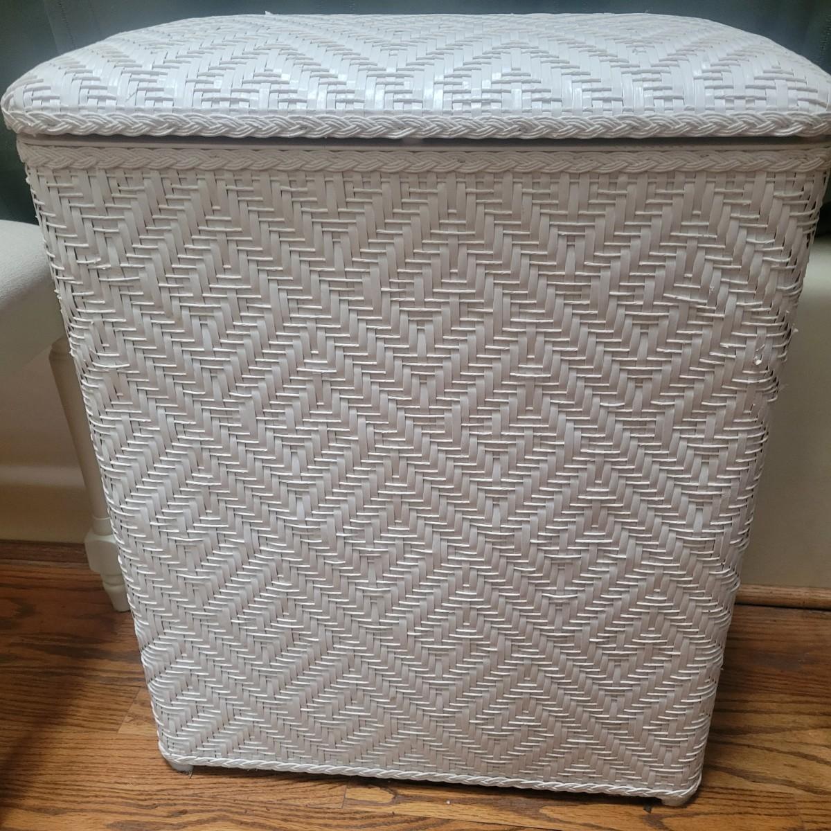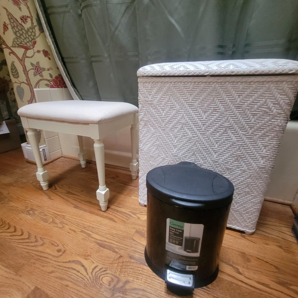 White wicker laundry basket in good condition. Measures approximately 19" x 11" x 24". Linen upholstered vanity stool and a small step open trashcan. Local pickup only