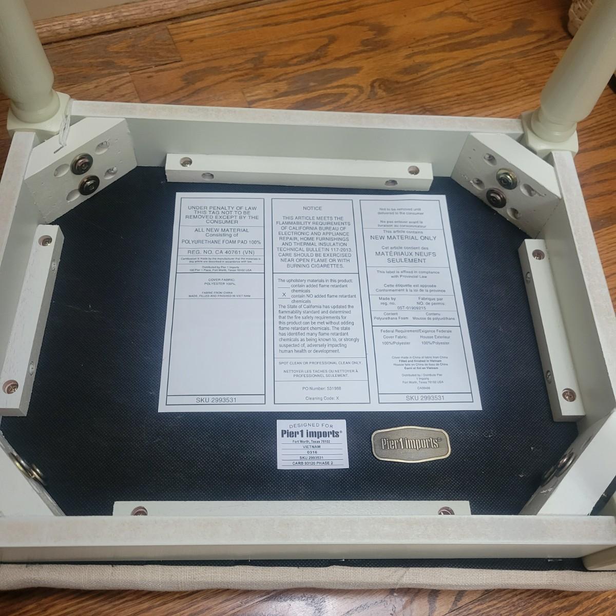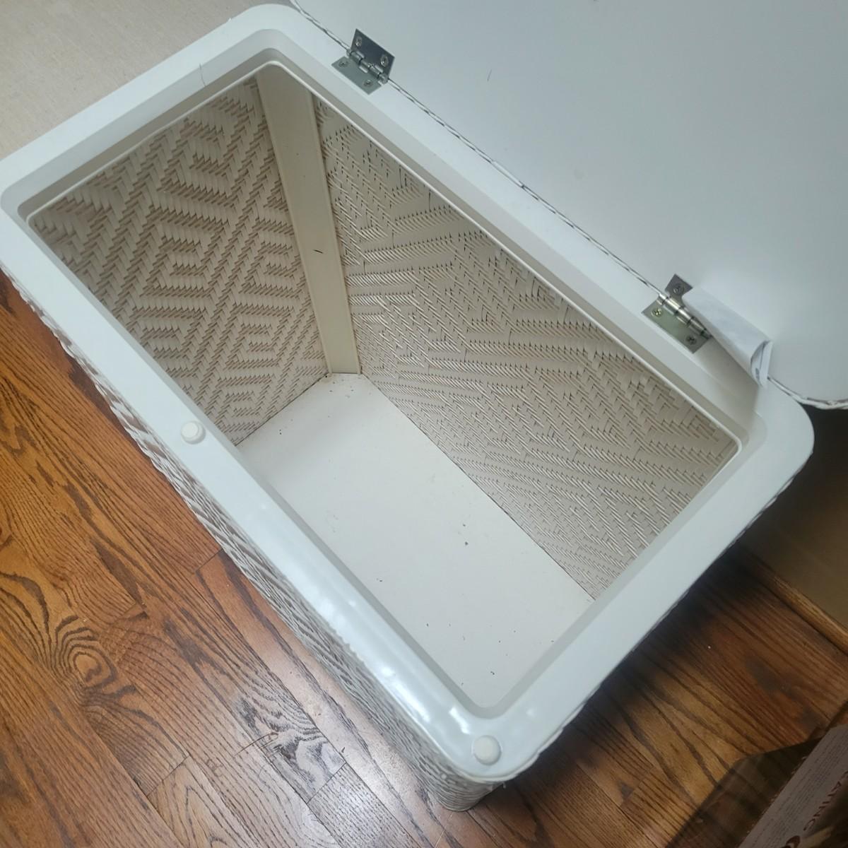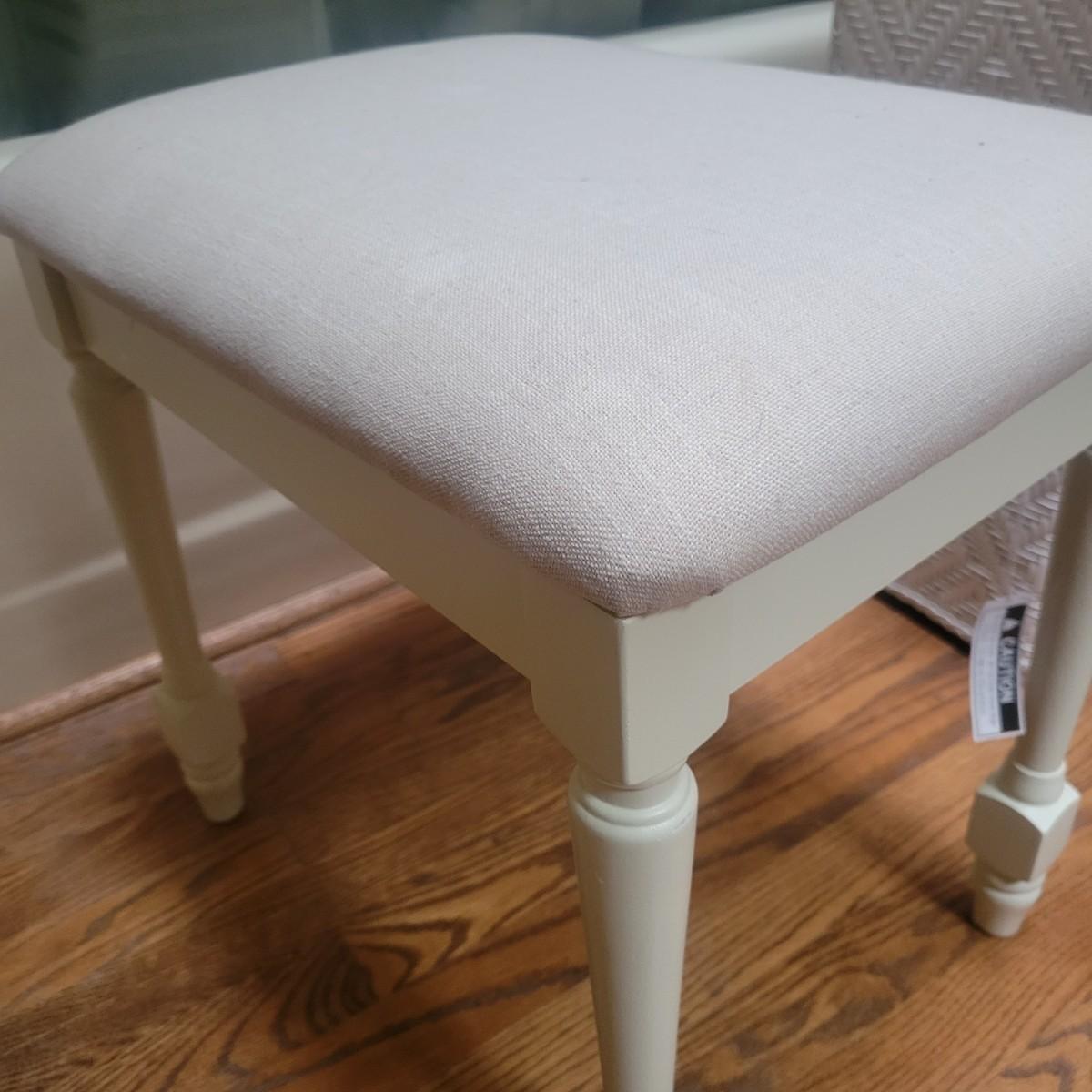 White wicker laundry basket in good condition. Measures approximately 19" x 11" x 24". Linen upholstered vanity stool and a small step open trashcan. Local pickup only