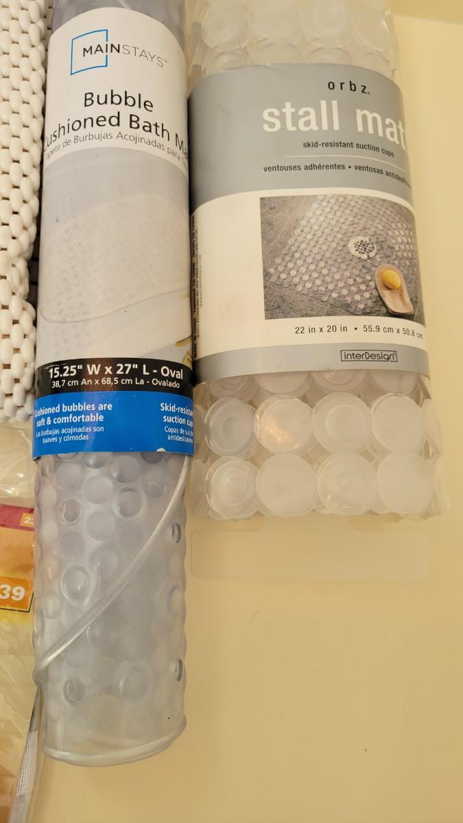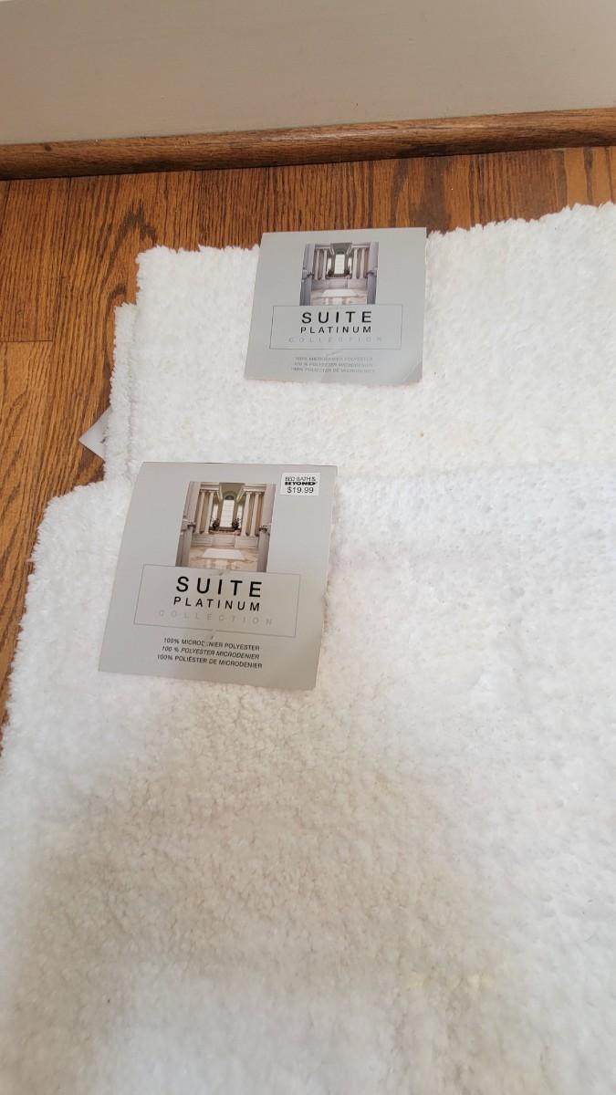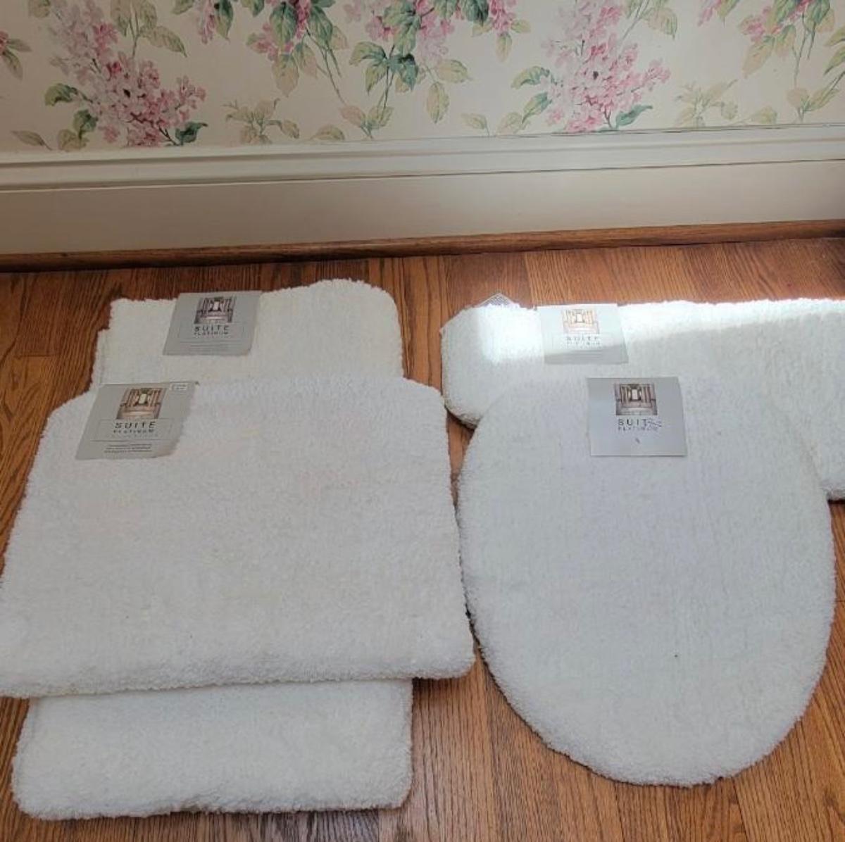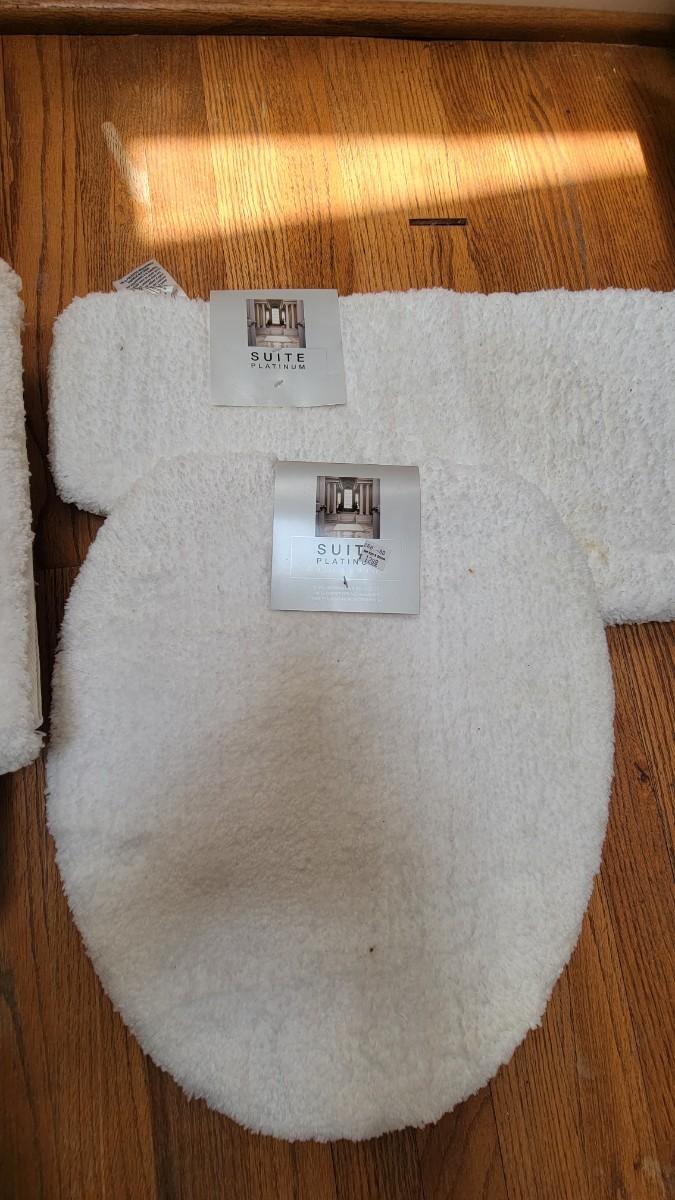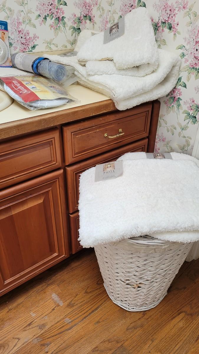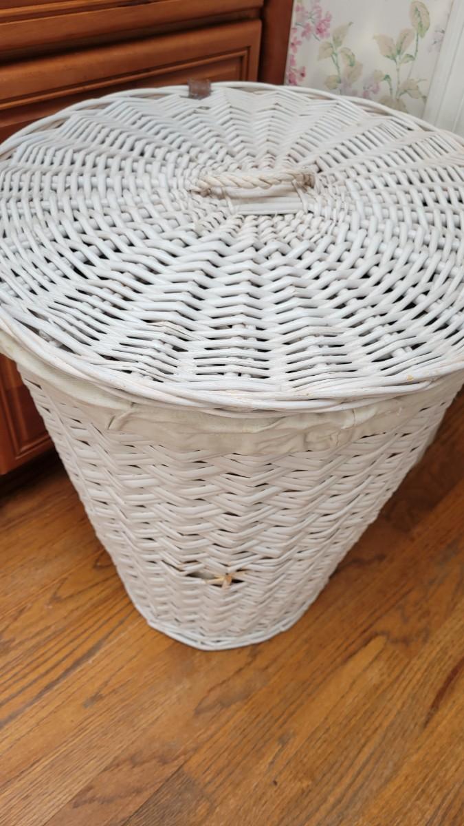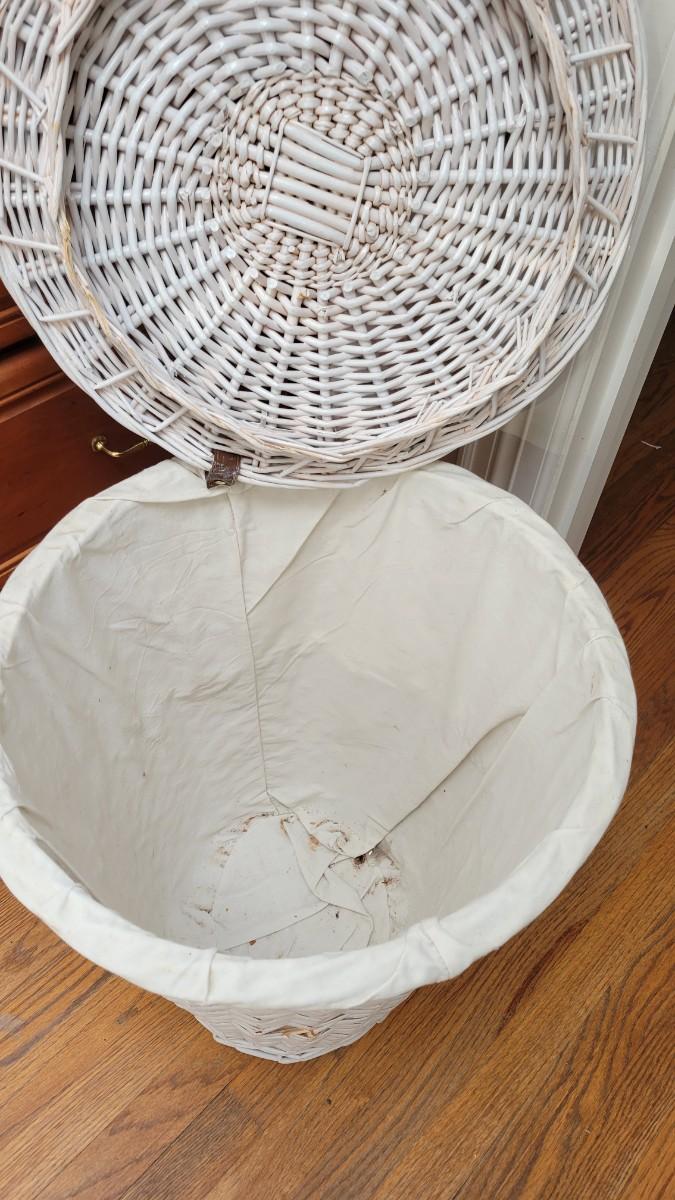 Wicker laundry basket with lid and liner. Some broken wicker pieces. Measures approximately 18" x 22". Assorted anti slip tub liners and a bathroom rug set. Set is new with tags, but does have some staining. See photos. Largest rug is approximately 27" x 45" Local pickup only