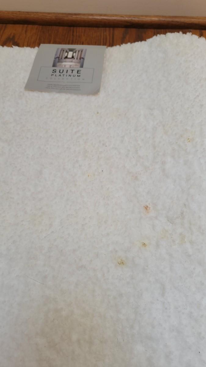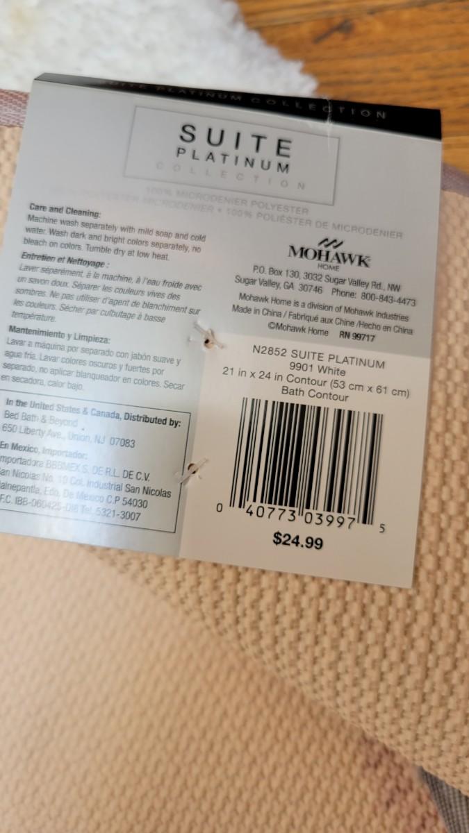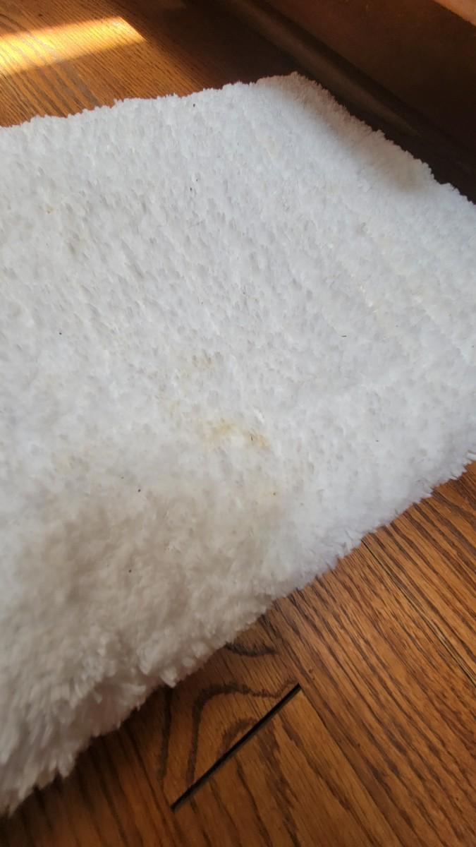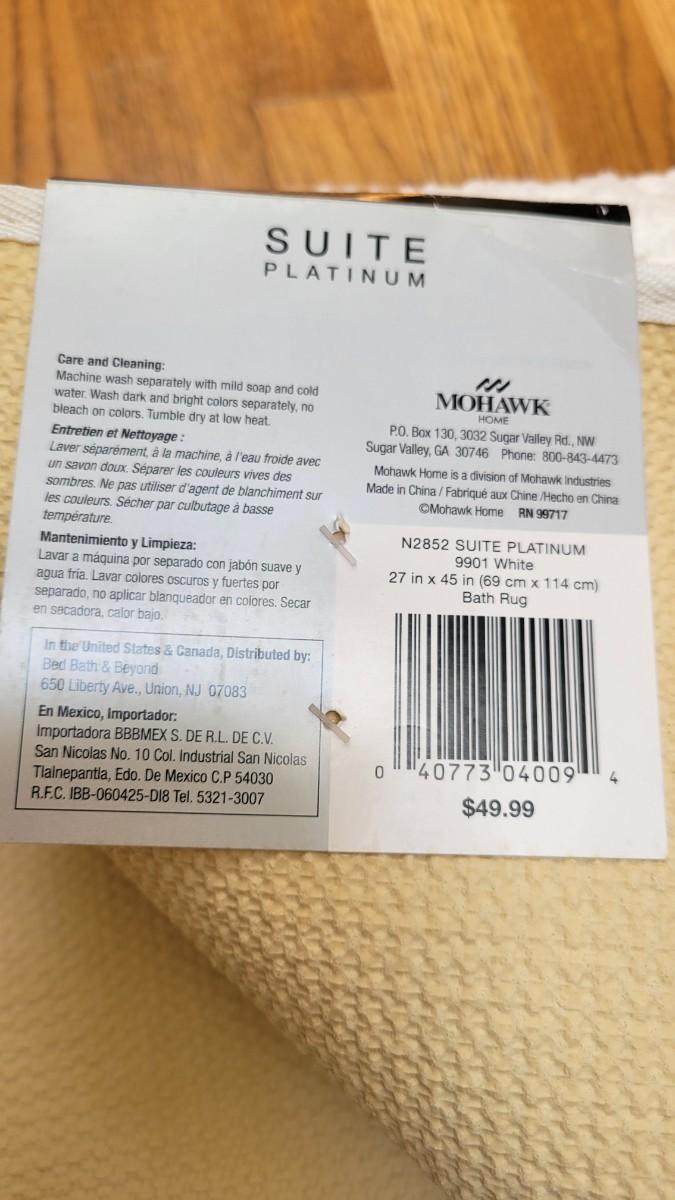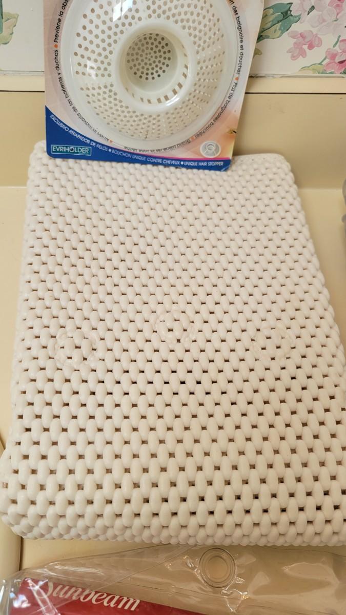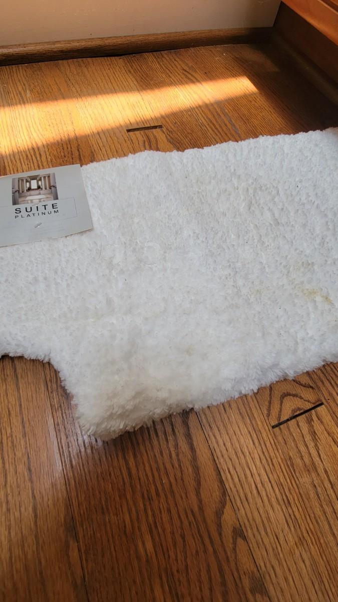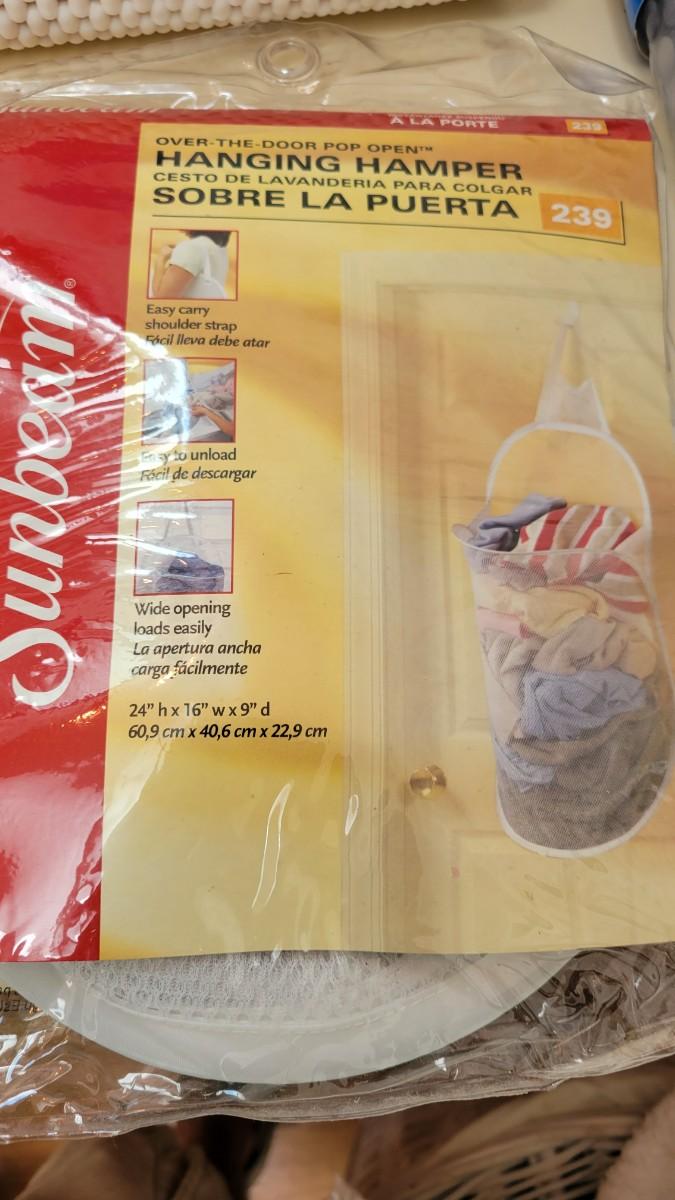 Wicker laundry basket with lid and liner. Some broken wicker pieces. Measures approximately 18" x 22". Assorted anti slip tub liners and a bathroom rug set. Set is new with tags, but does have some staining. See photos. Largest rug is approximately 27" x 45" Local pickup only