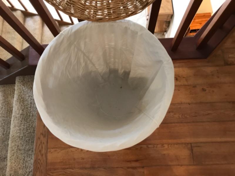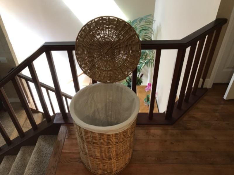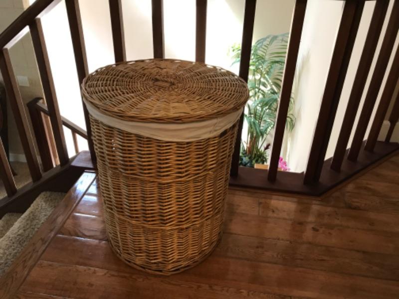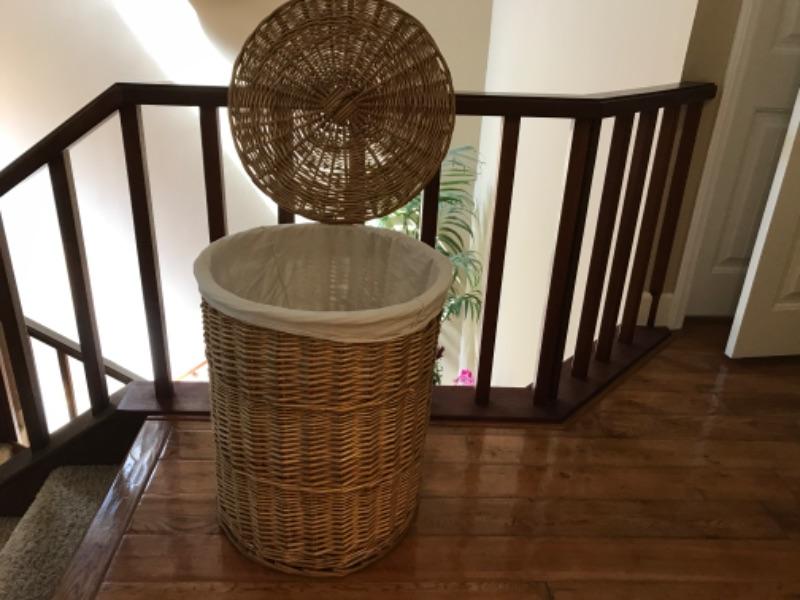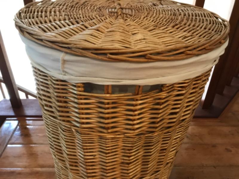 Wicker laundry hamper. Linen liner and lid attached. Good Condition.