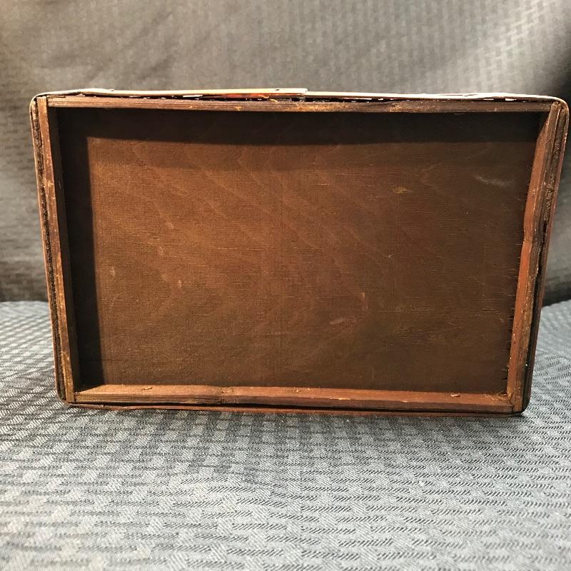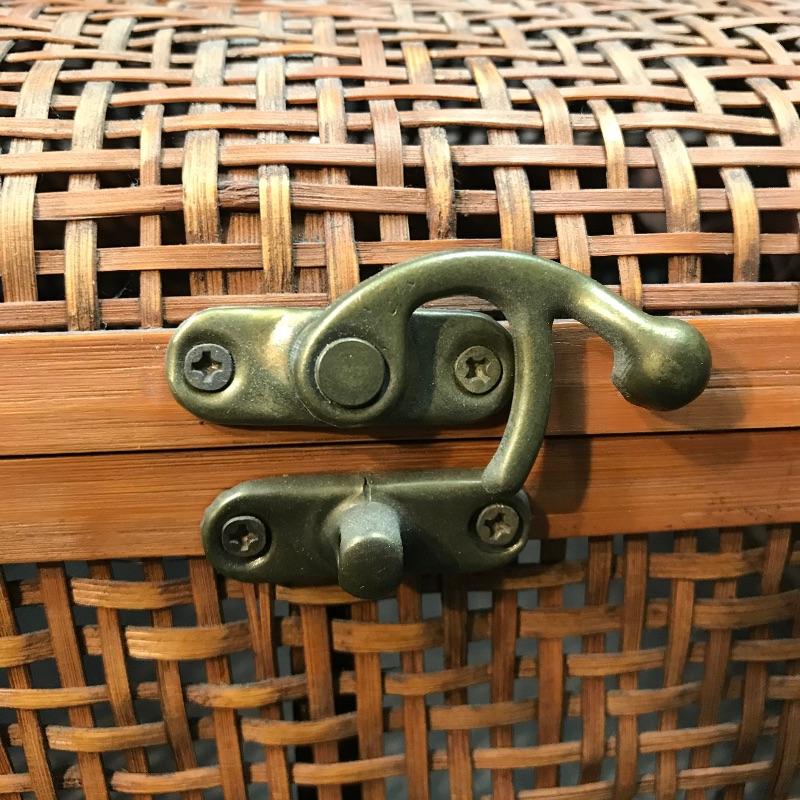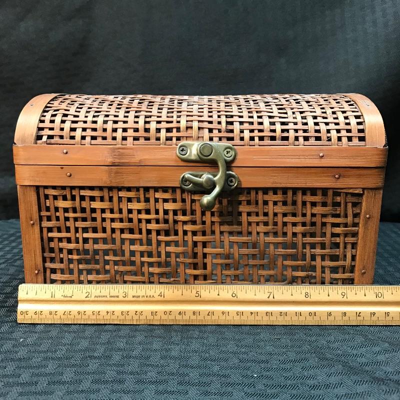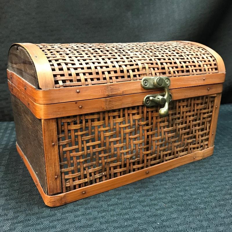 One wicker and bolsa wood miniature treasure chest with hinged closure. The bottom part of the hinge has the screws slightly loose. This can easily be tightened with a screwdriver unmarked; see pictures.