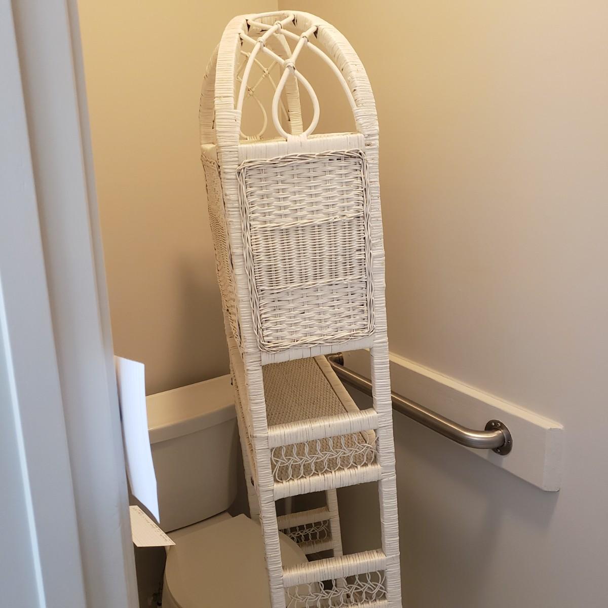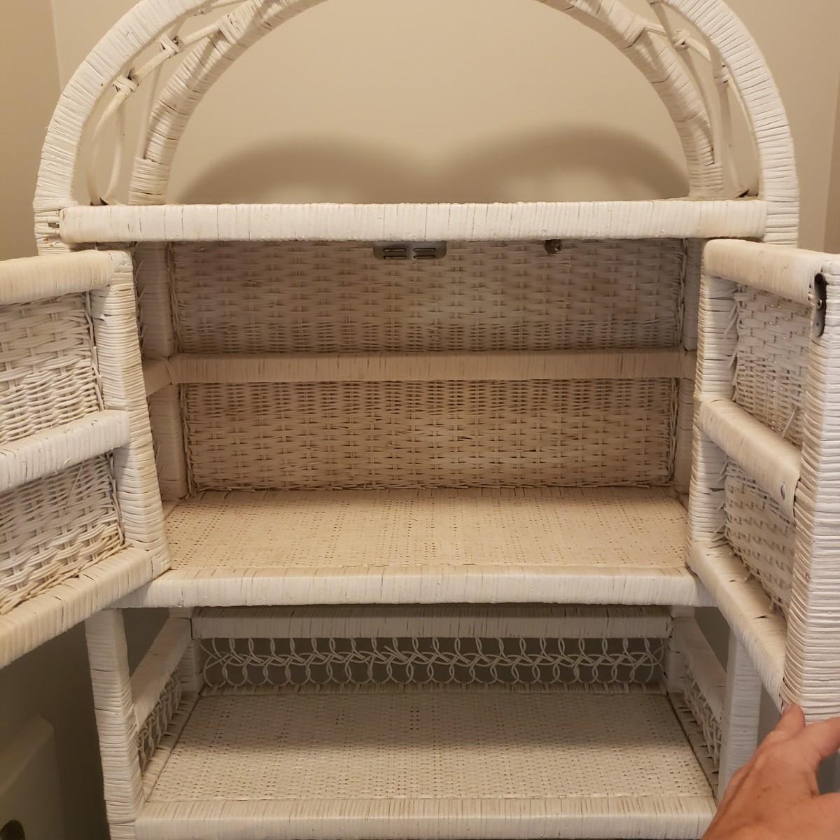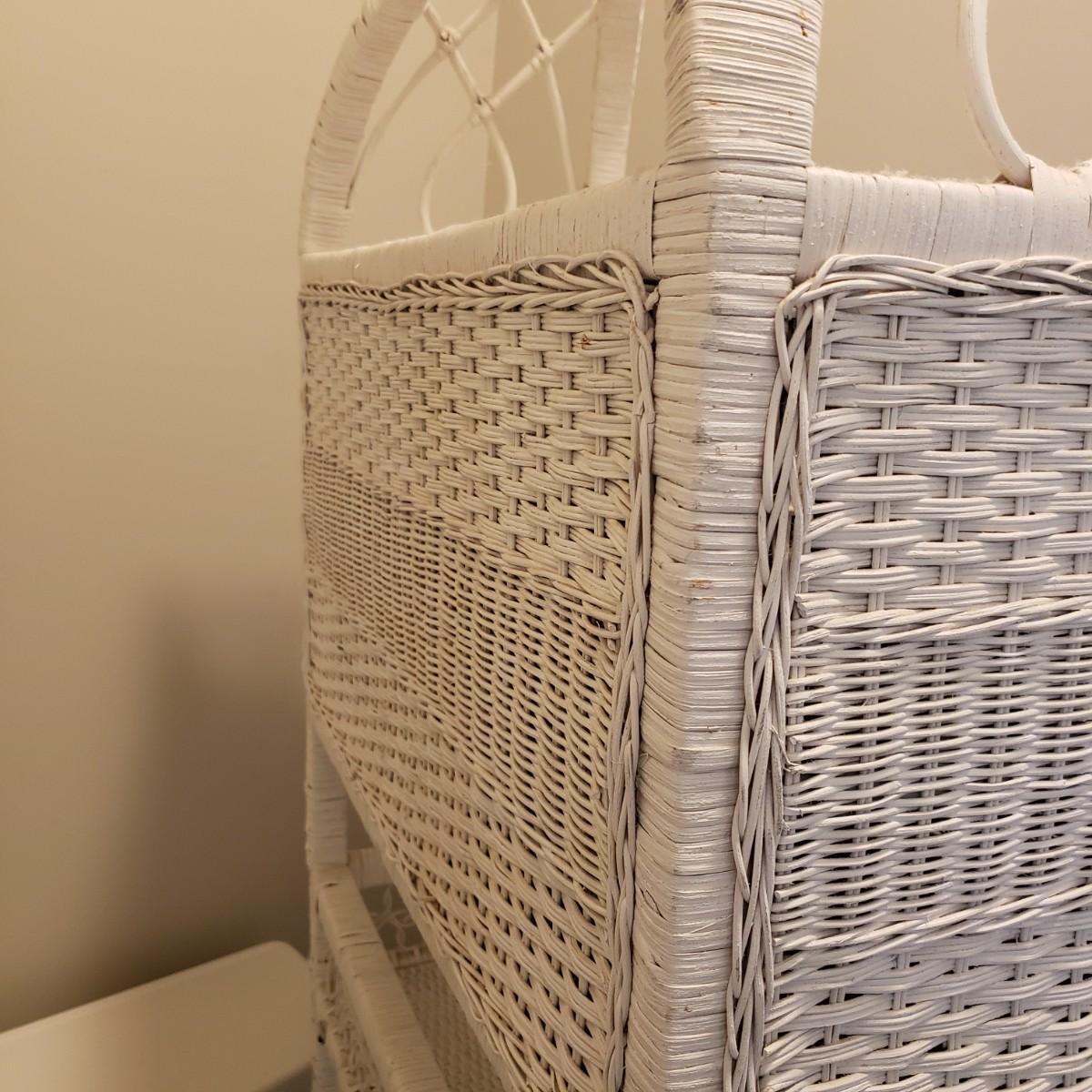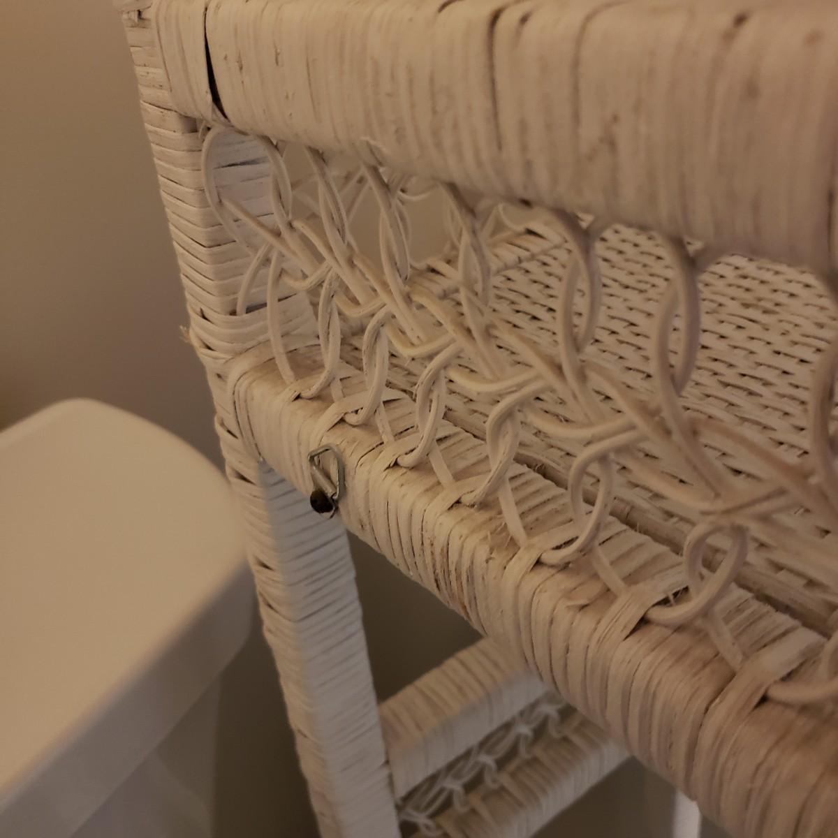 This is a white wicker over the toilet storage unit. The unit measures 25" x 10" x 66"H. The unit has a door storage area and a shelf under it. There is some paint chipped off, see picture.
