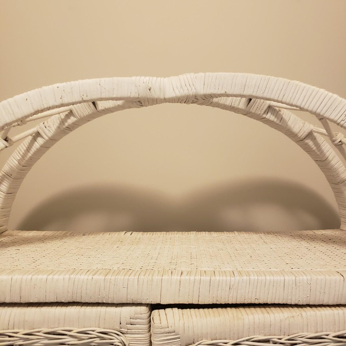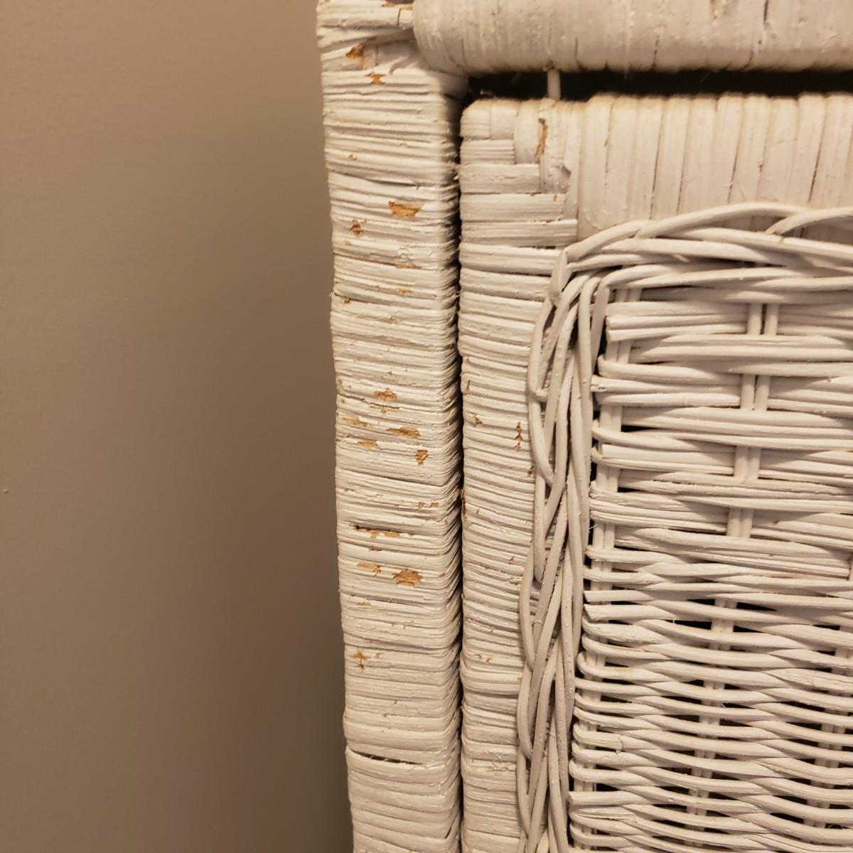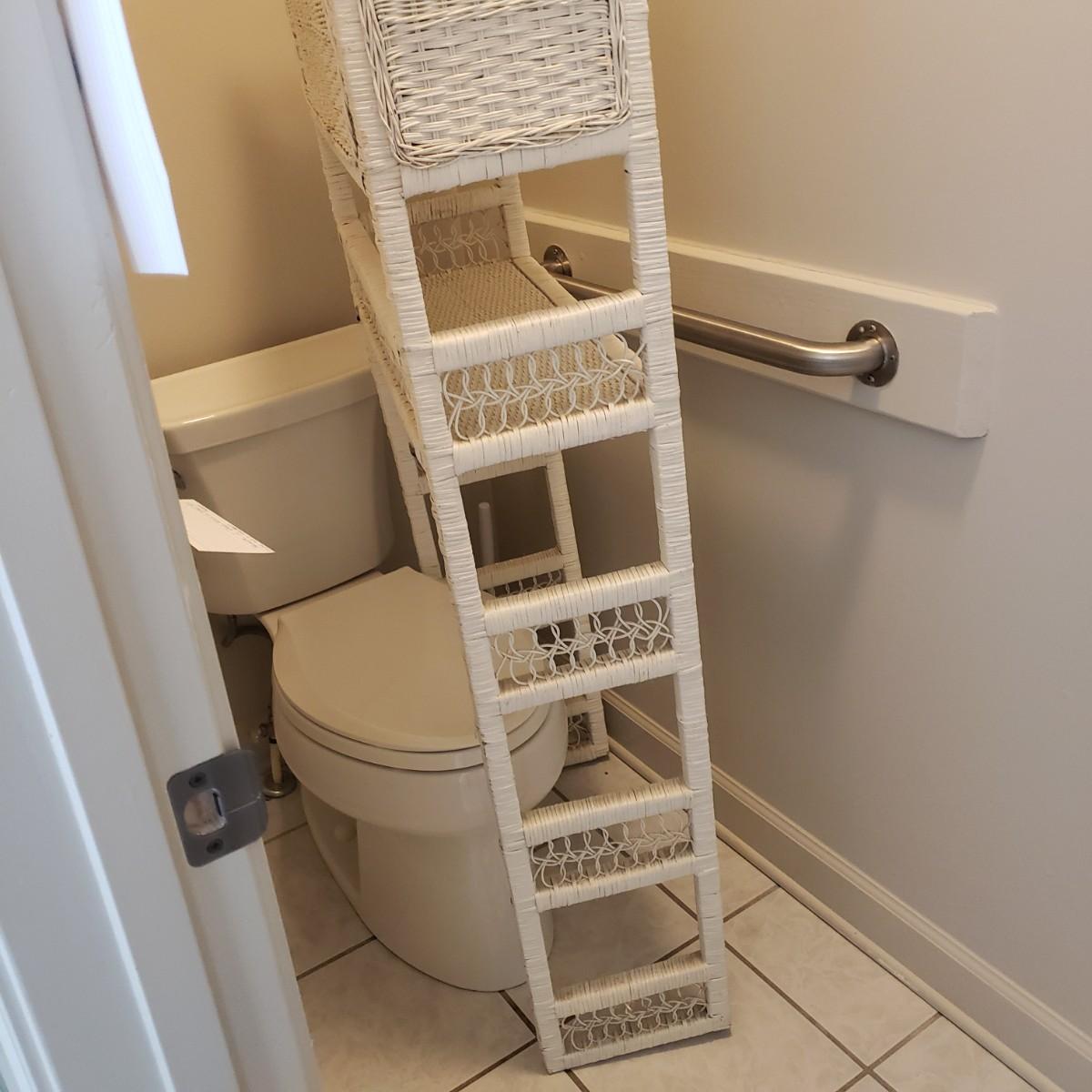 This is a white wicker over the toilet storage unit. The unit measures 25" x 10" x 66"H. The unit has a door storage area and a shelf under it. There is some paint chipped off, see picture.