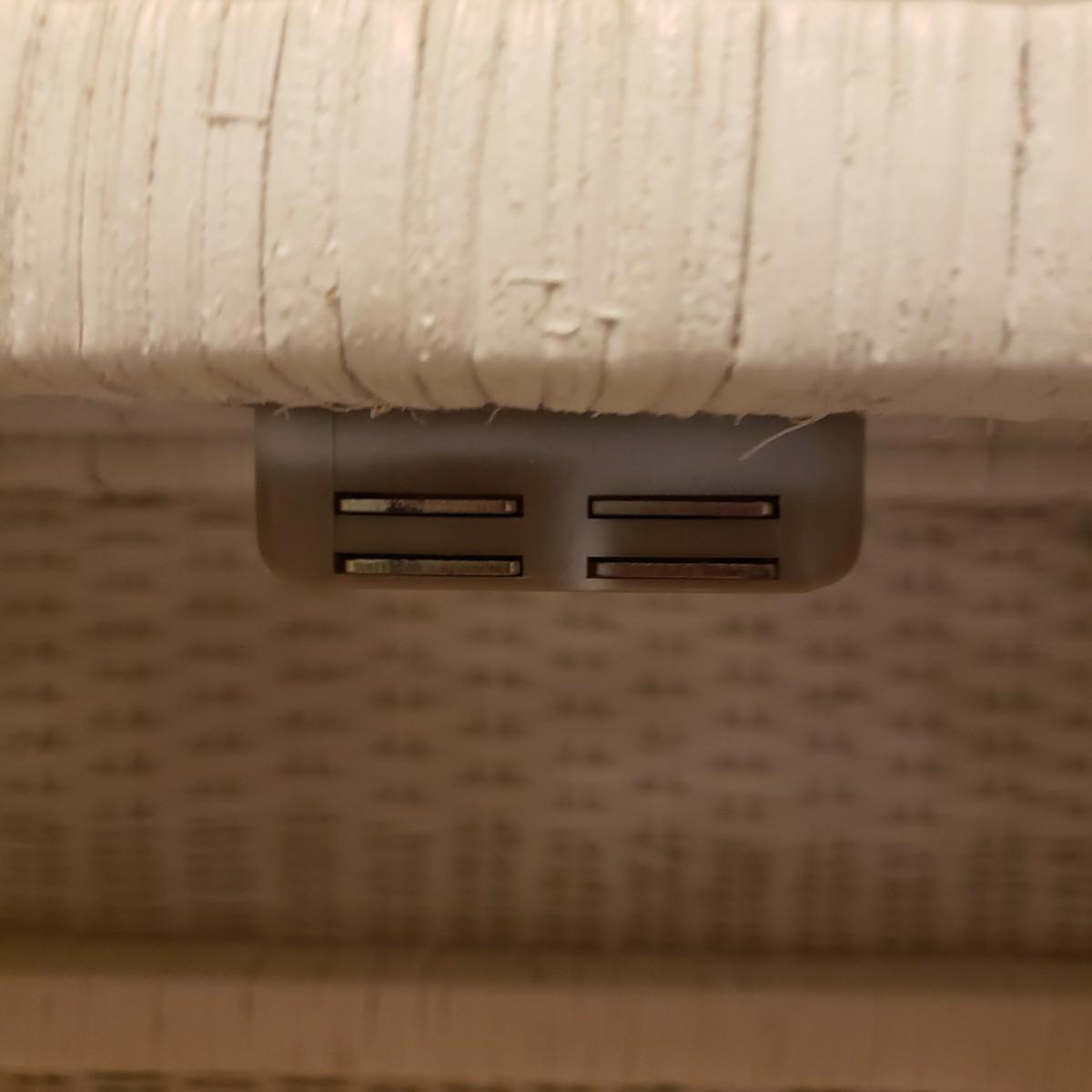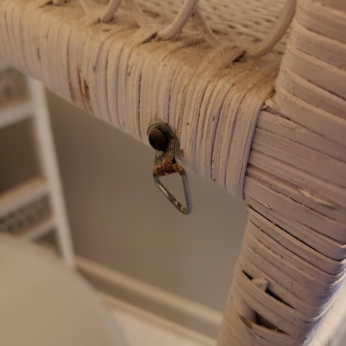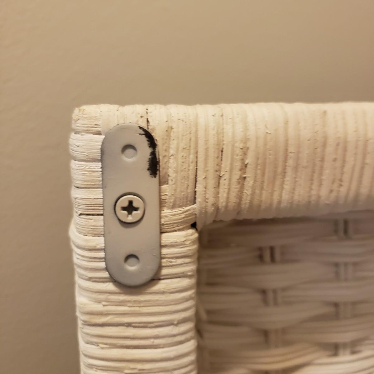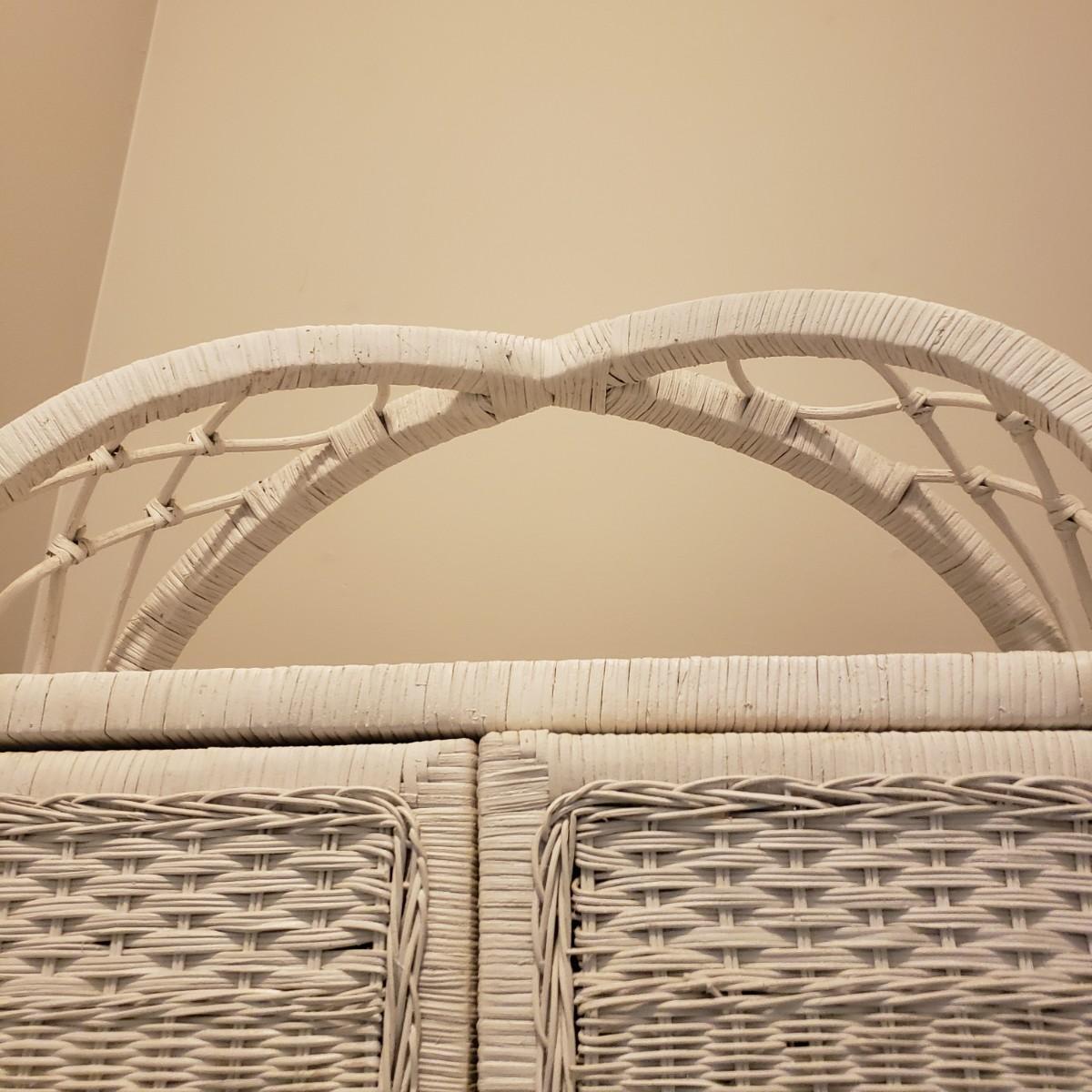 This is a white wicker over the toilet storage unit. The unit measures 25" x 10" x 66"H. The unit has a door storage area and a shelf under it. There is some paint chipped off, see picture.