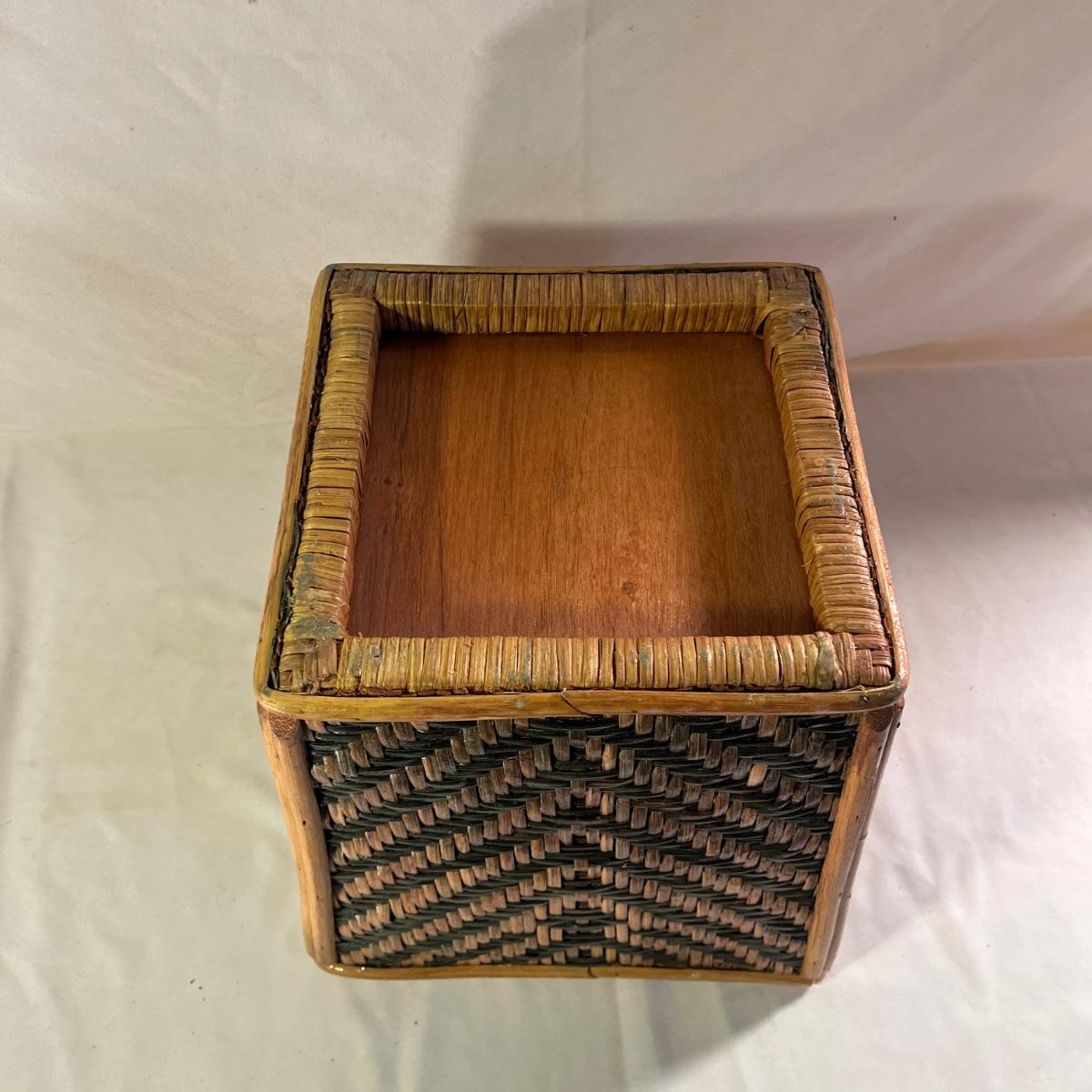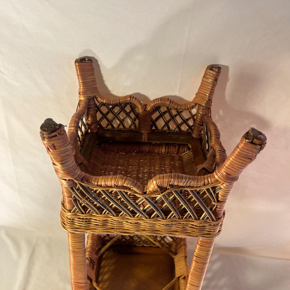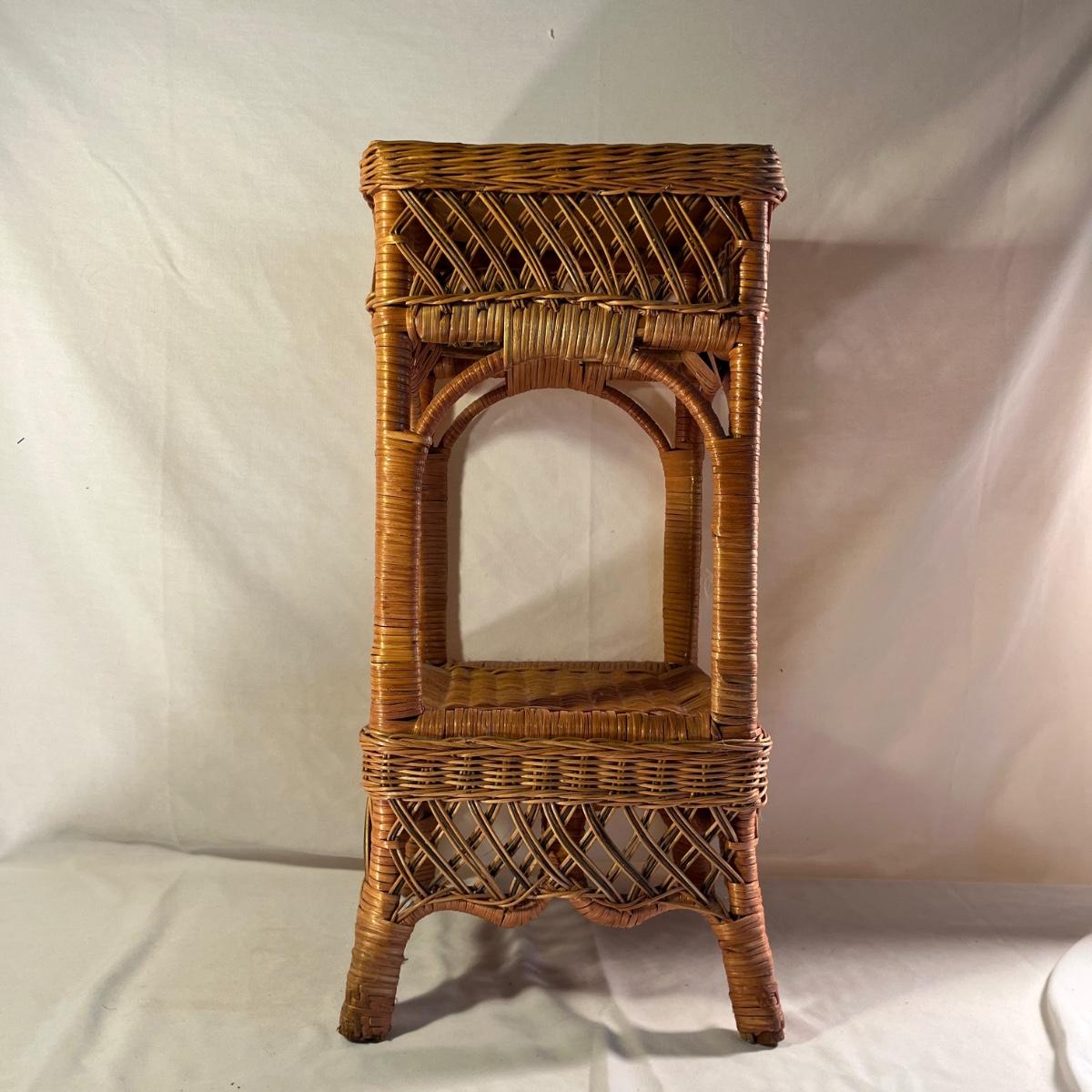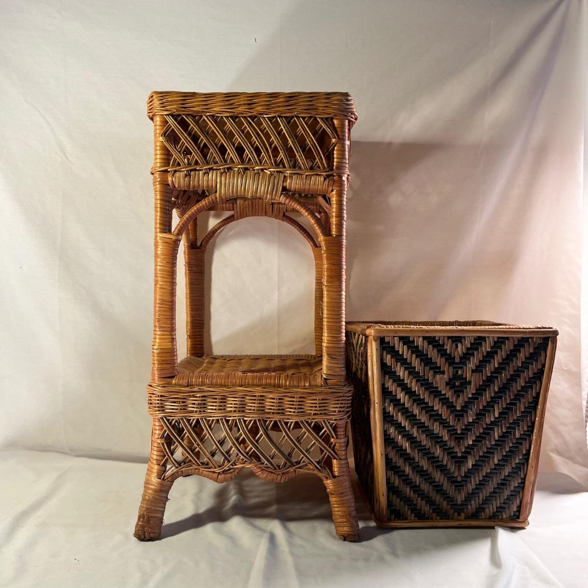 Lot includes a tall plant stand that measures 12” x 12” x 26”H and a wicker planter that measures 11.5” x 11.5” x 12”H.