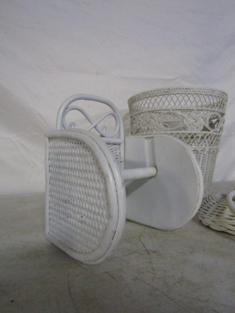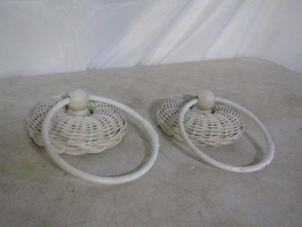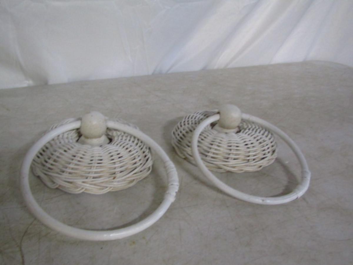 Wicker Powder Room Accessories- Wastebasket, Towel Holders, and Toilet Tissue Holder. Towel holders and toilet tissue holder are for wall mounting.