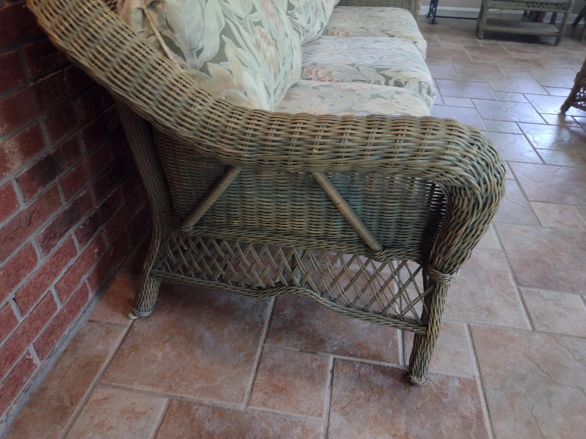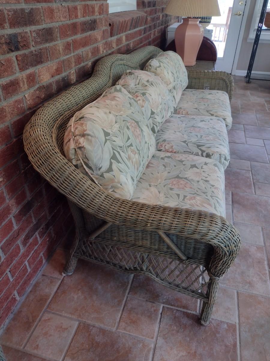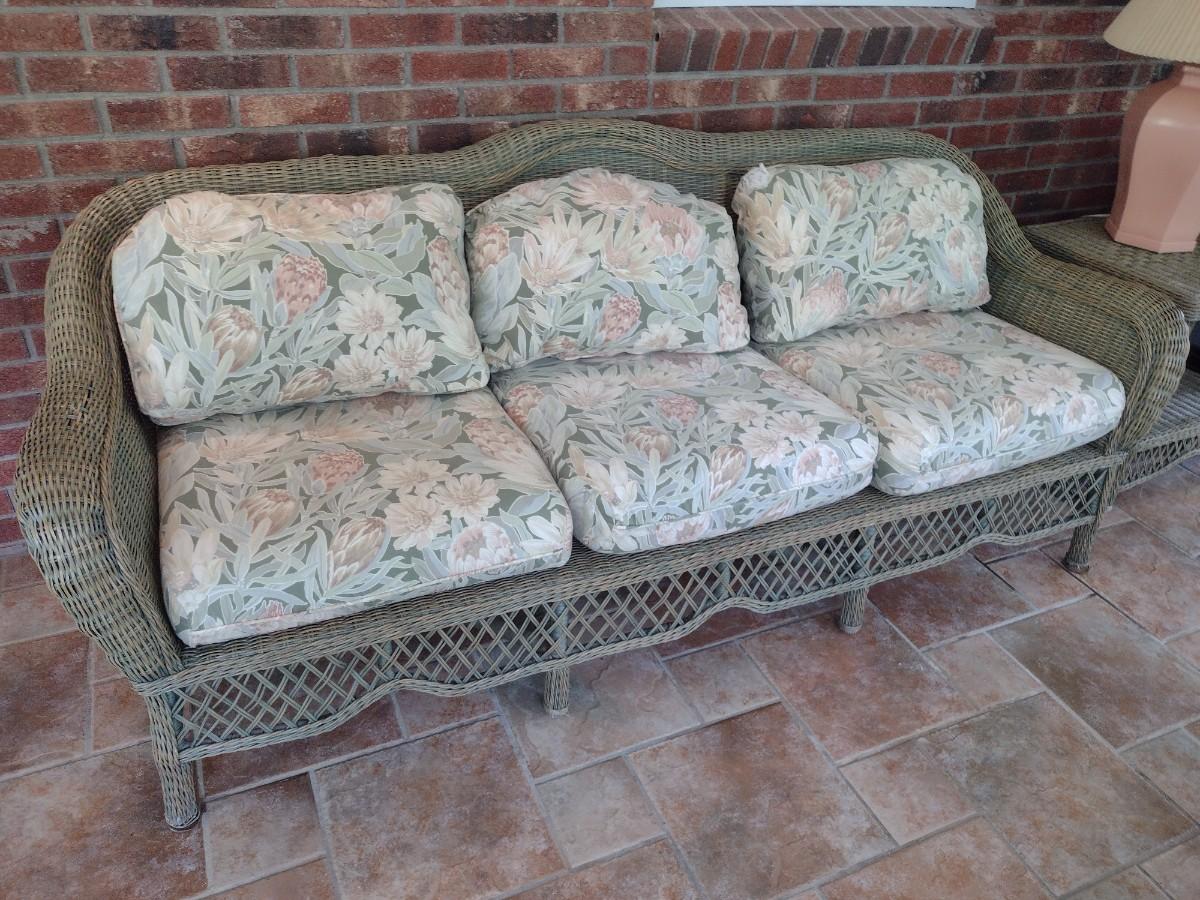Wicker Rattan Patio Three Cushion Couch. Cushions have wear and some damage as shown