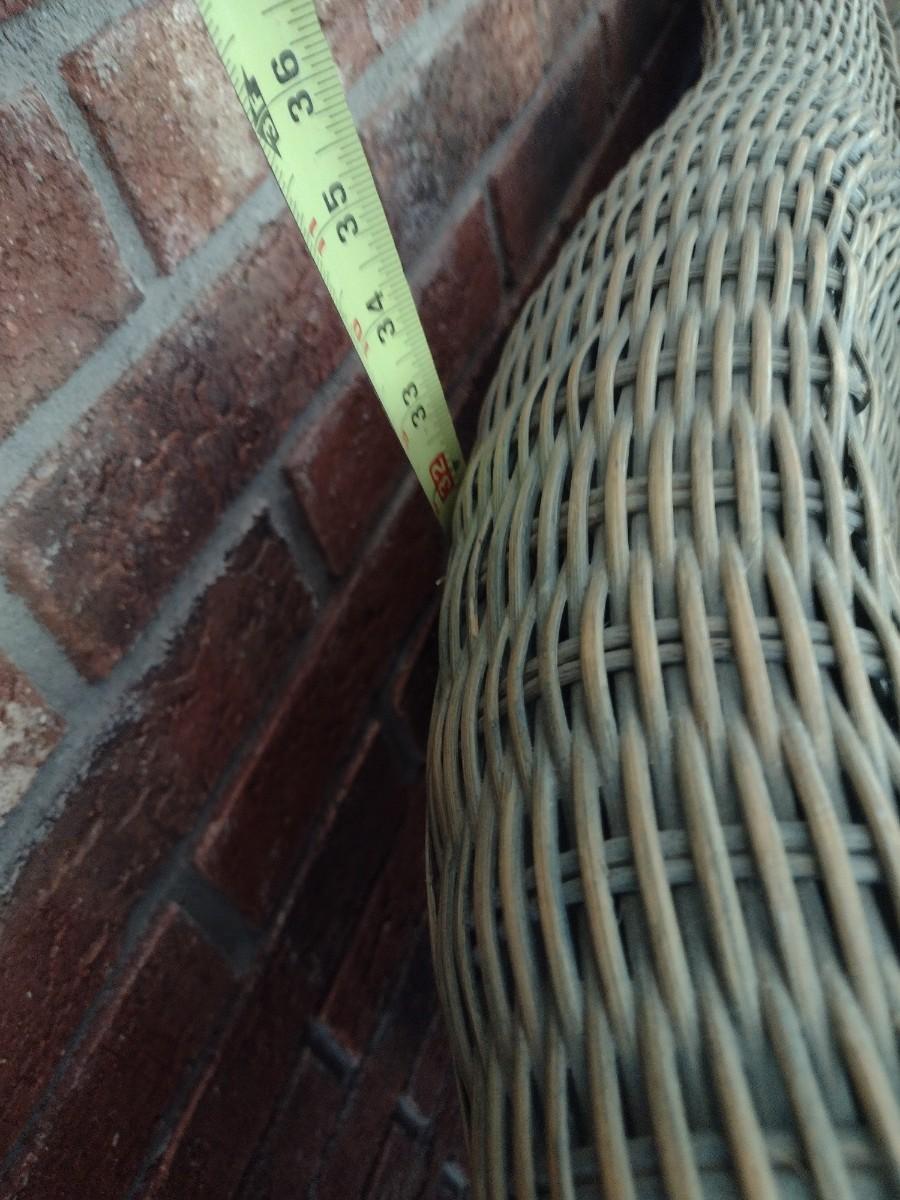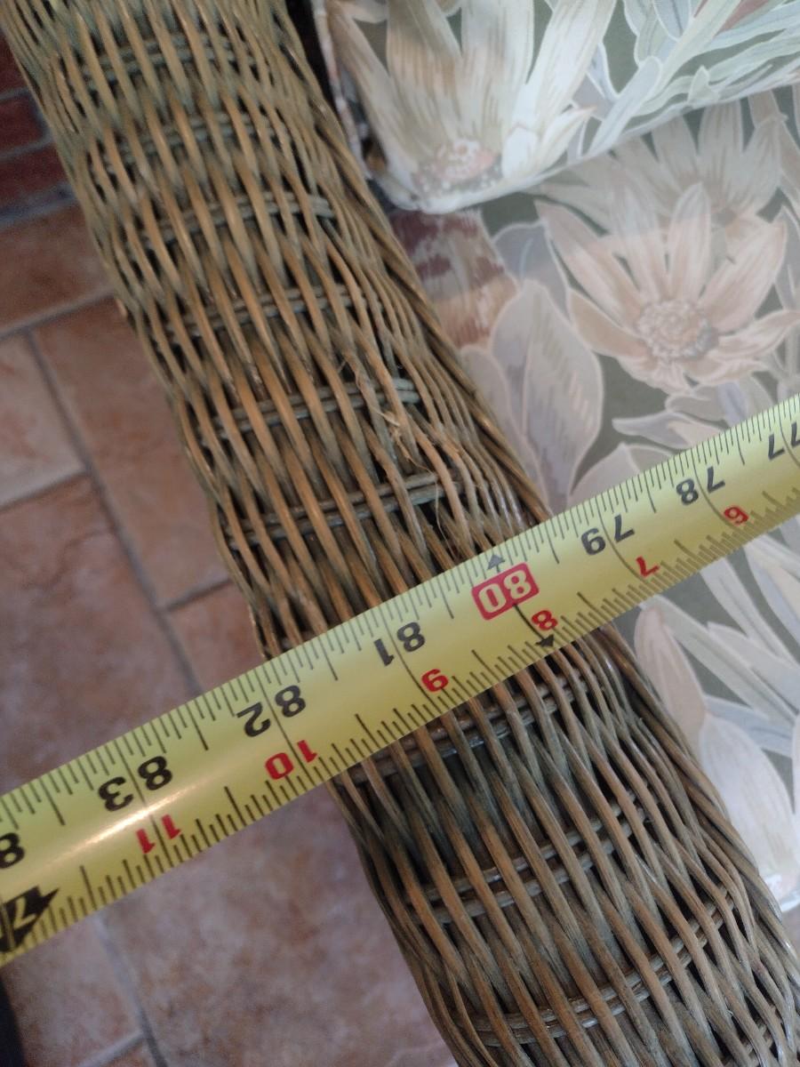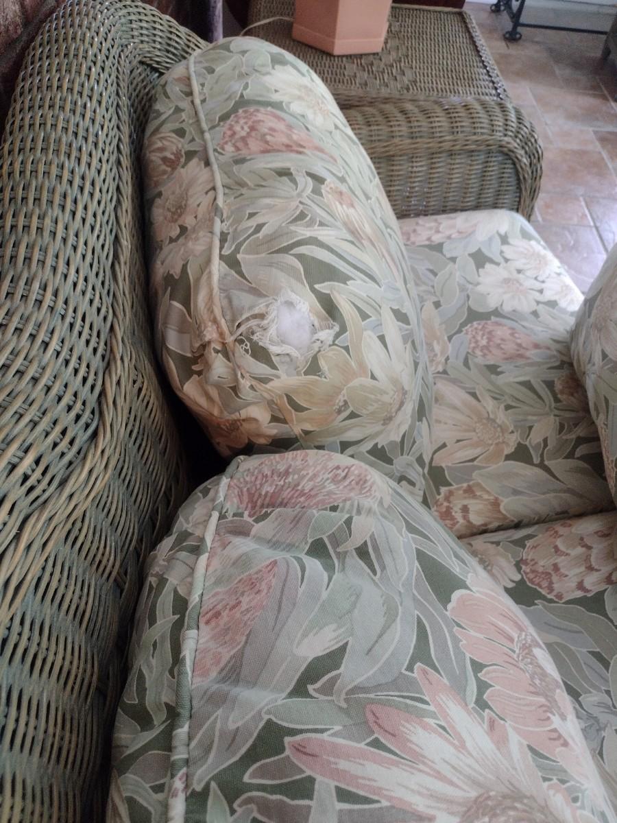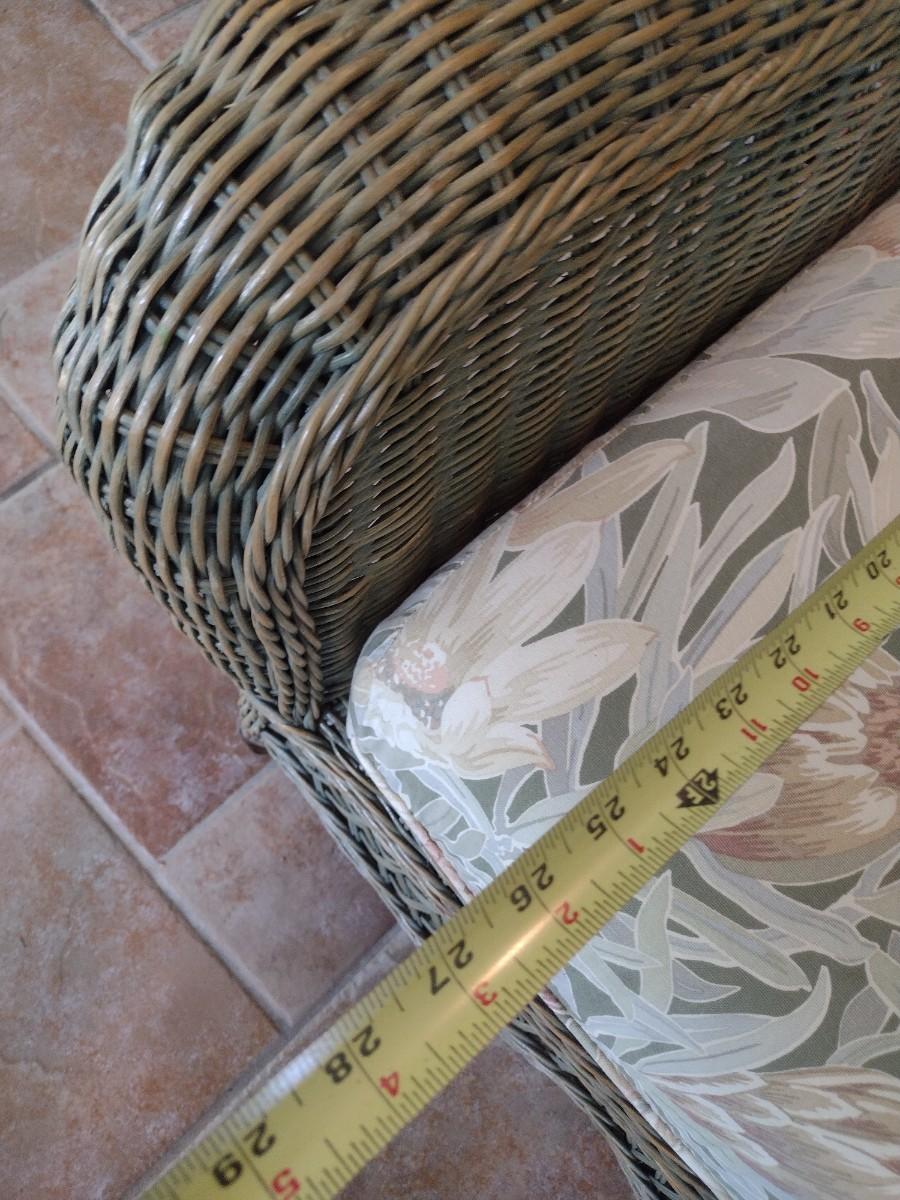 Wicker Rattan Patio Three Cushion Couch. Cushions have wear and some damage as shown
