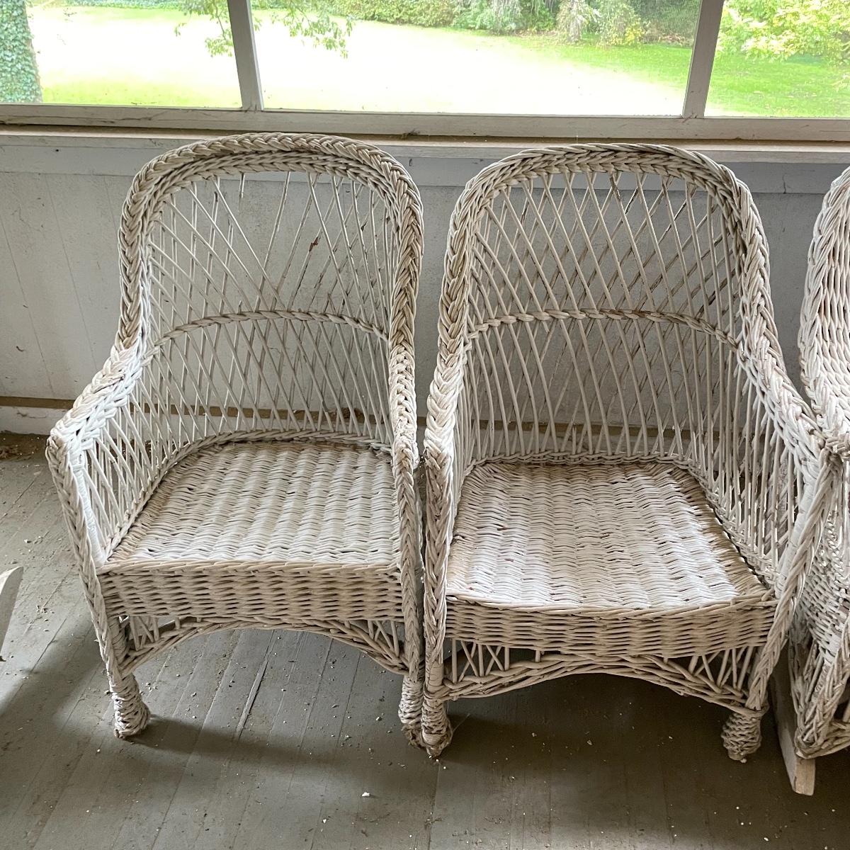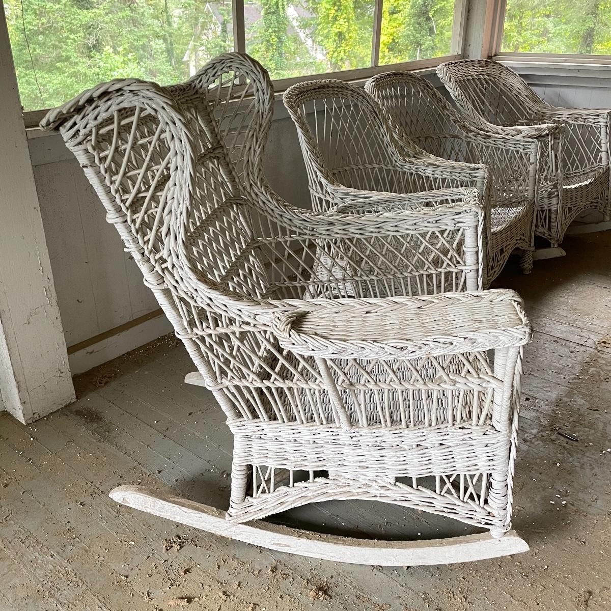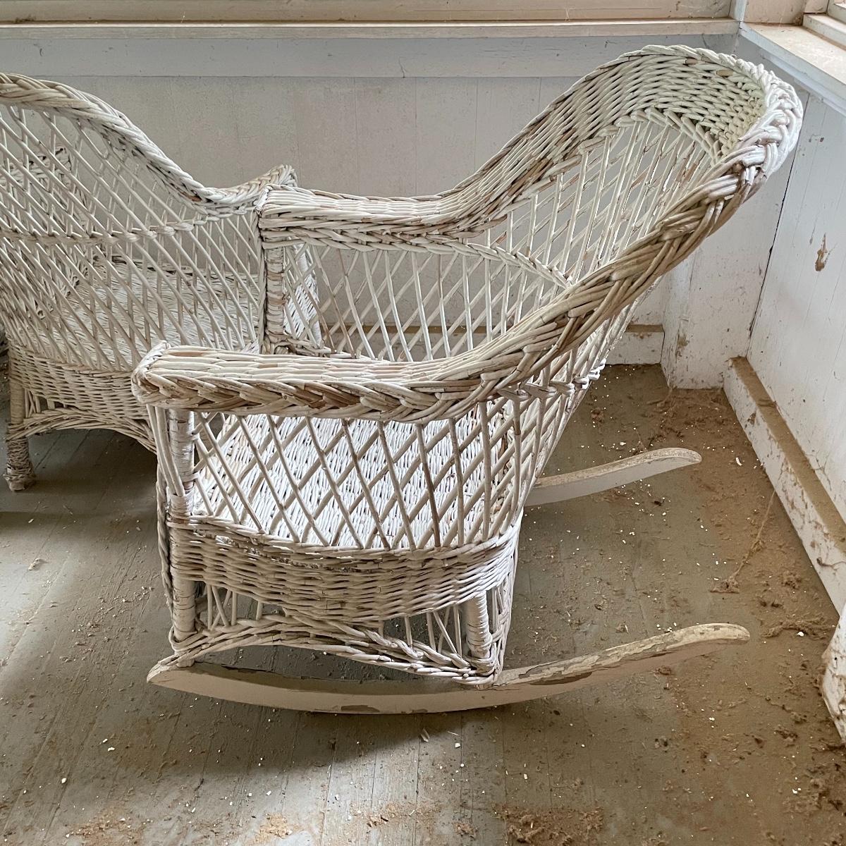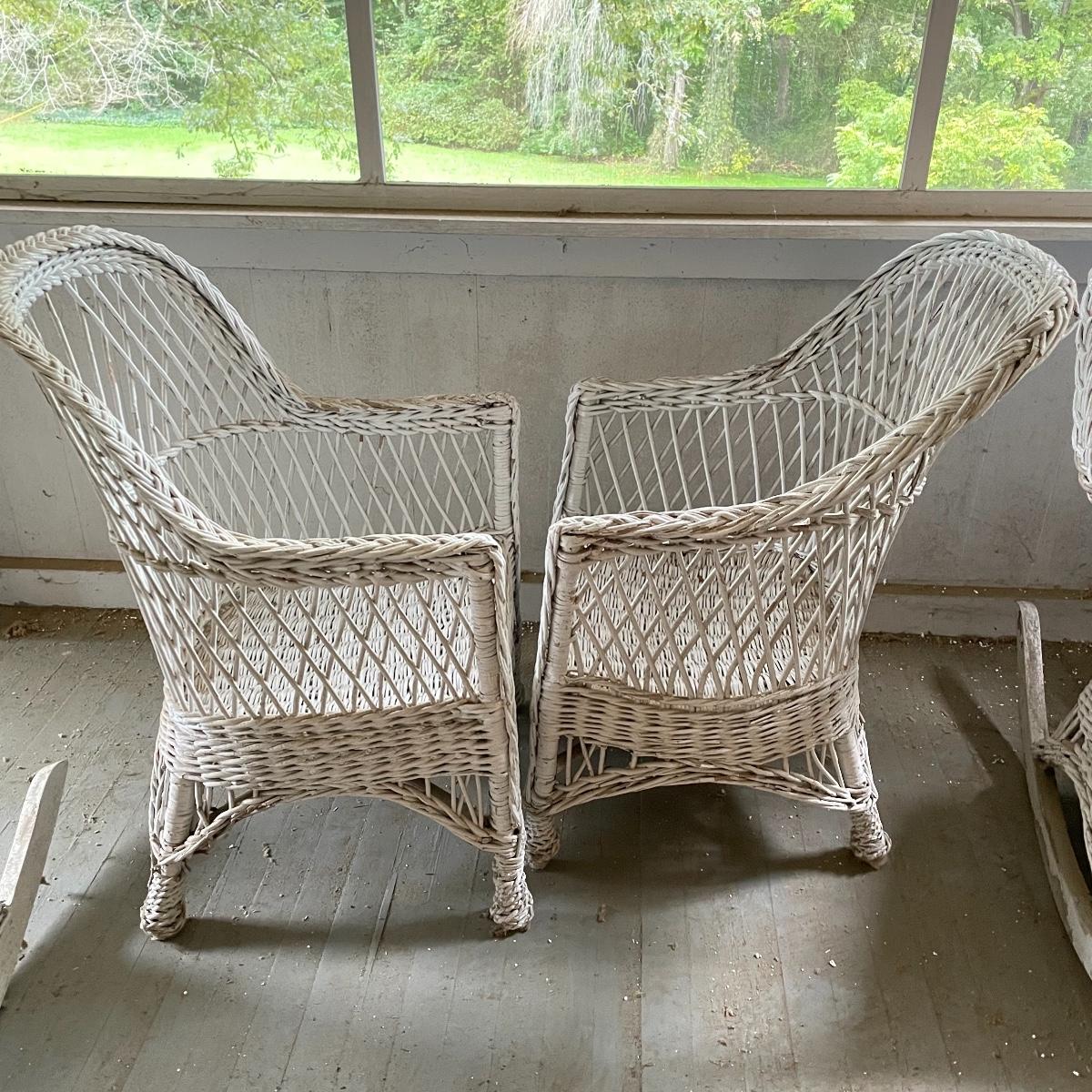 Two wicker rockers with one matching pair of smaller chairs. The largest has a wide arm on one side and a handy basket on the other. It measures 33” x 36” x 39”. The smaller rocker measures 25.5” x 34” x 33”. The two matching chairs measure 21.5” x 21” x 34” with a seat height at 14.5”. All four pieces have been stored on a screen porch and need cleaning and paint touch ups. Some broken wicker strands are noted in images. Local pick up only.