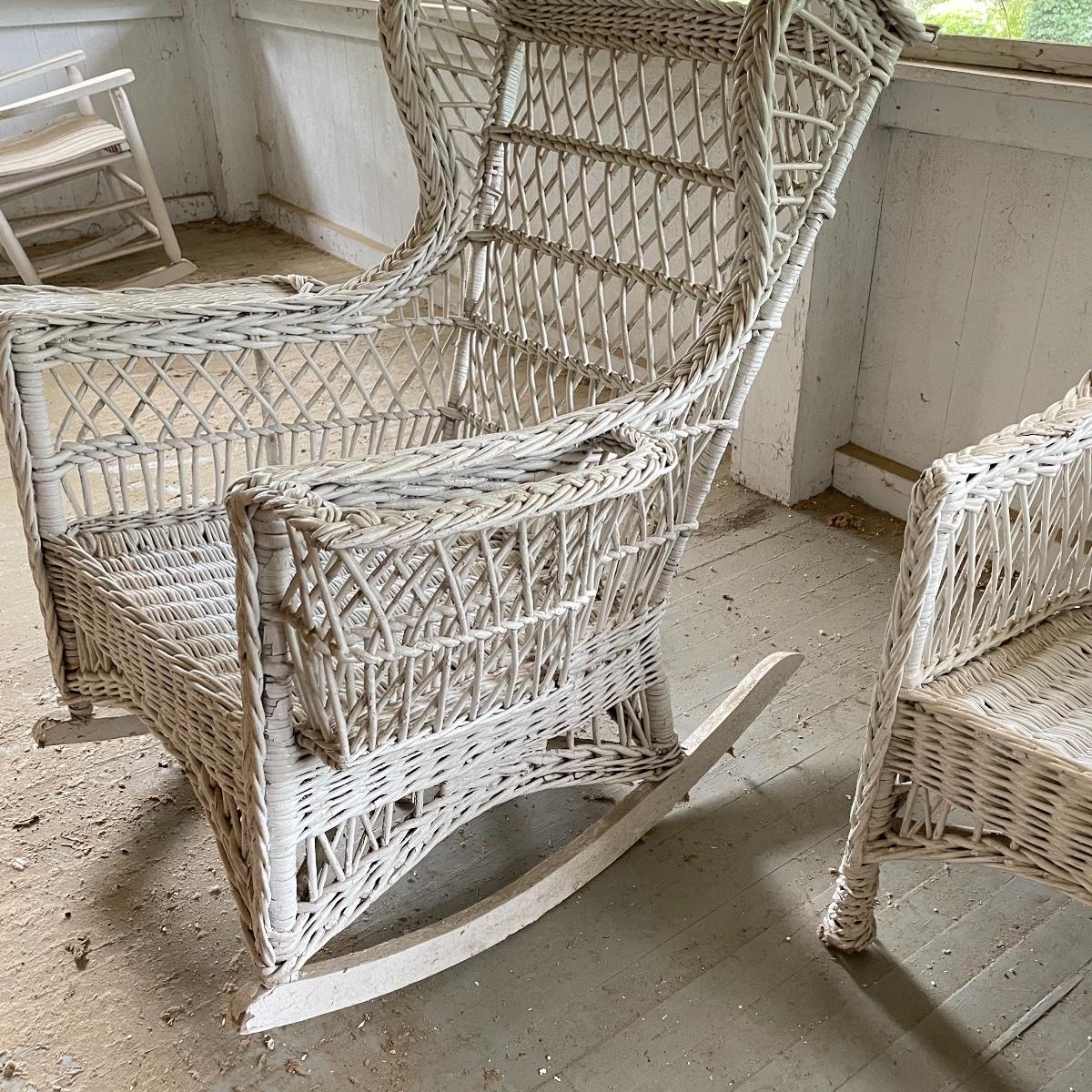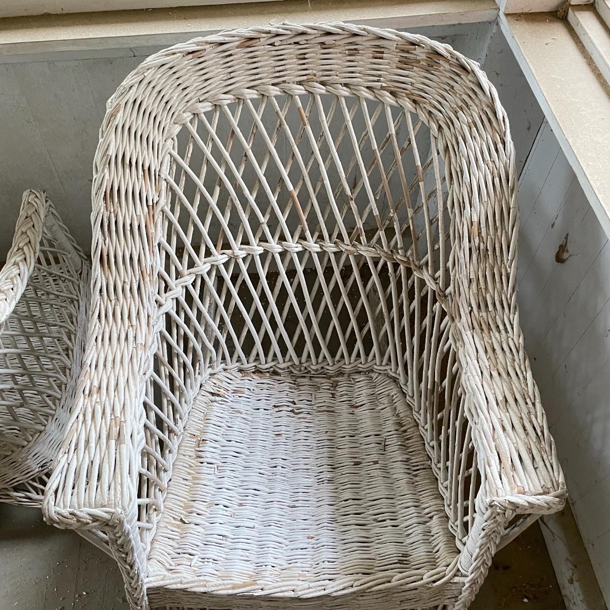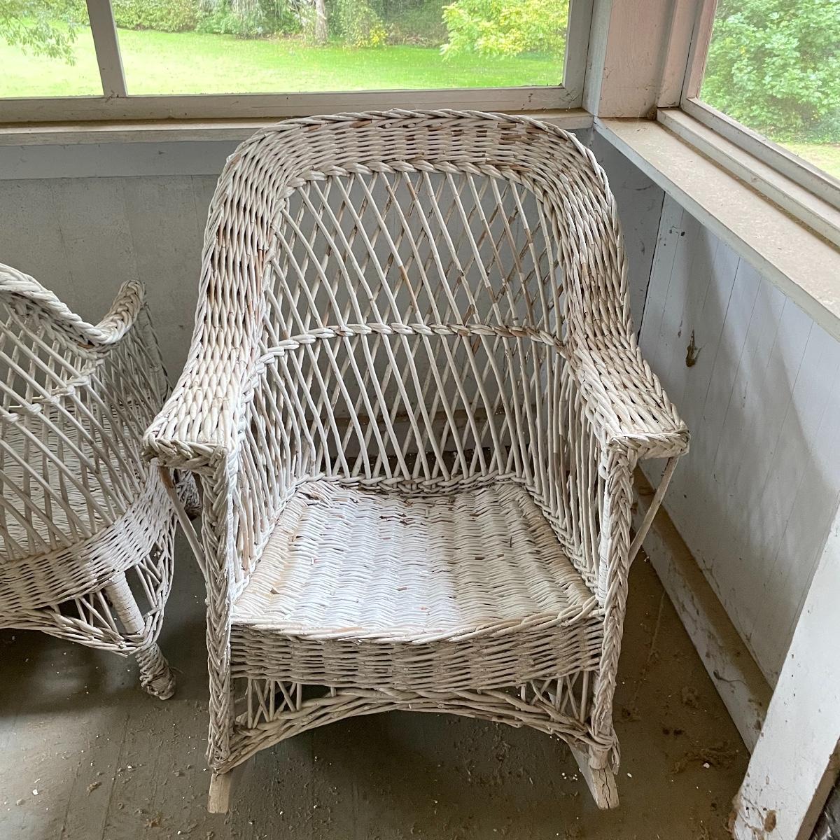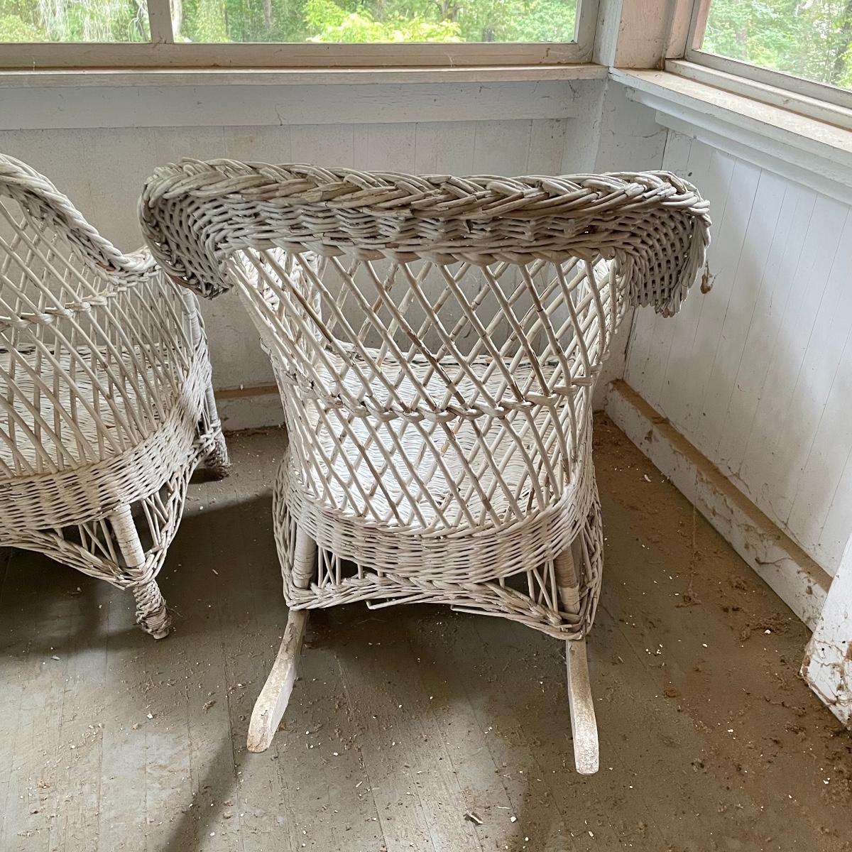 Two wicker rockers with one matching pair of smaller chairs. The largest has a wide arm on one side and a handy basket on the other. It measures 33” x 36” x 39”. The smaller rocker measures 25.5” x 34” x 33”. The two matching chairs measure 21.5” x 21” x 34” with a seat height at 14.5”. All four pieces have been stored on a screen porch and need cleaning and paint touch ups. Some broken wicker strands are noted in images. Local pick up only.