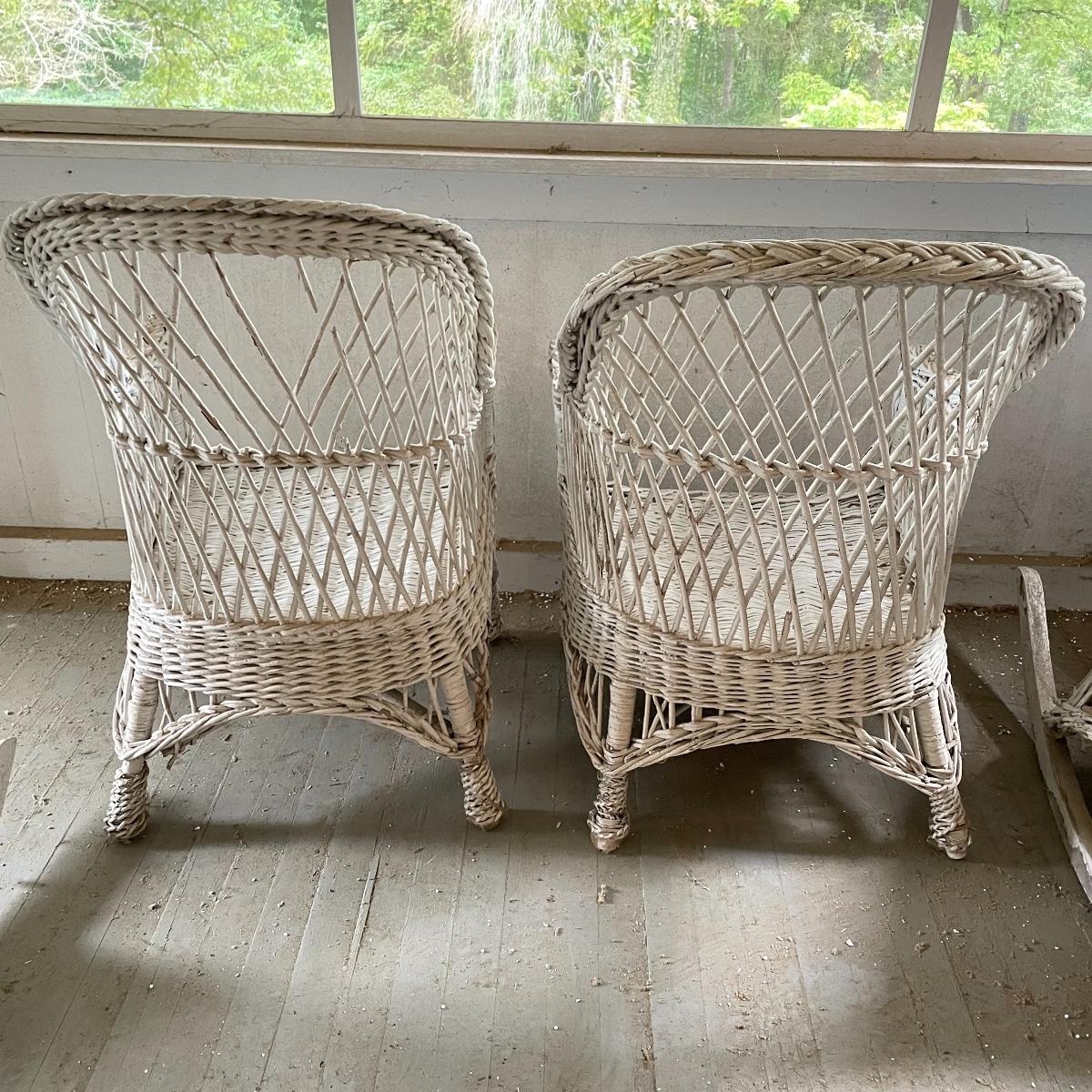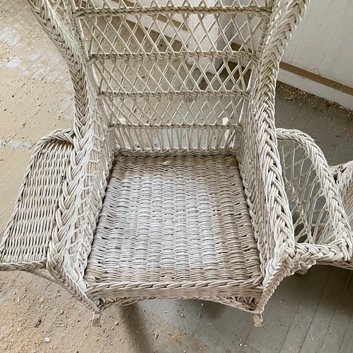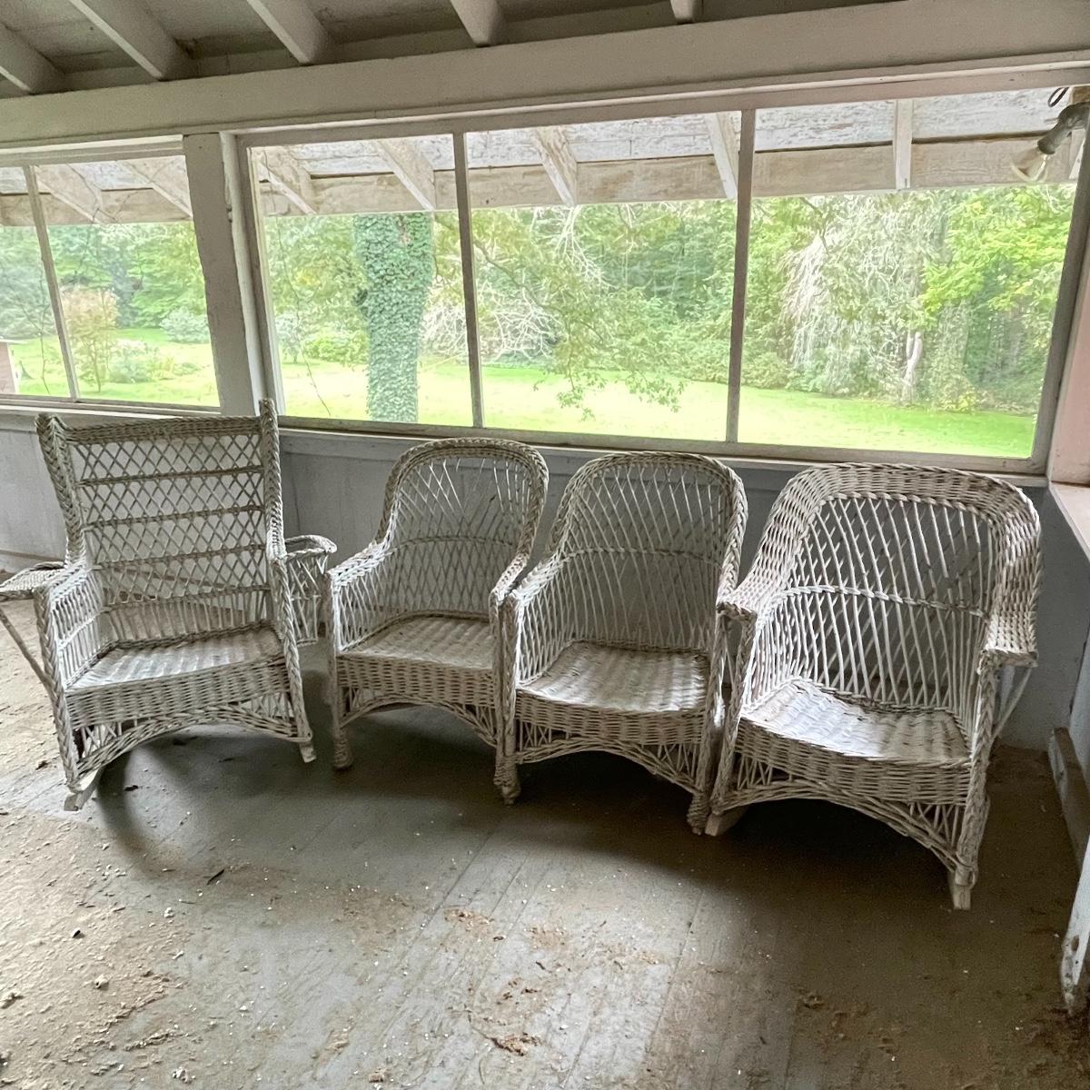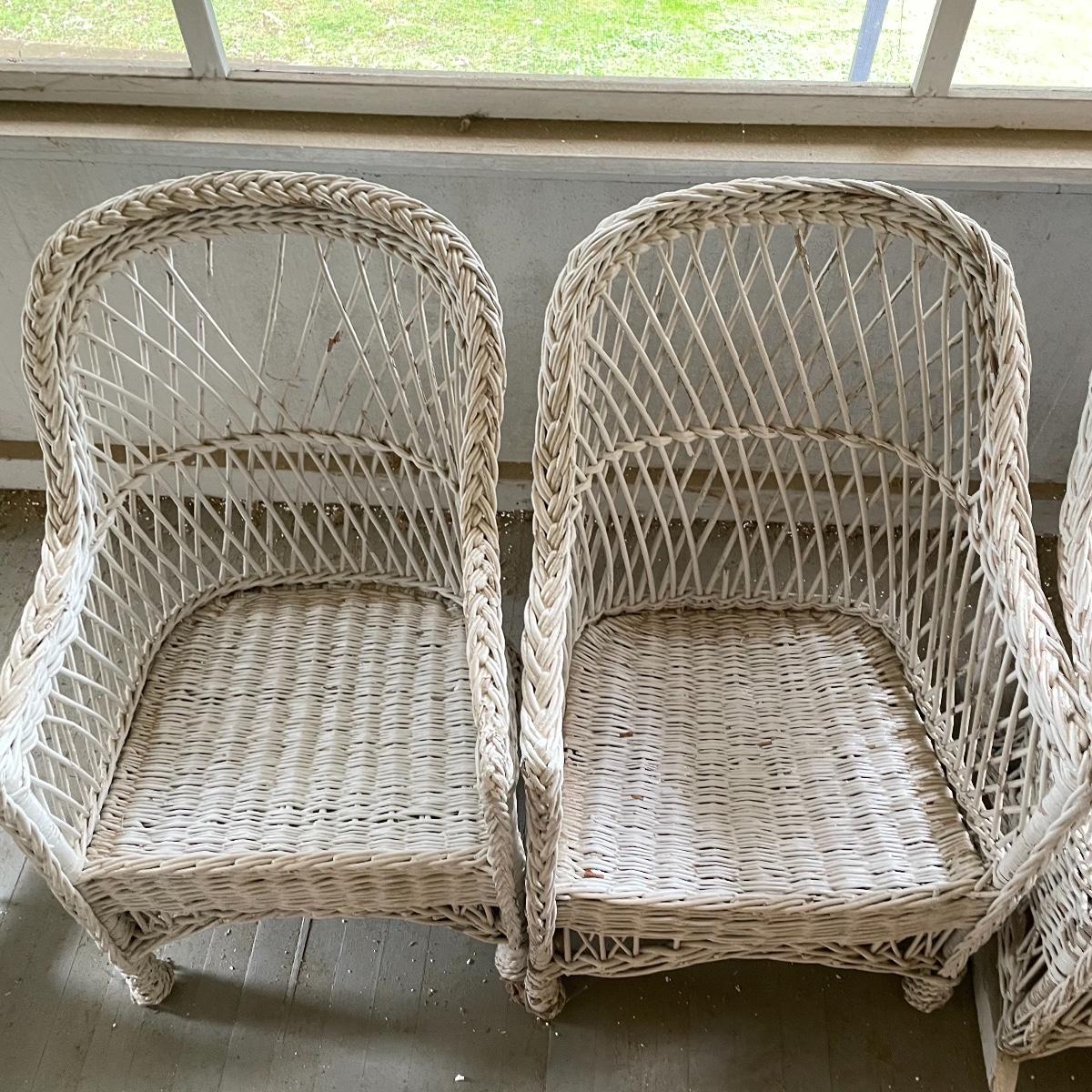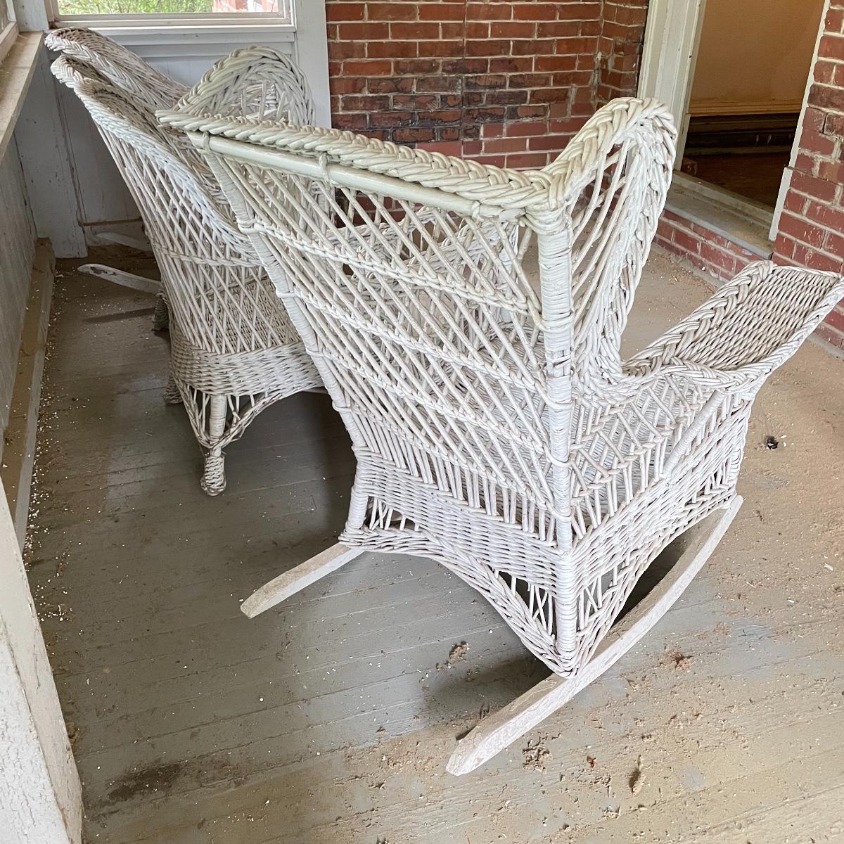 Two wicker rockers with one matching pair of smaller chairs. The largest has a wide arm on one side and a handy basket on the other. It measures 33” x 36” x 39”. The smaller rocker measures 25.5” x 34” x 33”. The two matching chairs measure 21.5” x 21” x 34” with a seat height at 14.5”. All four pieces have been stored on a screen porch and need cleaning and paint touch ups. Some broken wicker strands are noted in images. Local pick up only.