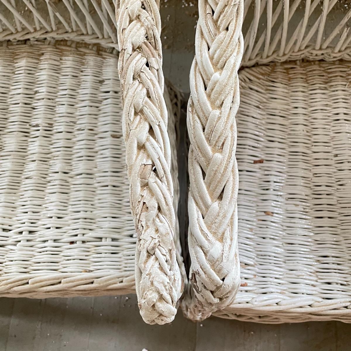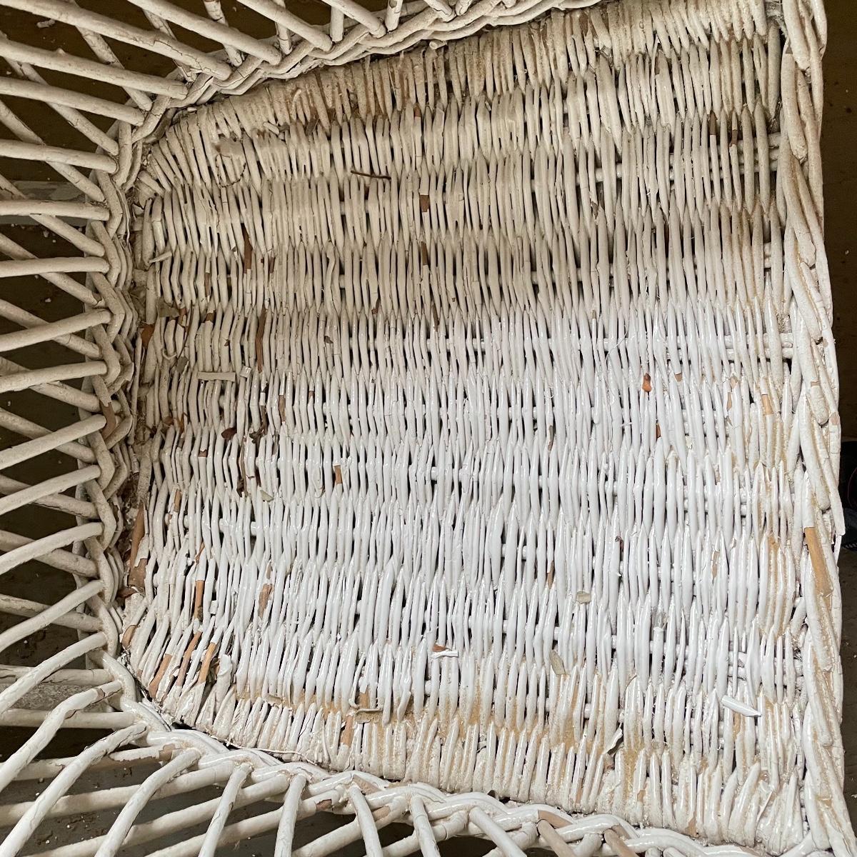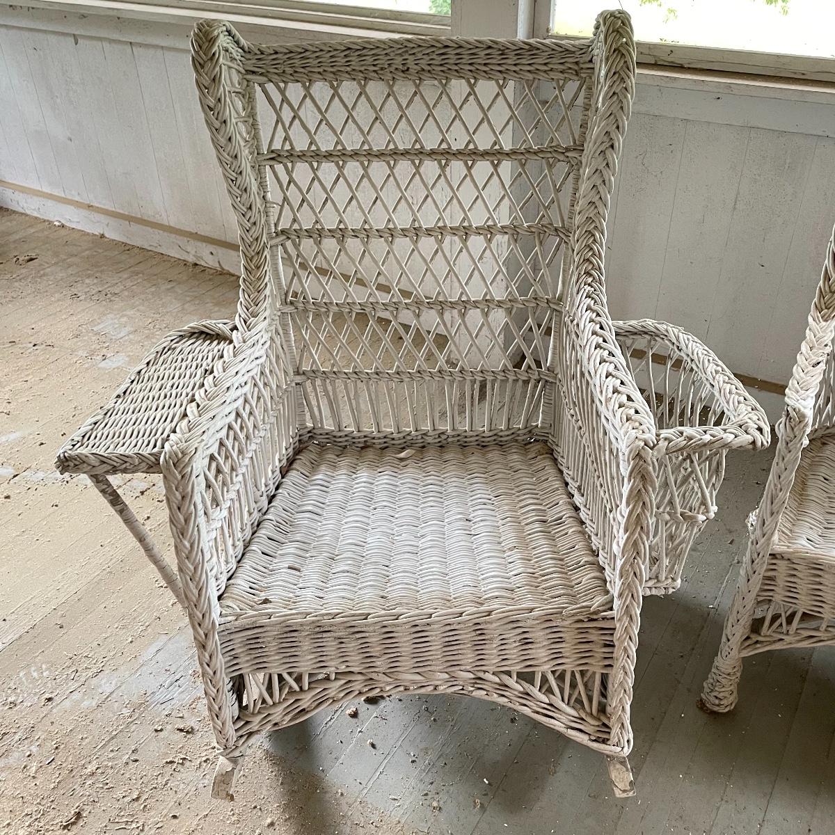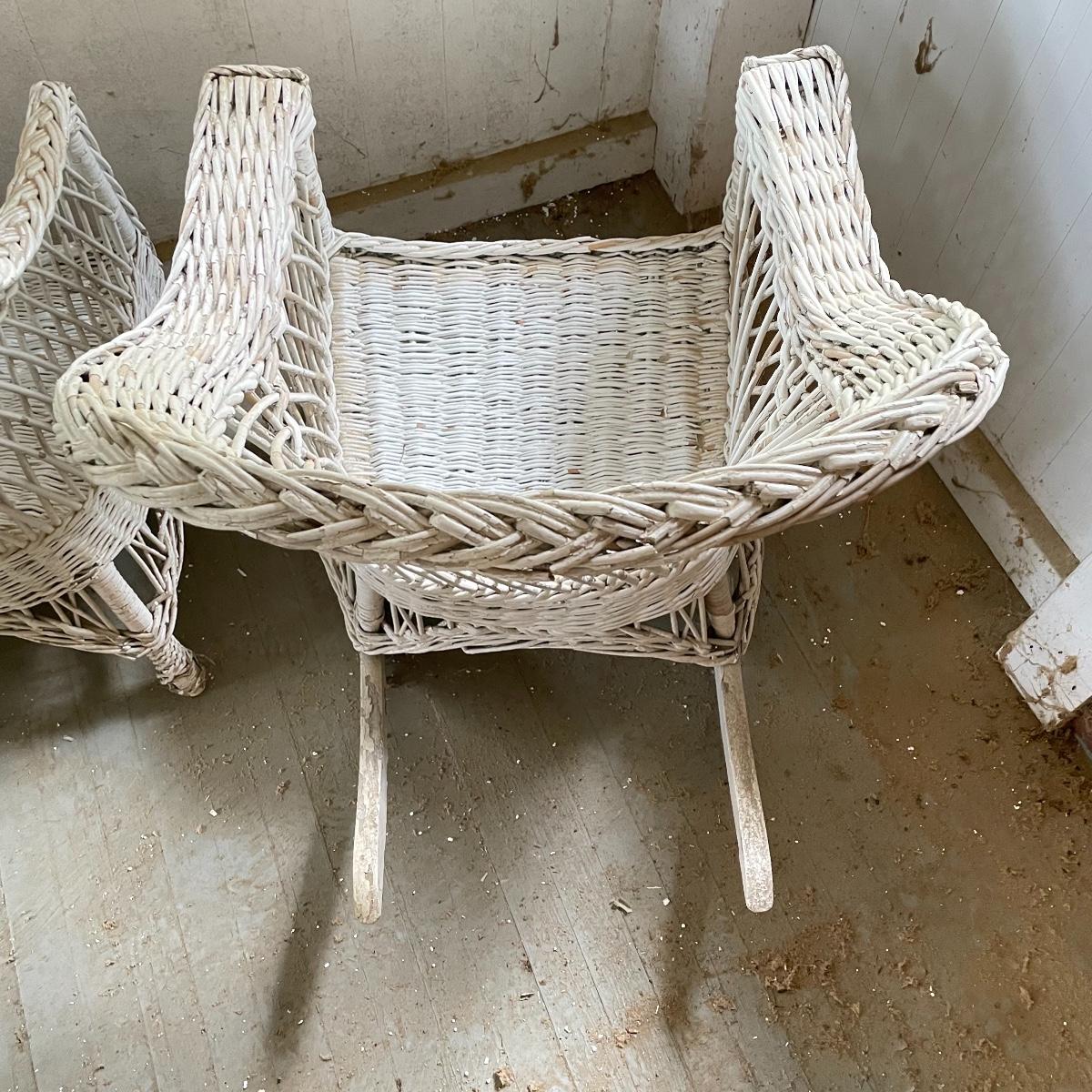 Two wicker rockers with one matching pair of smaller chairs. The largest has a wide arm on one side and a handy basket on the other. It measures 33” x 36” x 39”. The smaller rocker measures 25.5” x 34” x 33”. The two matching chairs measure 21.5” x 21” x 34” with a seat height at 14.5”. All four pieces have been stored on a screen porch and need cleaning and paint touch ups. Some broken wicker strands are noted in images. Local pick up only.