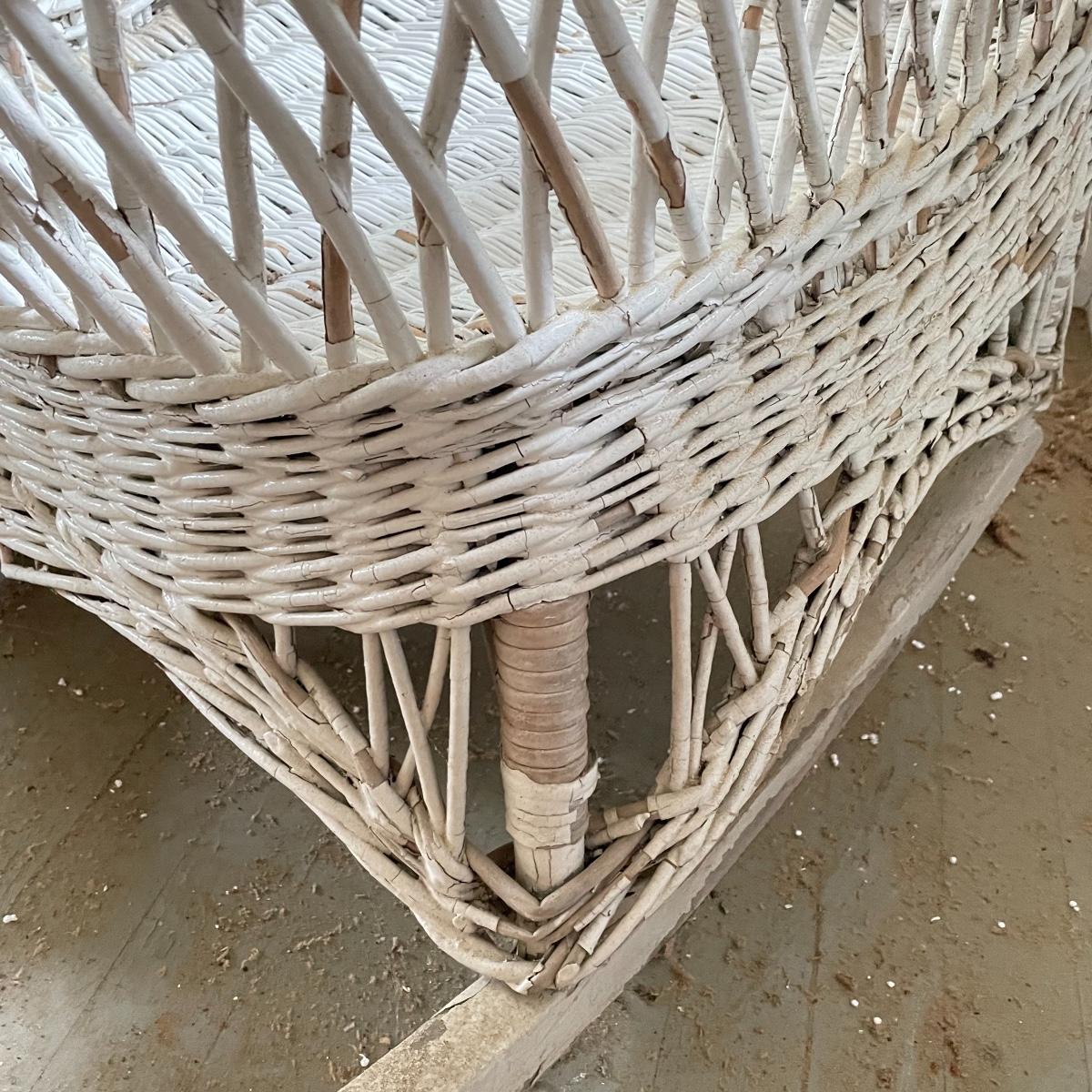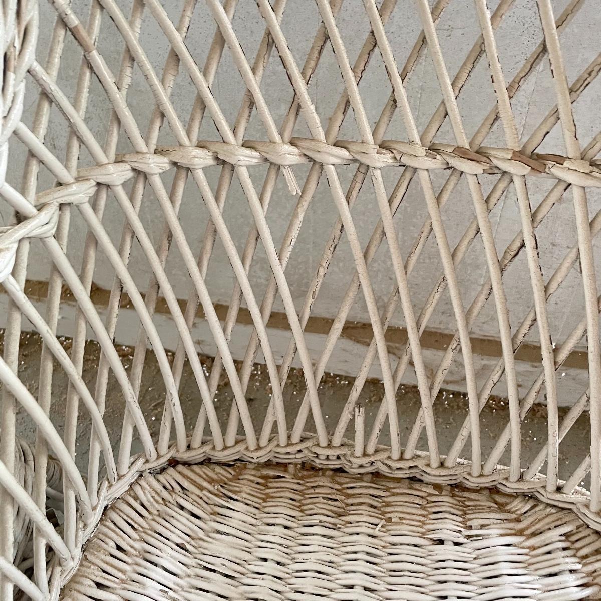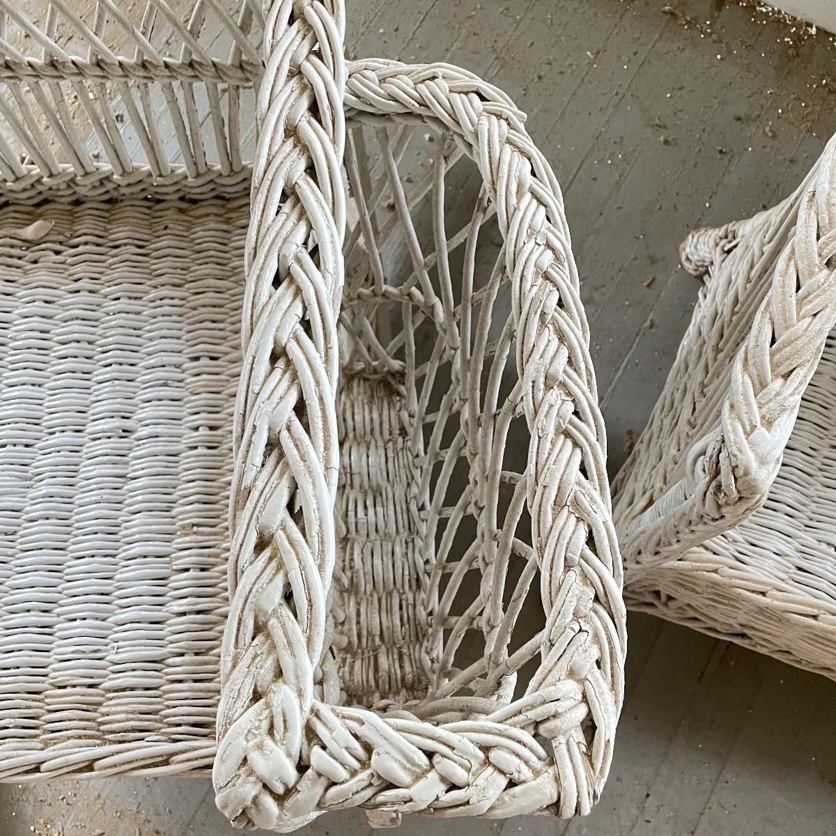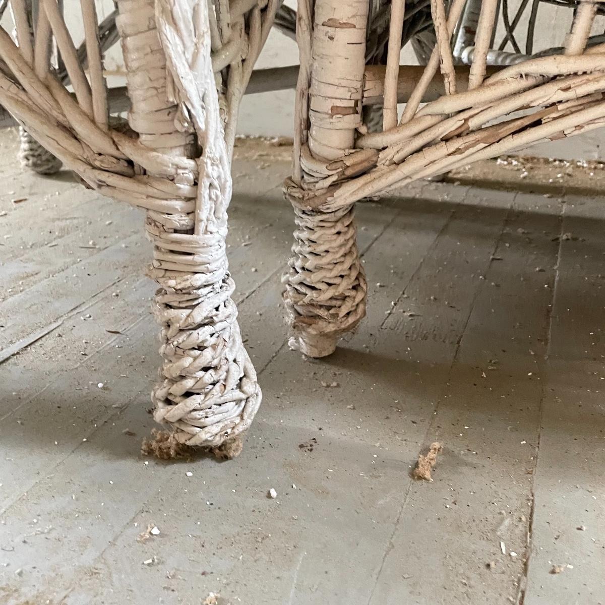 Two wicker rockers with one matching pair of smaller chairs. The largest has a wide arm on one side and a handy basket on the other. It measures 33” x 36” x 39”. The smaller rocker measures 25.5” x 34” x 33”. The two matching chairs measure 21.5” x 21” x 34” with a seat height at 14.5”. All four pieces have been stored on a screen porch and need cleaning and paint touch ups. Some broken wicker strands are noted in images. Local pick up only.