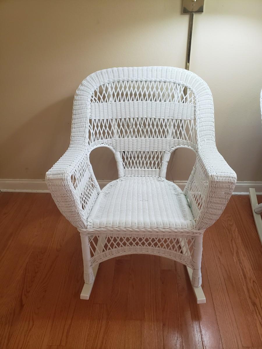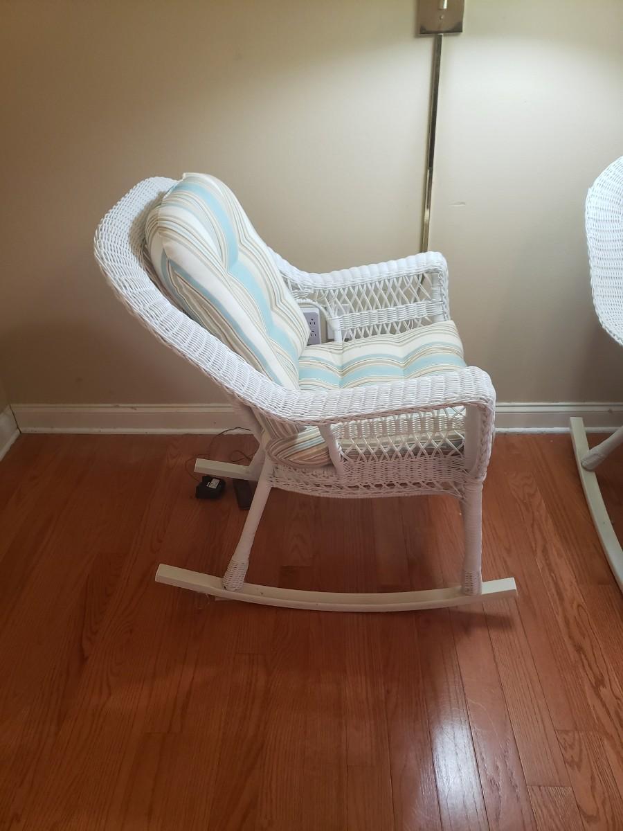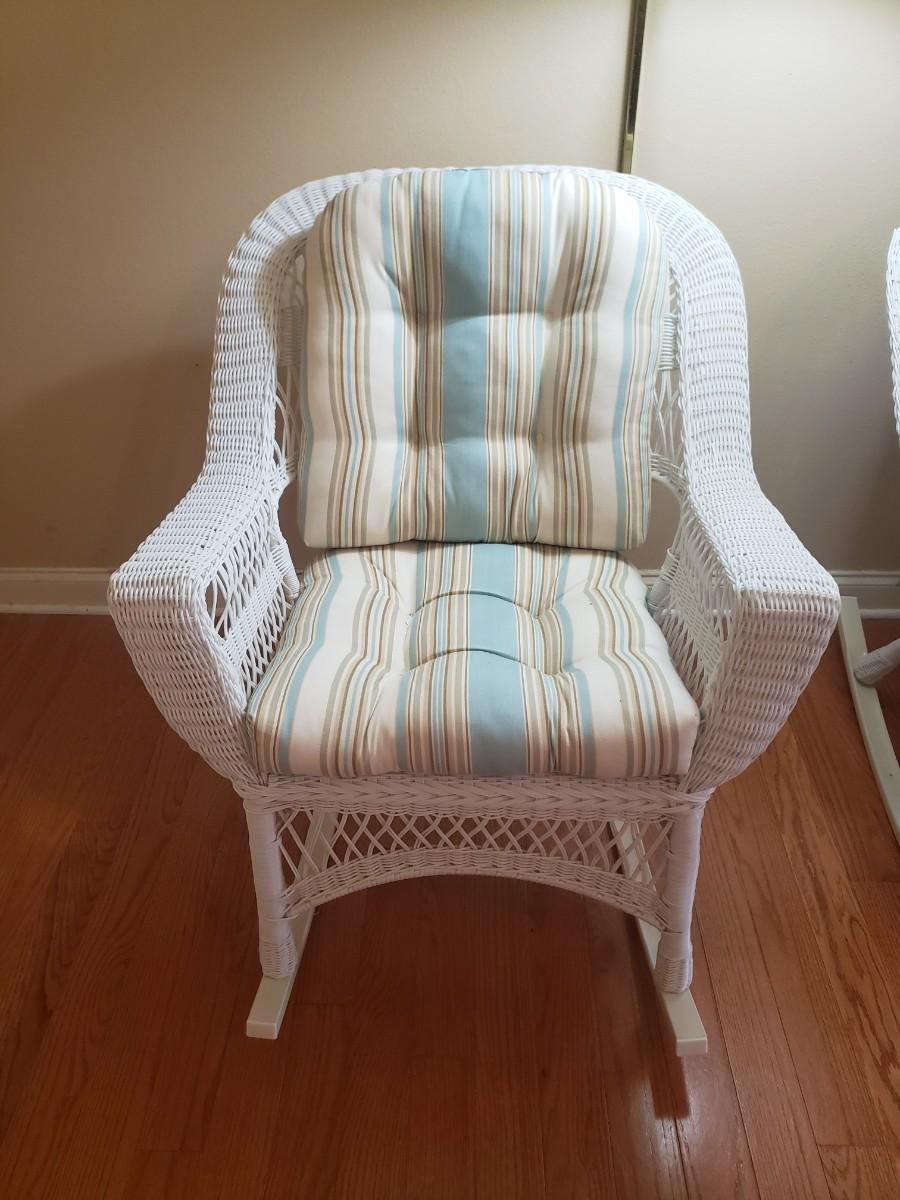 Lot 2 of 2 Wicker rocking chair with cushions. 29" W x 36"H x 35" D.