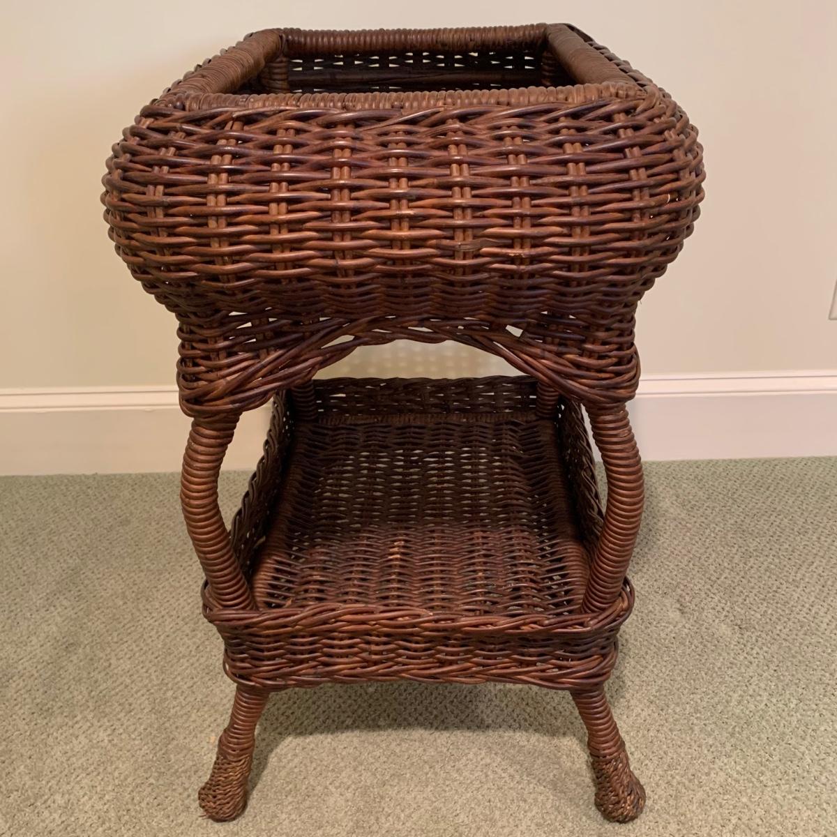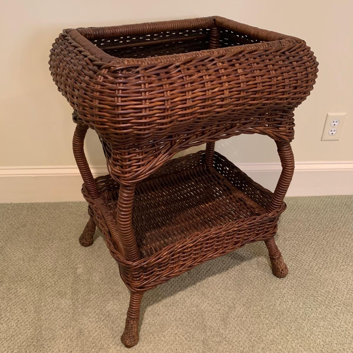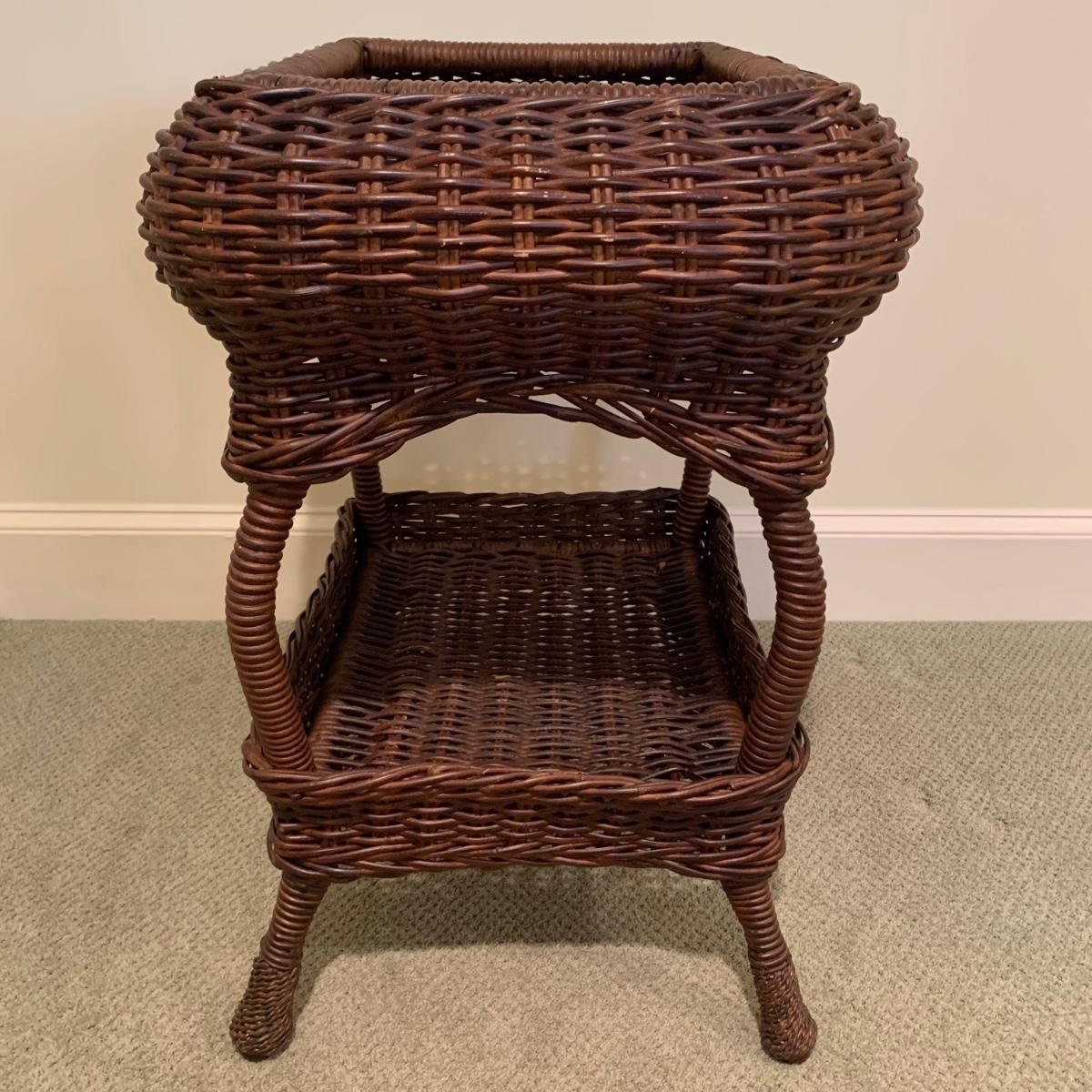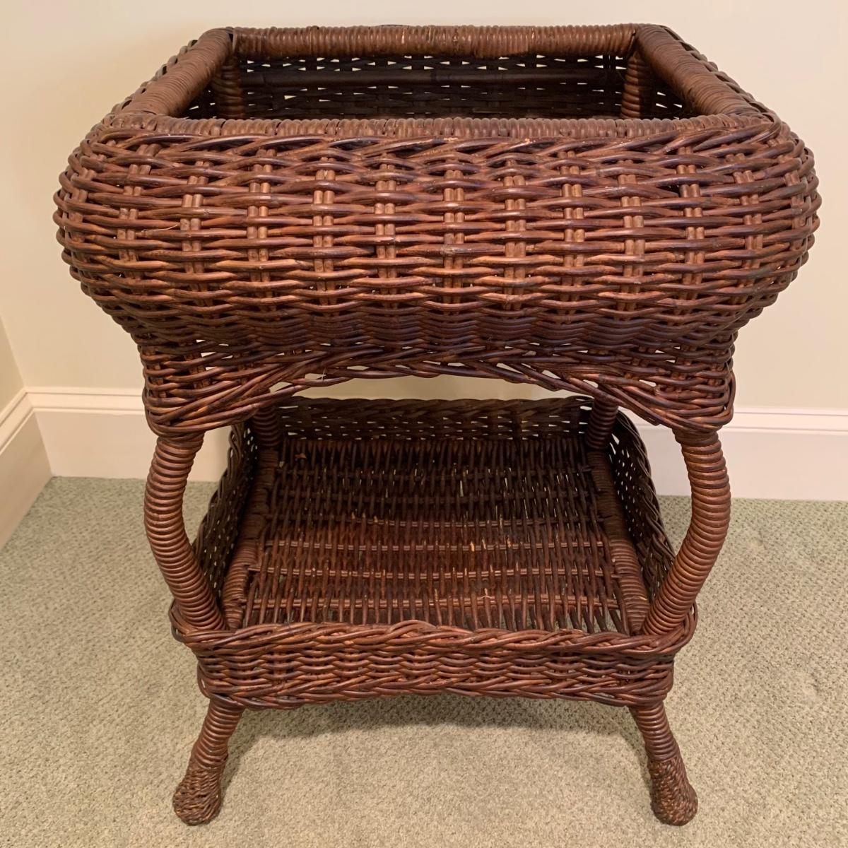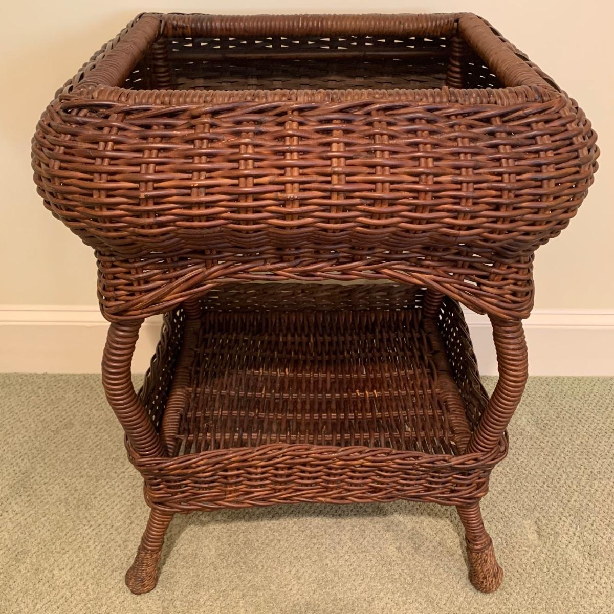 Wicker style sewing table. Table is dark brown wicker and measures, 27” x 22” x 29.5”H. Please see photos for more details. Local pickup only.