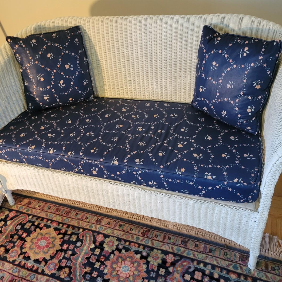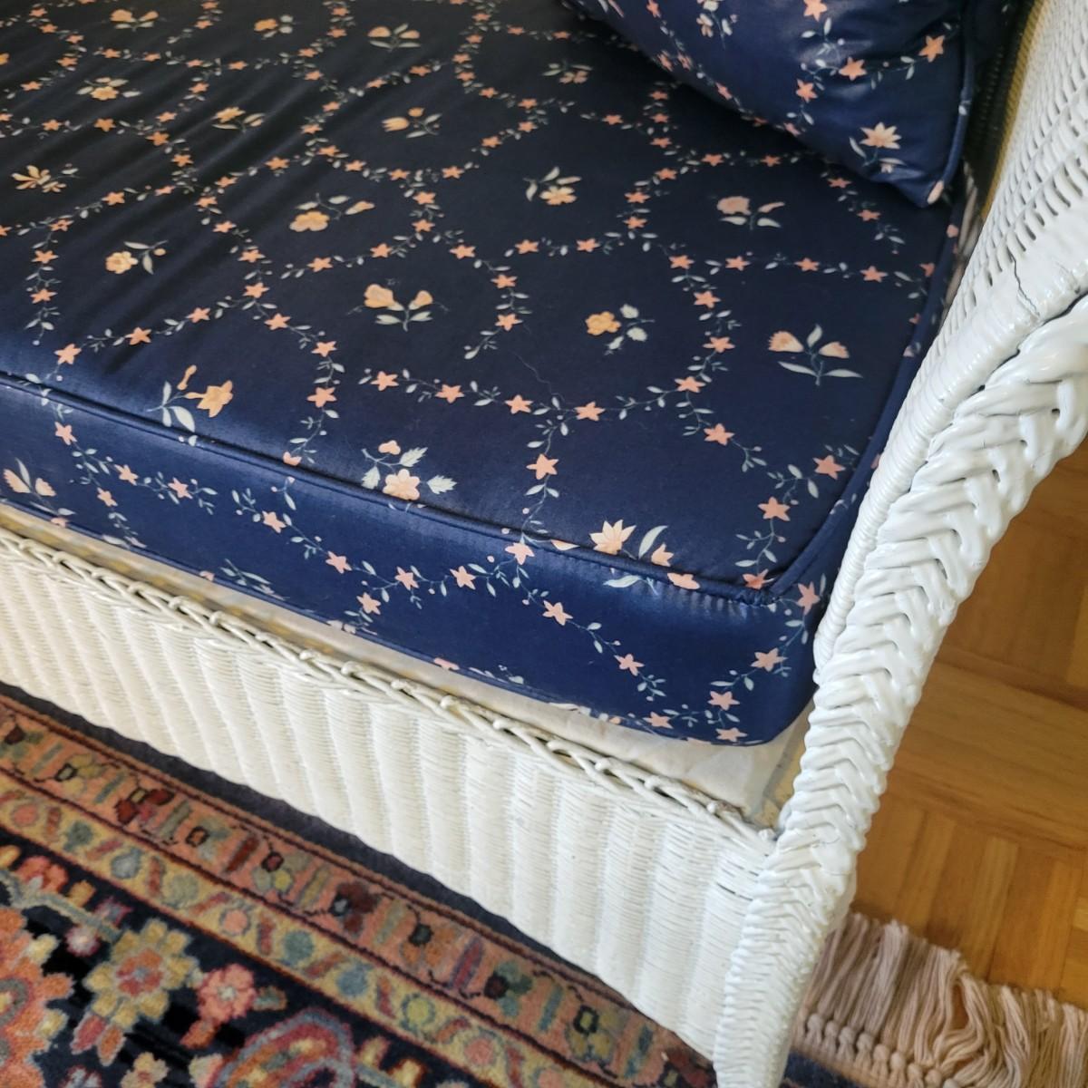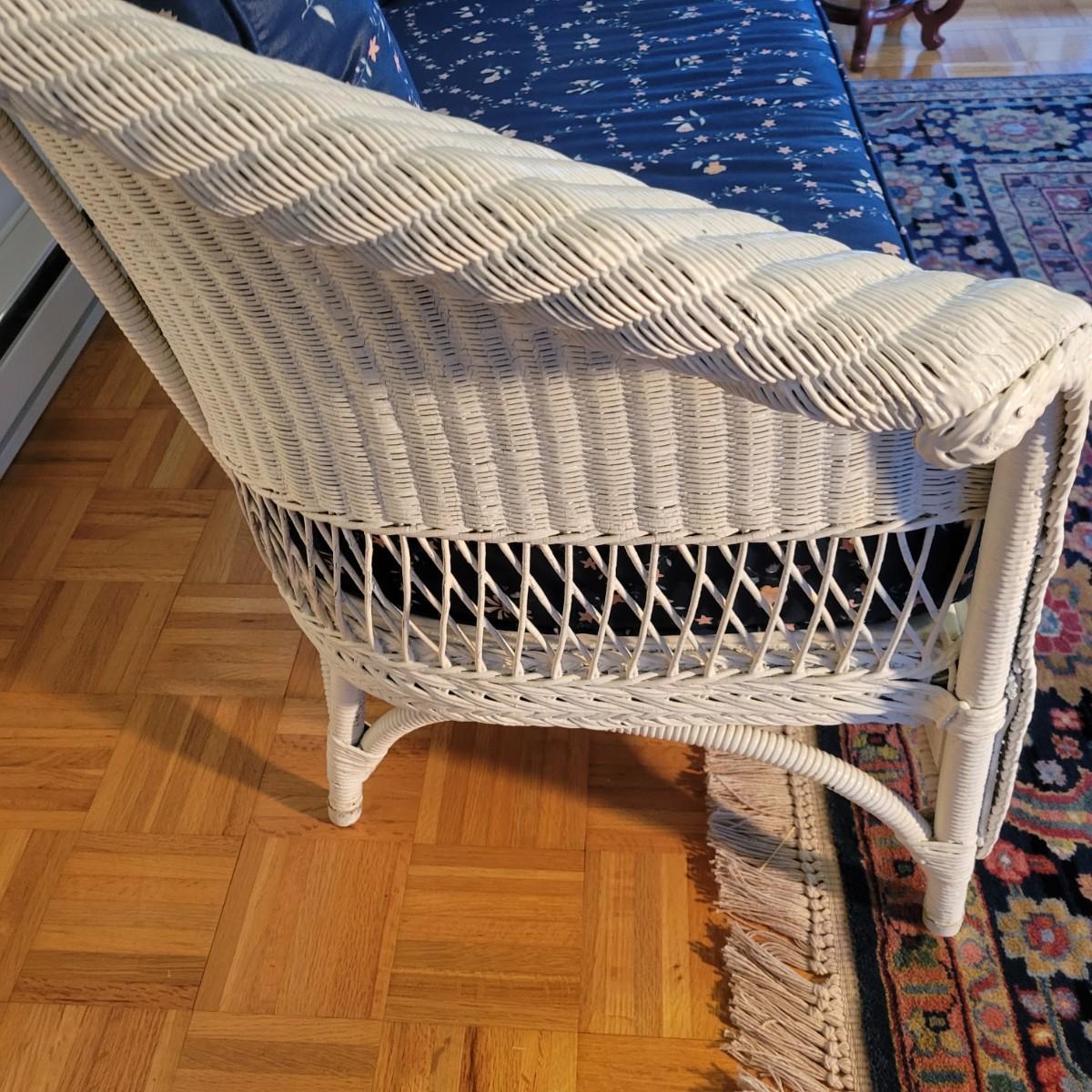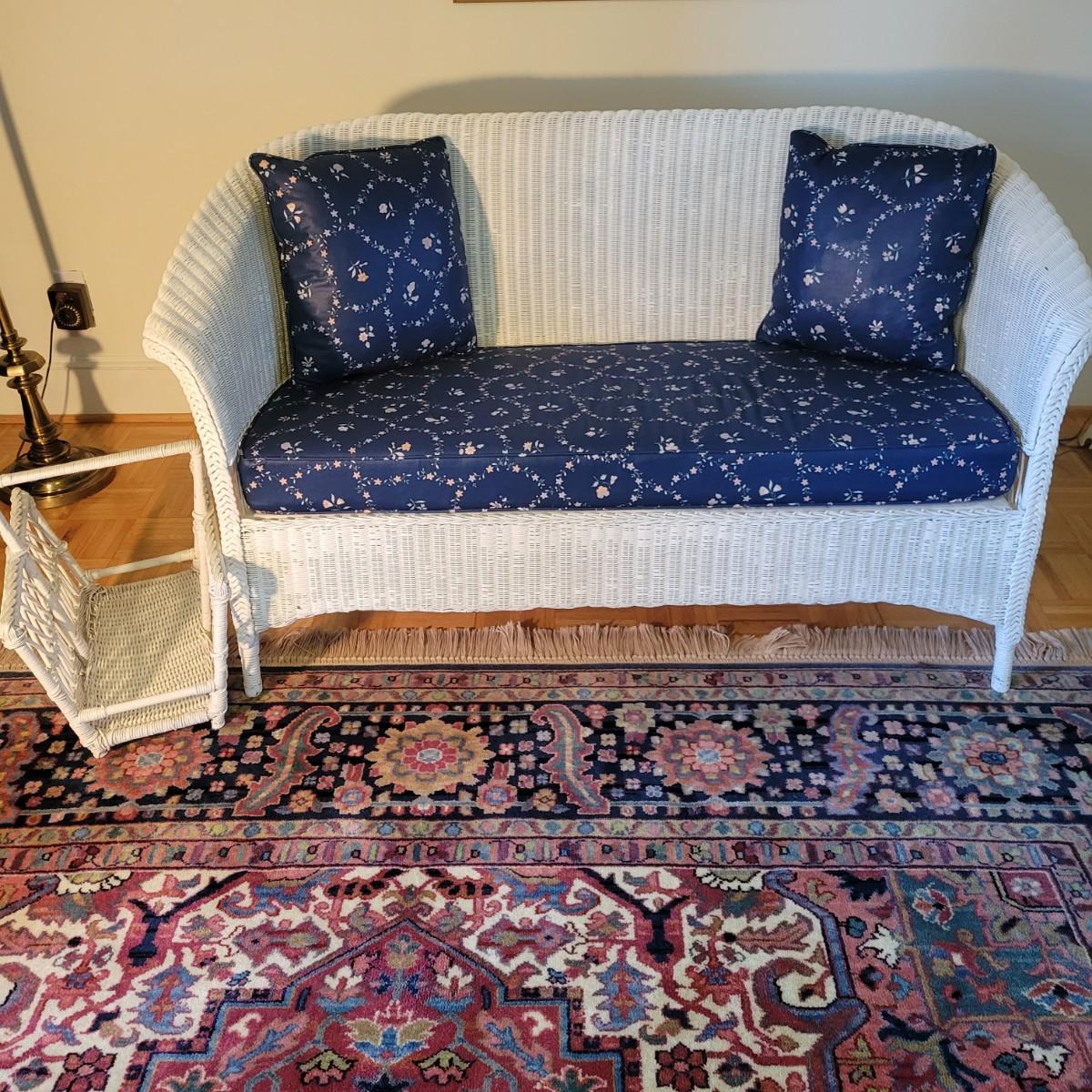 A wicker sofa and magazine rack in good condition with some minor blemishes. The sofa includes two accent pillows and a seat cushion that are dark blue with a floral pattern. Sofa measures approximately 58" x 24" x 32" with a seat height of 18". Magazine rack is also in good condition and matches sofa. A set of wicker rocking chairs with matching cushions is also found in this sale (Pair of Wicker Rocking Chairs and Cushions). Bid on both lots to win the matching set! Winning bidder should bring assistance as this item is bulky and needs to go up a flight of stairs. Local pickup only