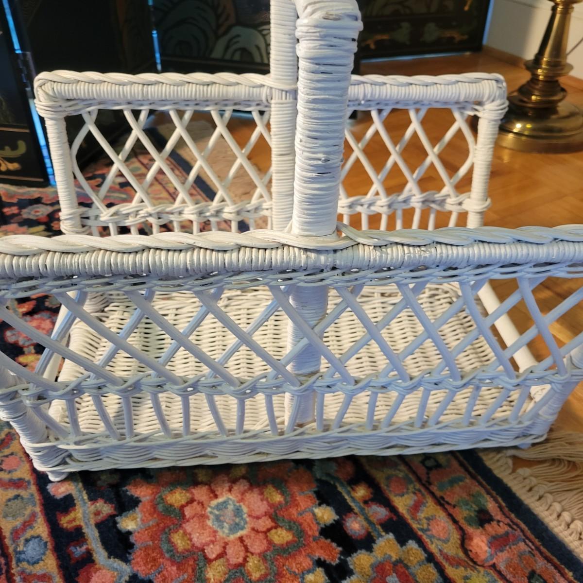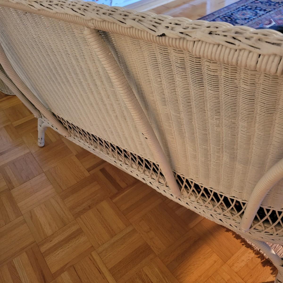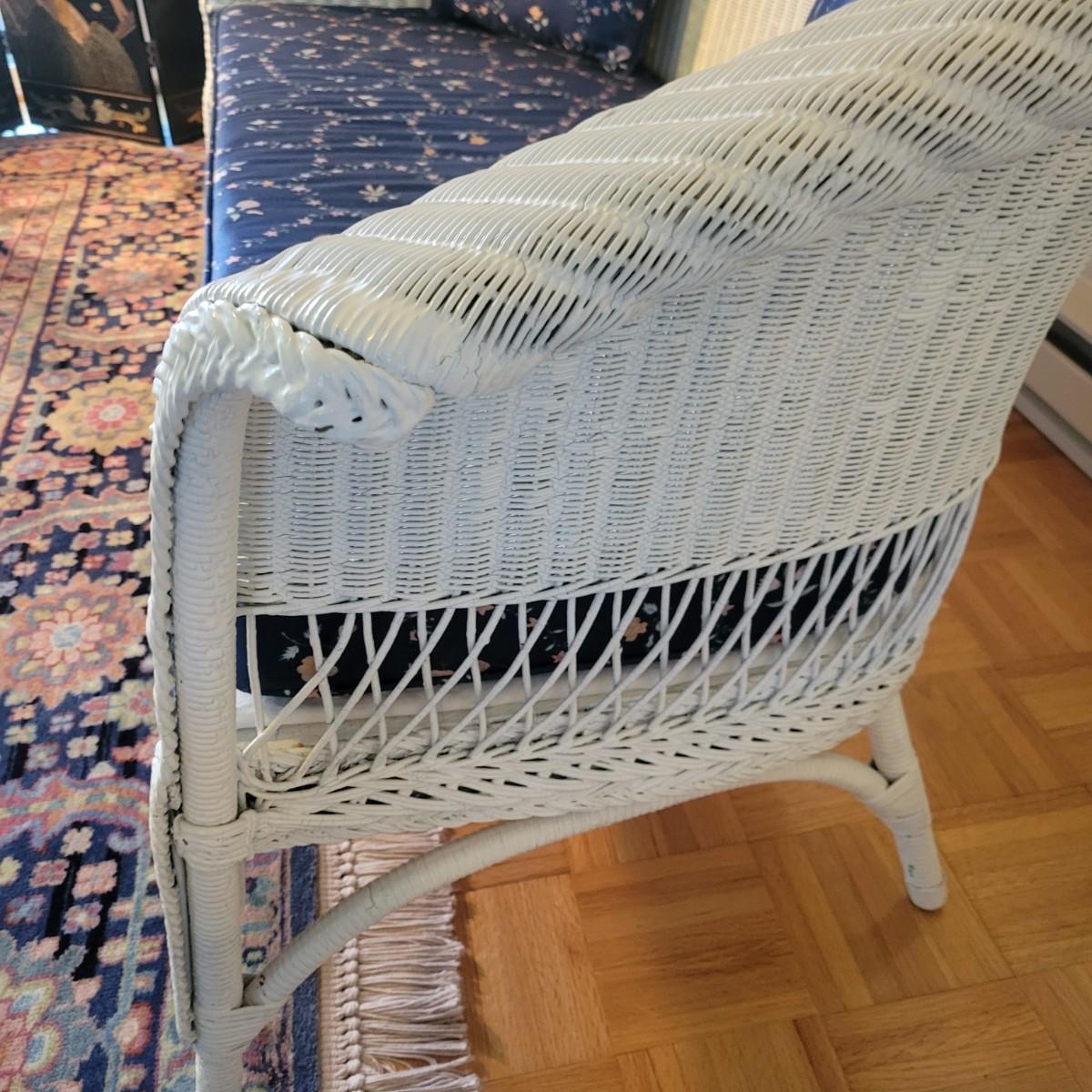 A wicker sofa and magazine rack in good condition with some minor blemishes. The sofa includes two accent pillows and a seat cushion that are dark blue with a floral pattern. Sofa measures approximately 58" x 24" x 32" with a seat height of 18". Magazine rack is also in good condition and matches sofa. A set of wicker rocking chairs with matching cushions is also found in this sale (Pair of Wicker Rocking Chairs and Cushions). Bid on both lots to win the matching set! Winning bidder should bring assistance as this item is bulky and needs to go up a flight of stairs. Local pickup only