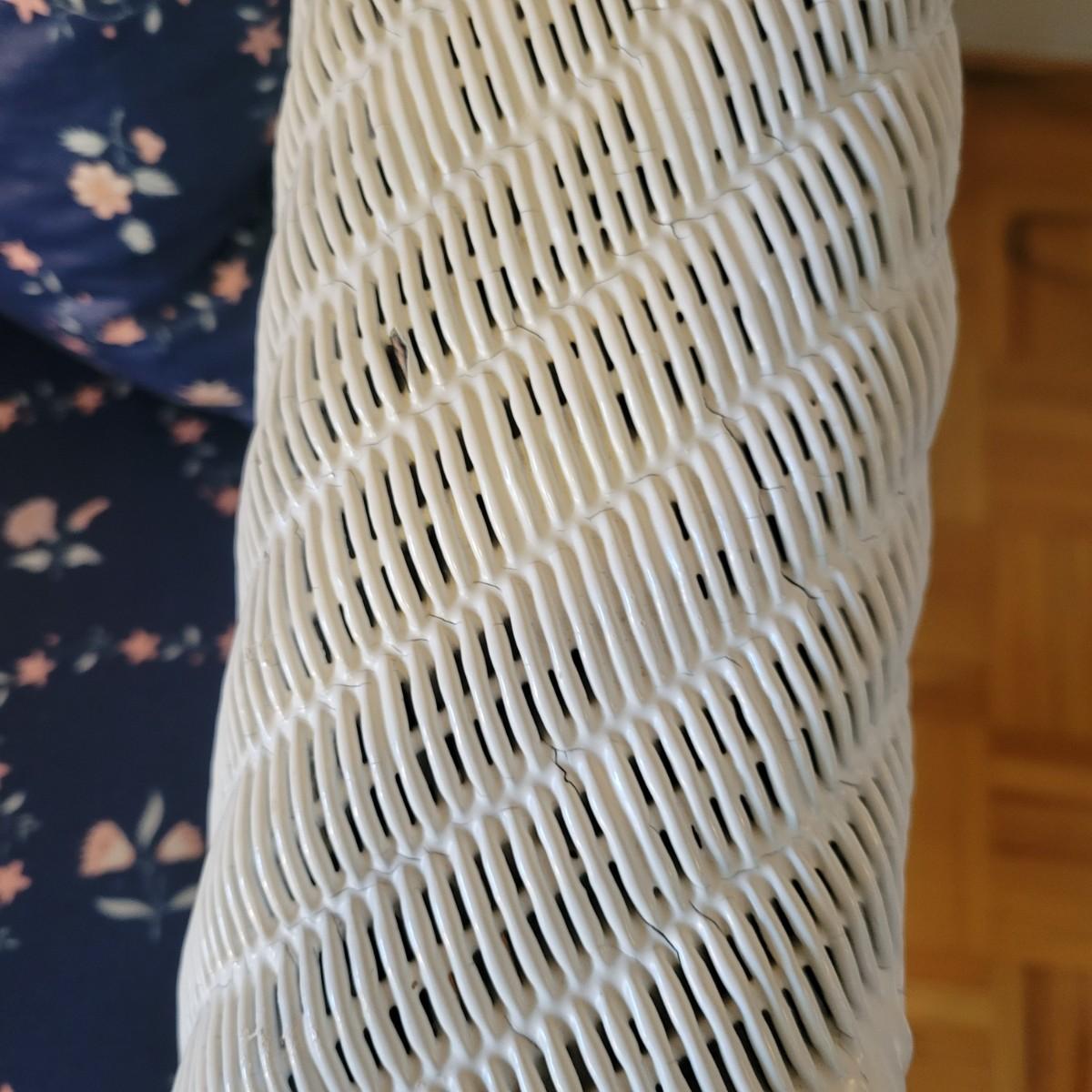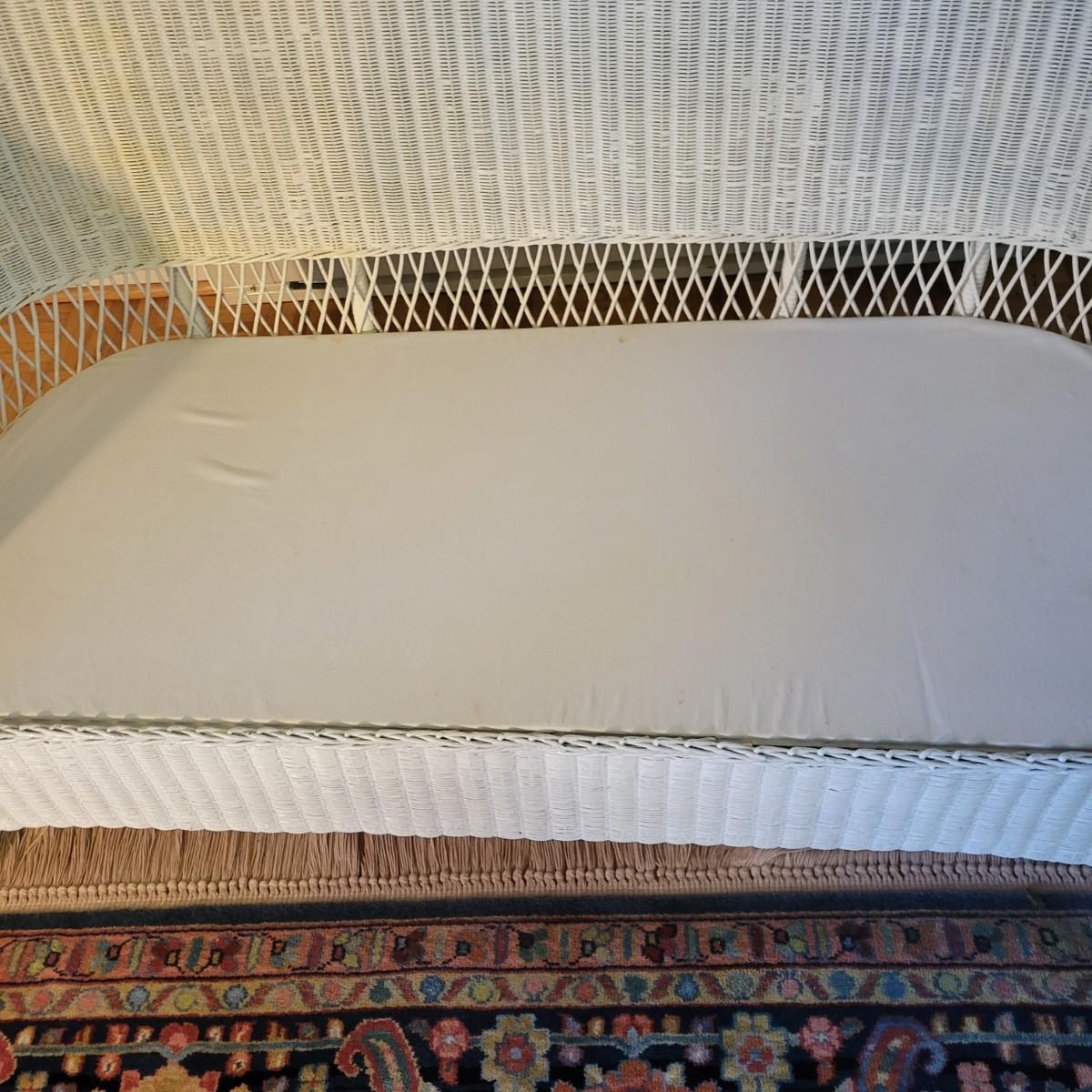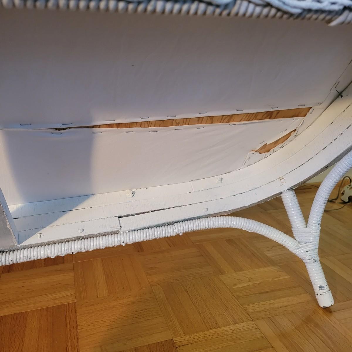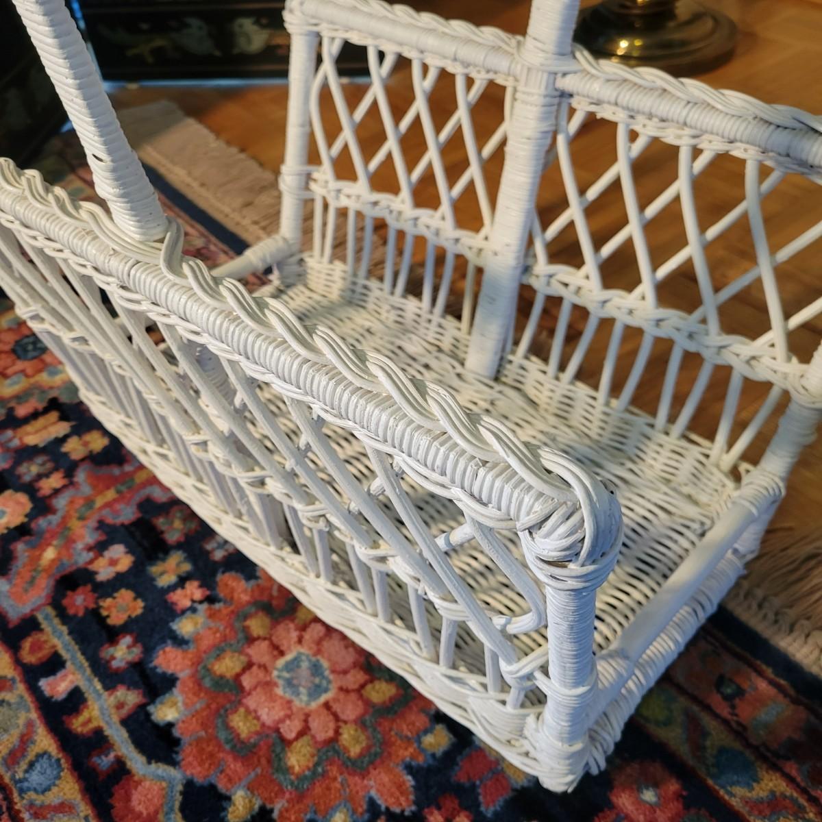A wicker sofa and magazine rack in good condition with some minor blemishes. The sofa includes two accent pillows and a seat cushion that are dark blue with a floral pattern. Sofa measures approximately 58" x 24" x 32" with a seat height of 18". Magazine rack is also in good condition and matches sofa. A set of wicker rocking chairs with matching cushions is also found in this sale (Pair of Wicker Rocking Chairs and Cushions). Bid on both lots to win the matching set! Winning bidder should bring assistance as this item is bulky and needs to go up a flight of stairs. Local pickup only