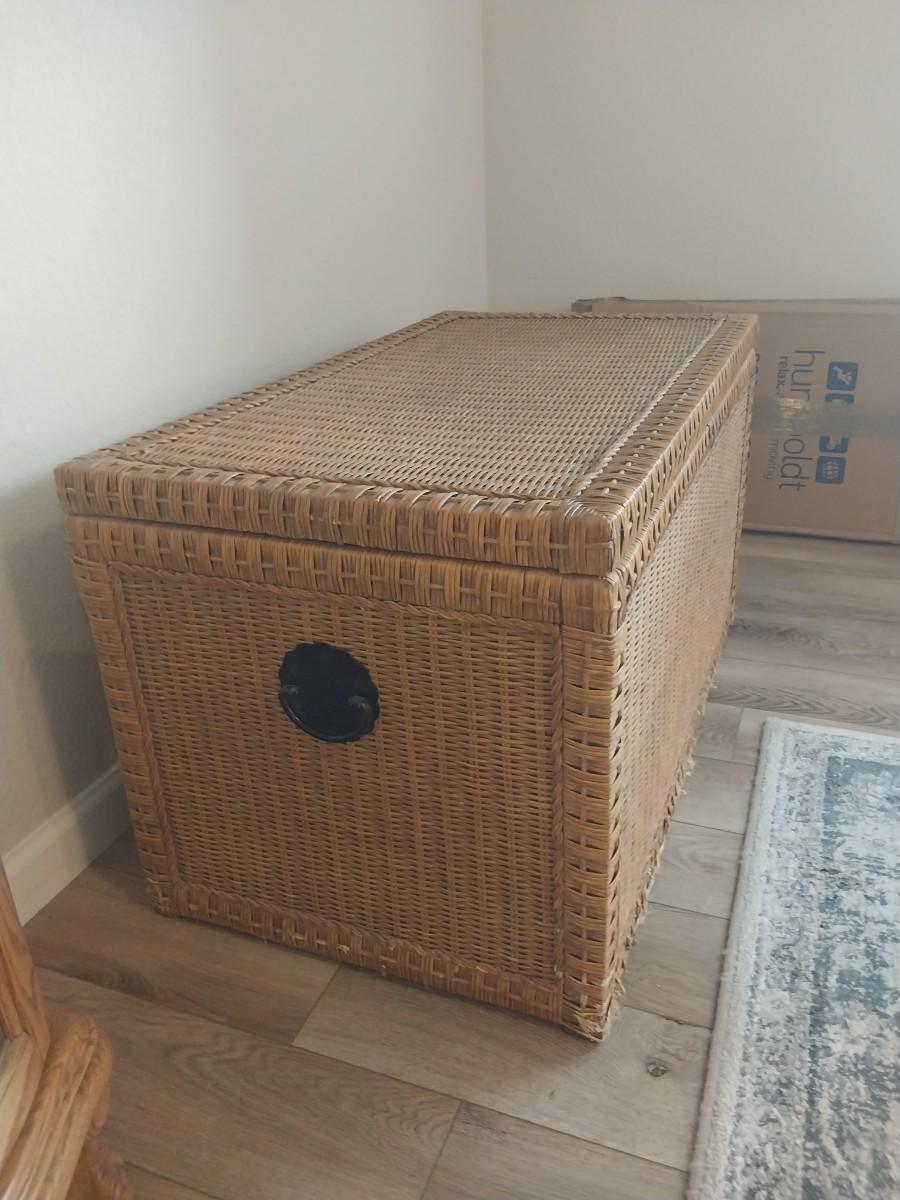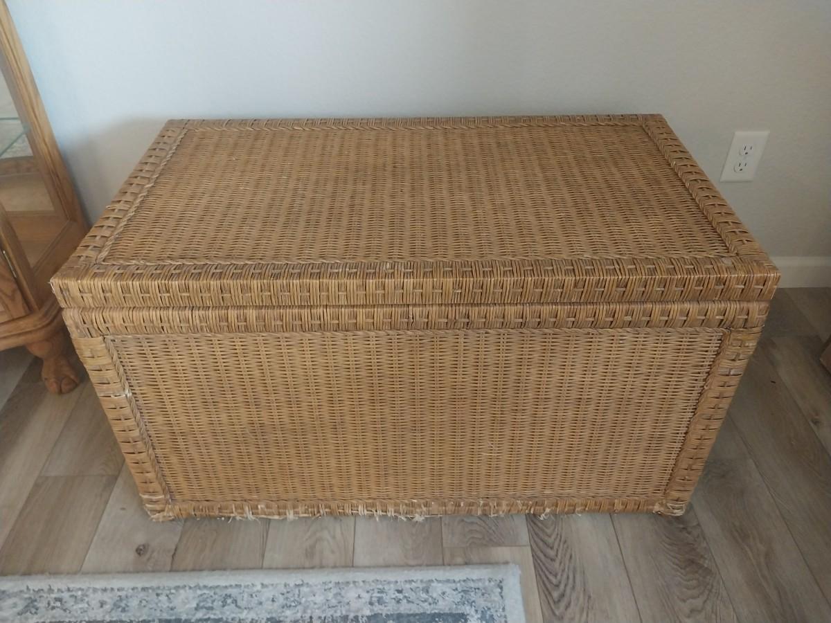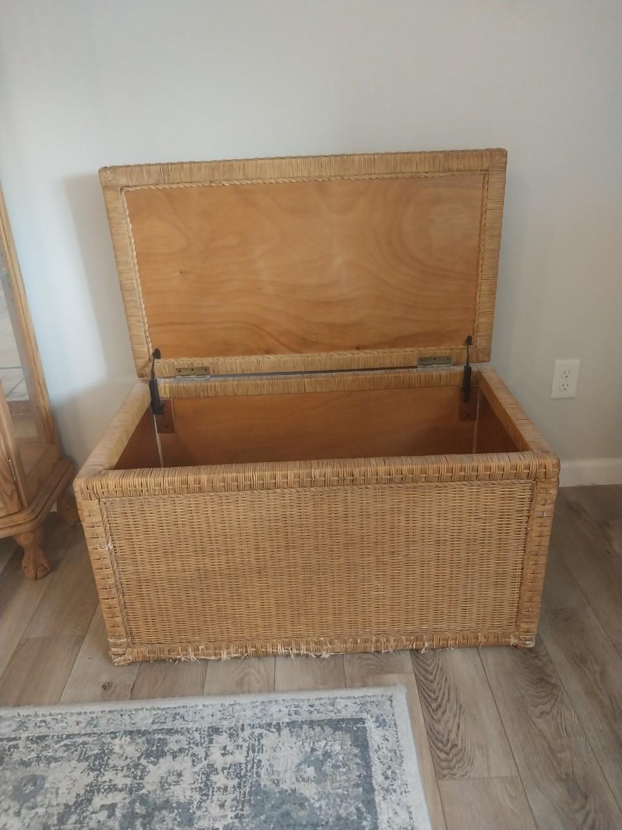 MEASURES 36X21X19 WOOD INSIDE, WORN ALONG BOTTOM BUT SOLID
