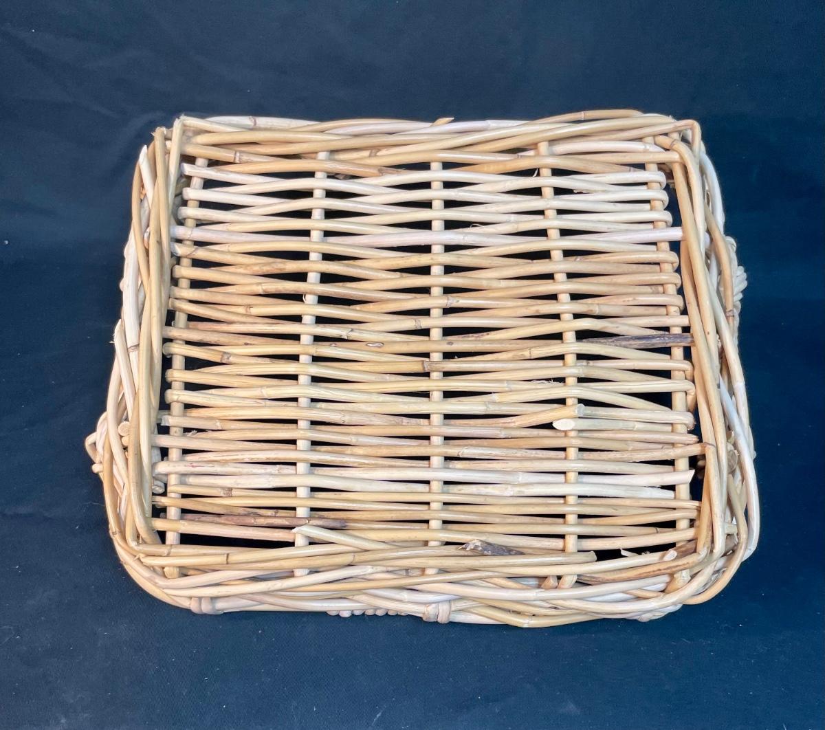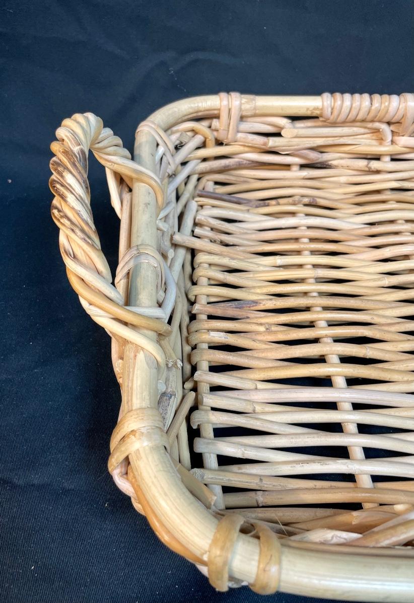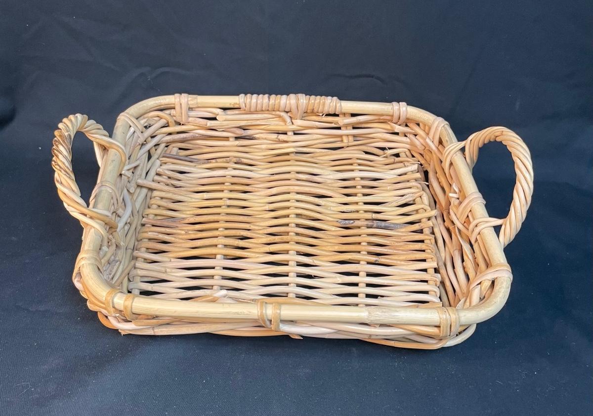 Solid, woven square wicker tray with handles. Approx. 13" x 16" in size.